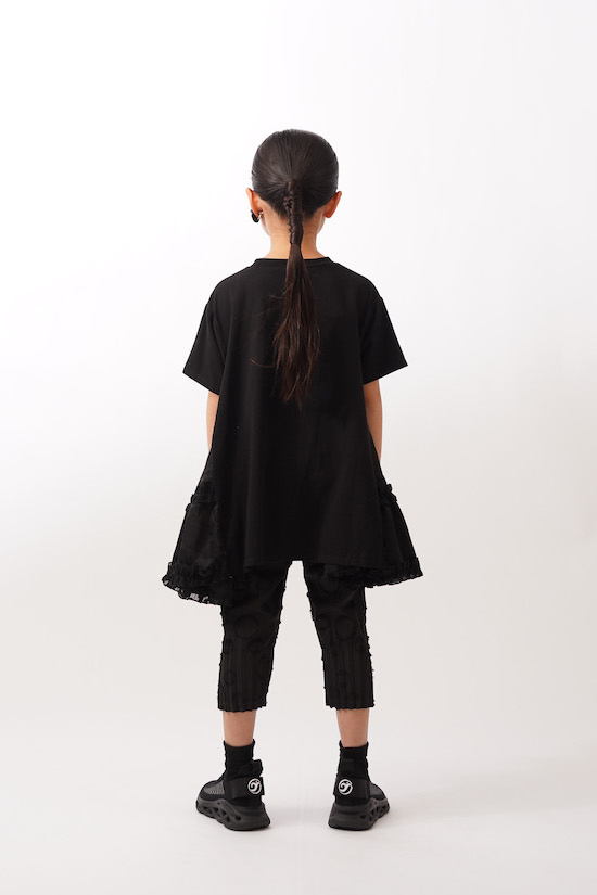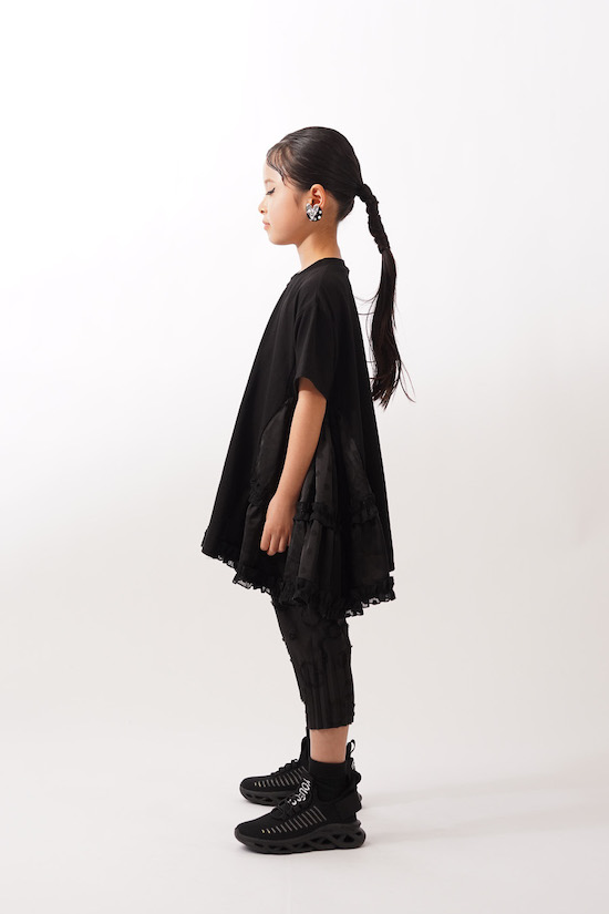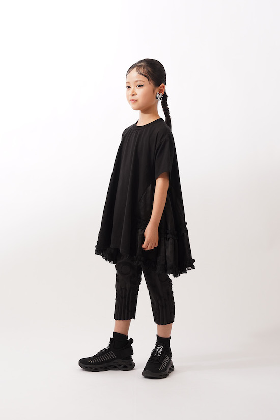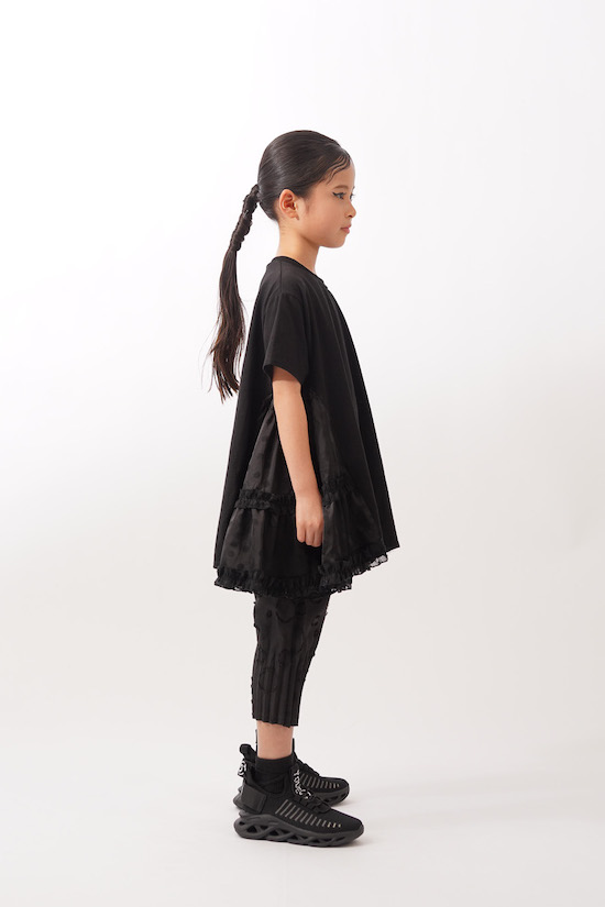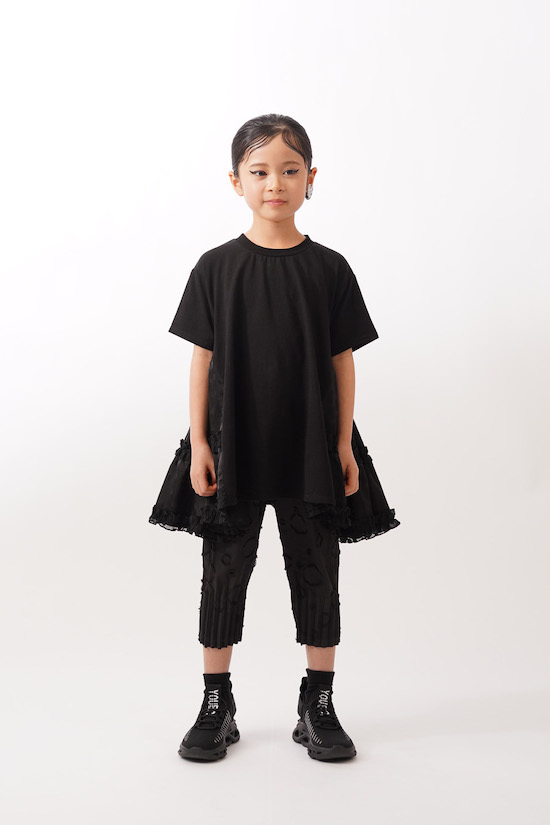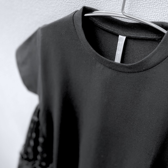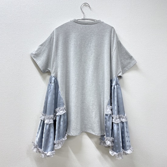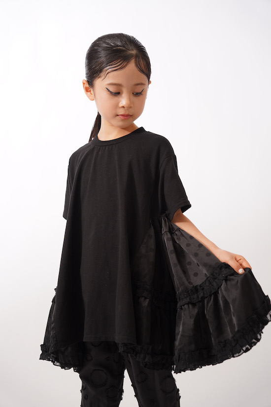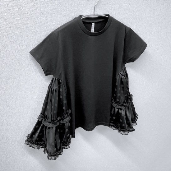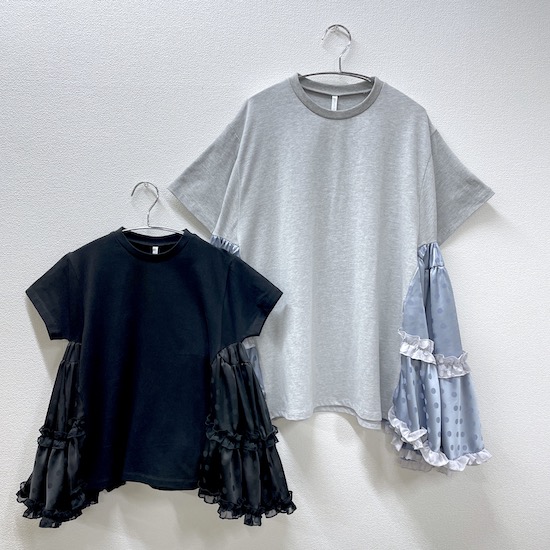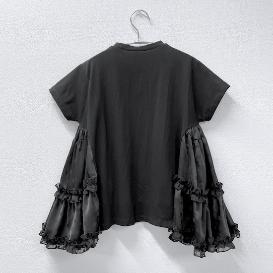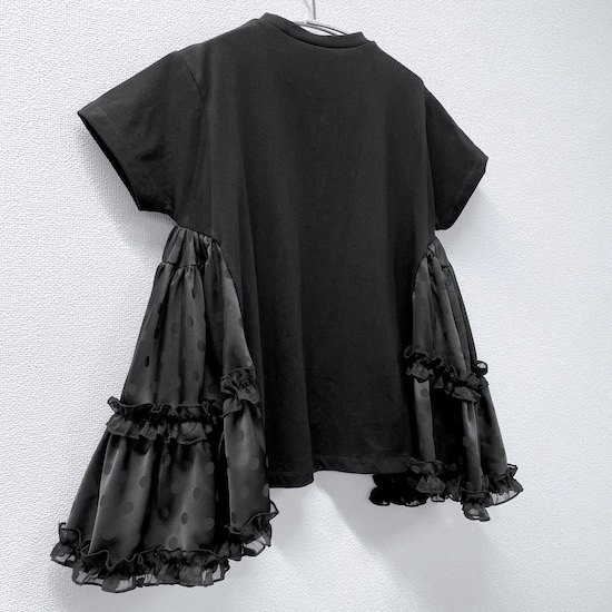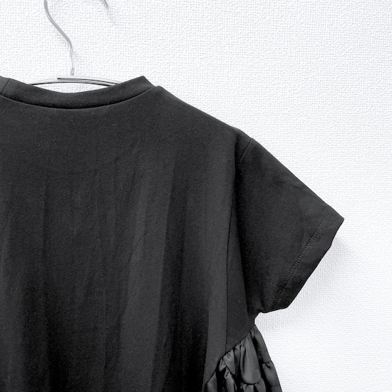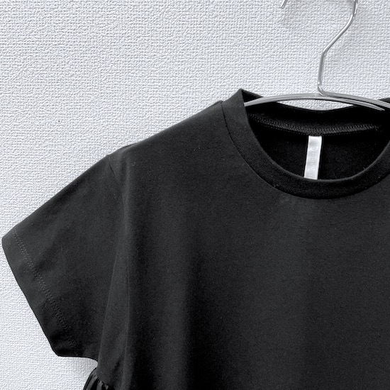 【素材】<本体>綿95% ポリウレタン5% <ネック部分>綿95% ポリウレタン5% <脇切替え部分>ポリエステル96%、ポリウレタン4% <フリル部分>ポリエステル100%