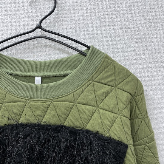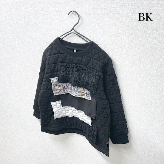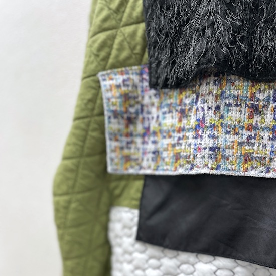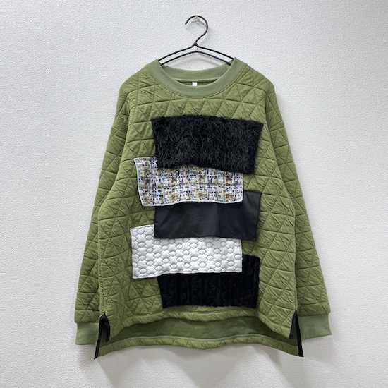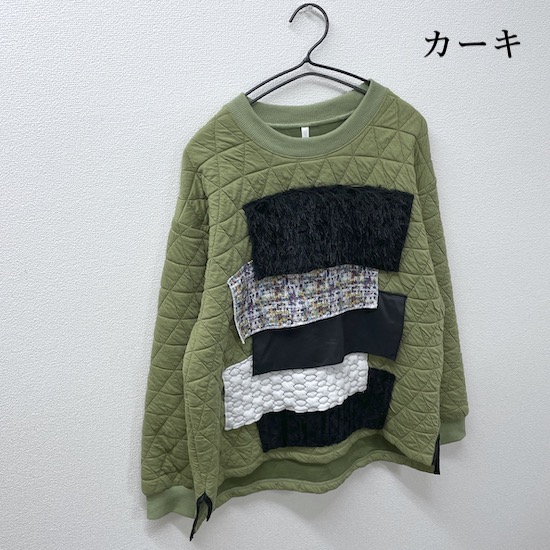 フロントに素材感の違う様々な生地を施したファブリックミックストレーナー。凹凸感のある生地や光沢感のあるサテン生地など、今シーズンのコレクションで使用する様々な生地をアクセントにしました。1枚着るだけでモードな印象に♪この秋冬オススメの1枚です。
