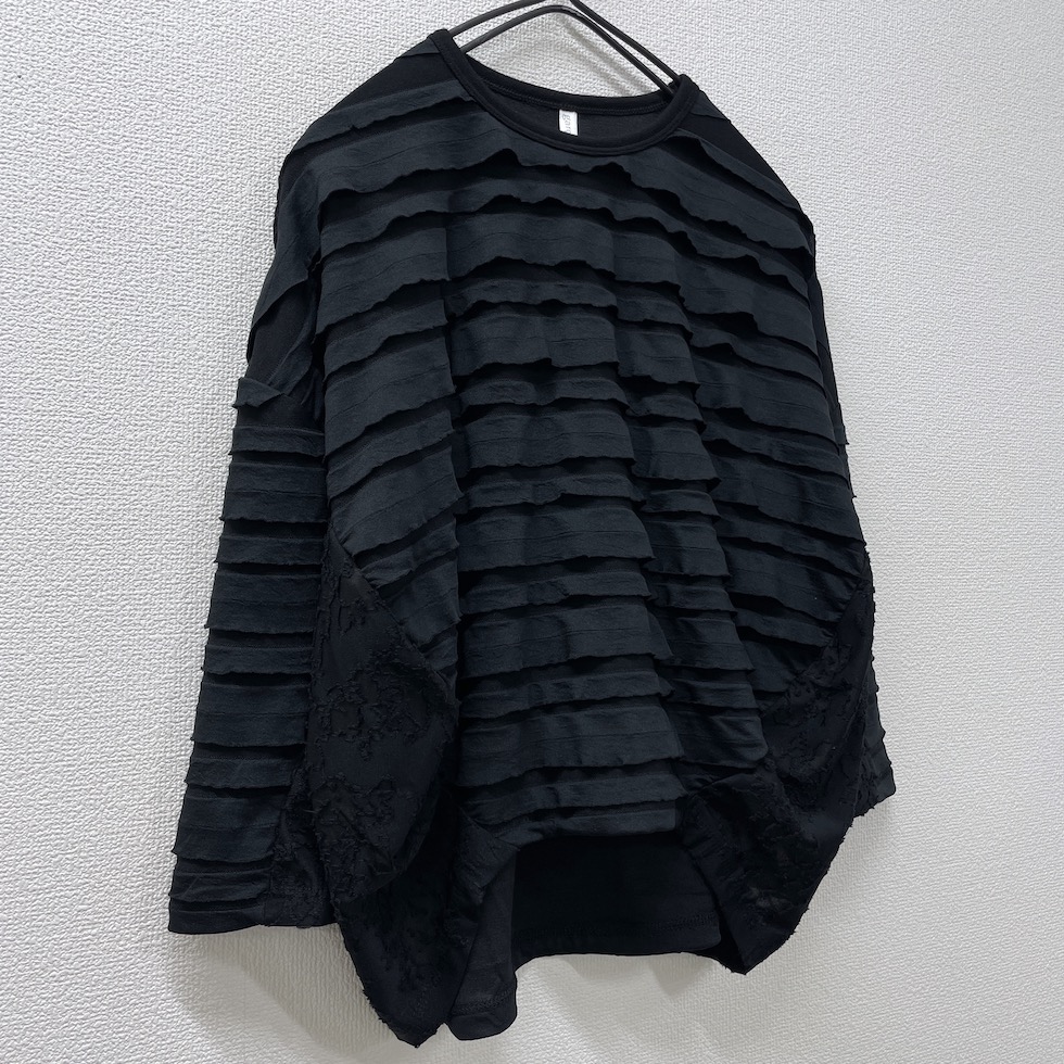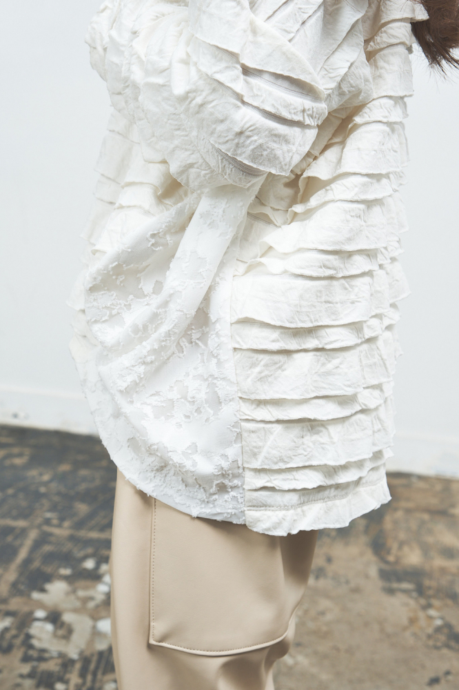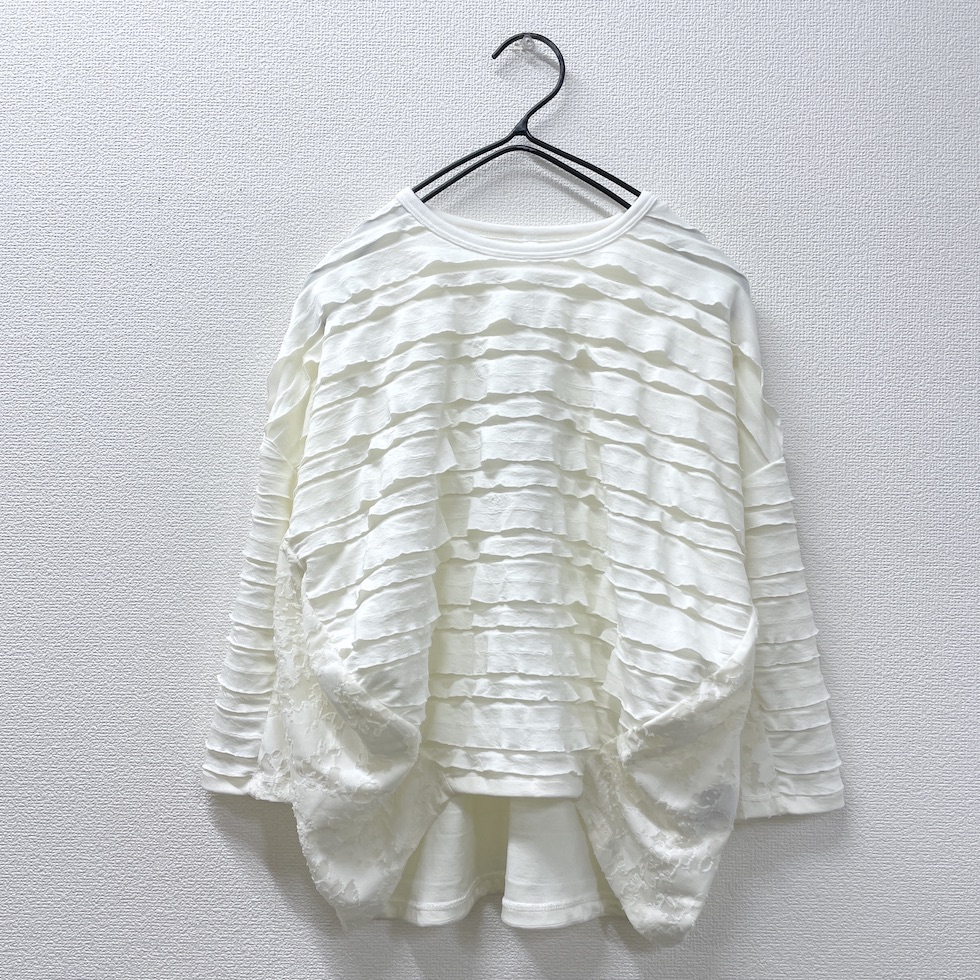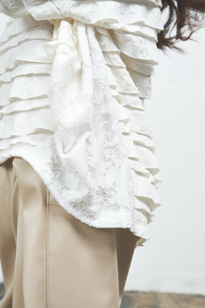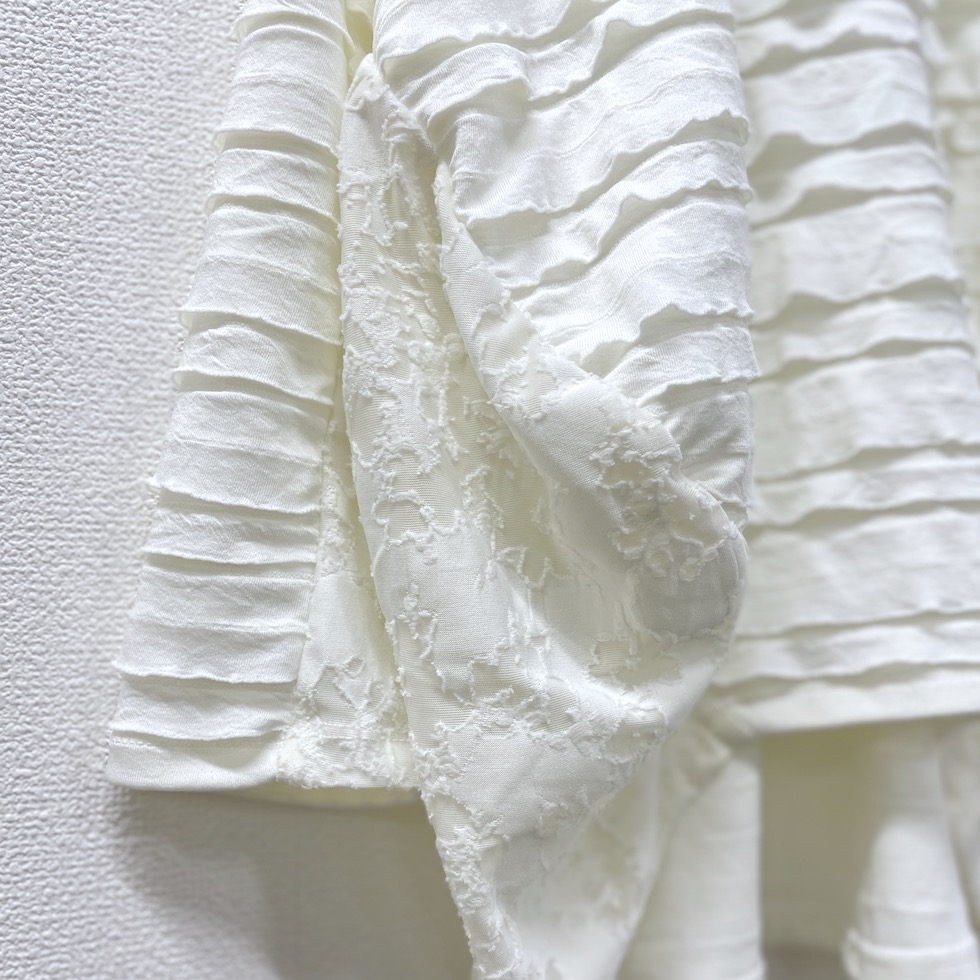 段々とした立体感が特徴の素材を全面に使用したバルーンシルエットのプルオーバー。袖から身頃にかけて程よくボリュームを持たせつつも、サイドを透け感のあるレーシージャガードで切り替えることで、抜け感と軽やかさをプラスしました。異素材の組み合わせが奥行きを生み、シンプルながらも印象的な一枚に仕上がっています。