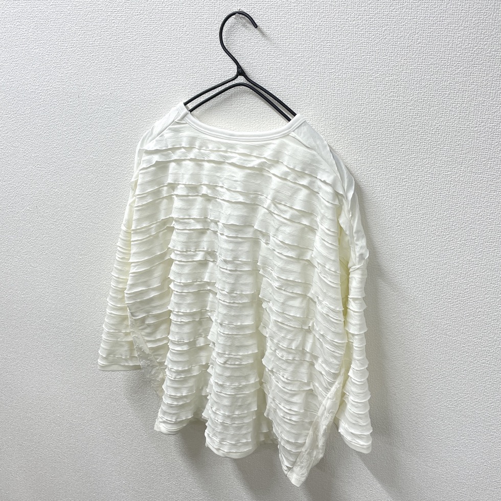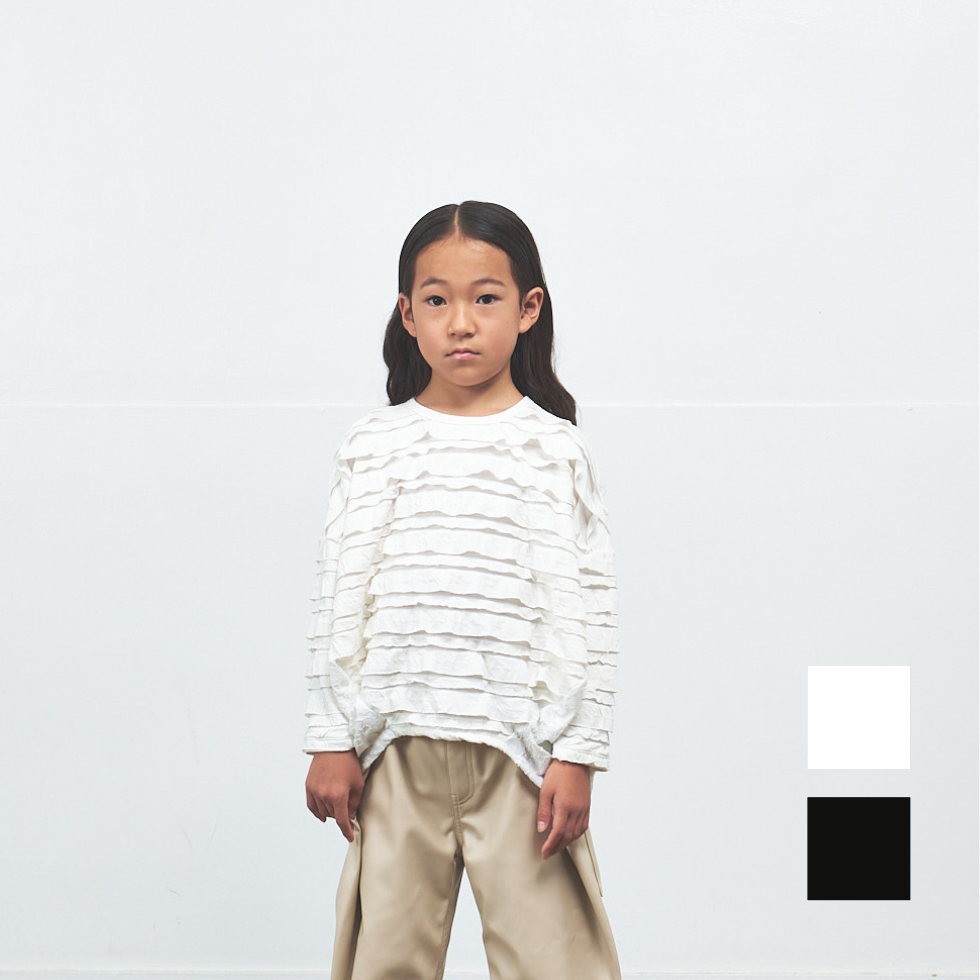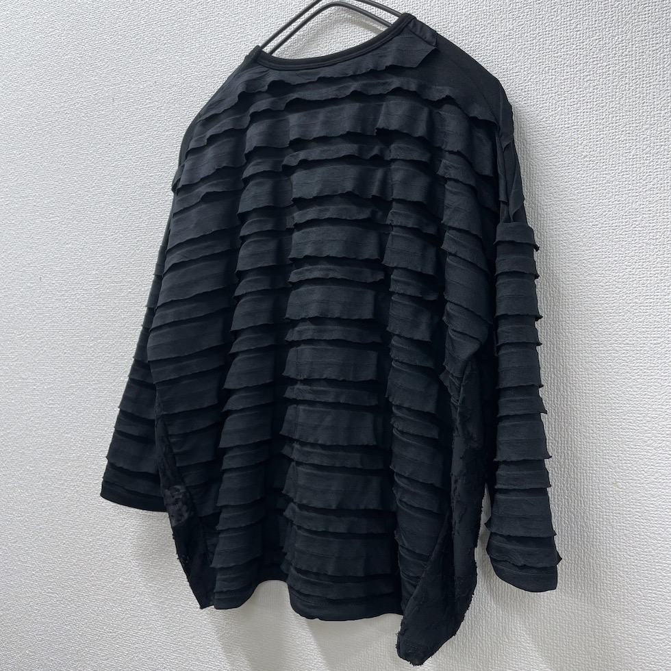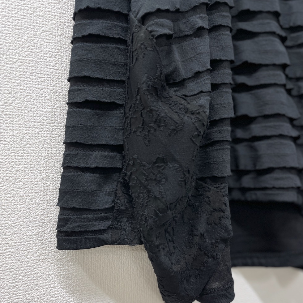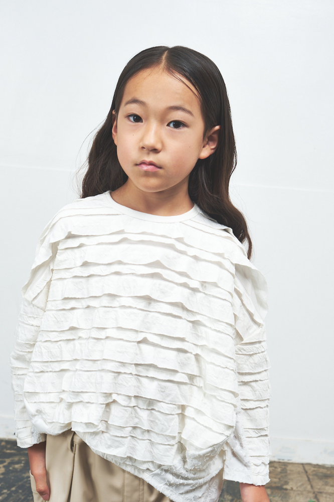 段々とした立体感が特徴の素材を全面に使用したバルーンシルエットのプルオーバー。袖から身頃にかけて程よくボリュームを持たせつつも、サイドを透け感のあるレーシージャガードで切り替えることで、抜け感と軽やかさをプラスしました。異素材の組み合わせが奥行きを生み、シンプルながらも印象的な一枚に仕上がっています。