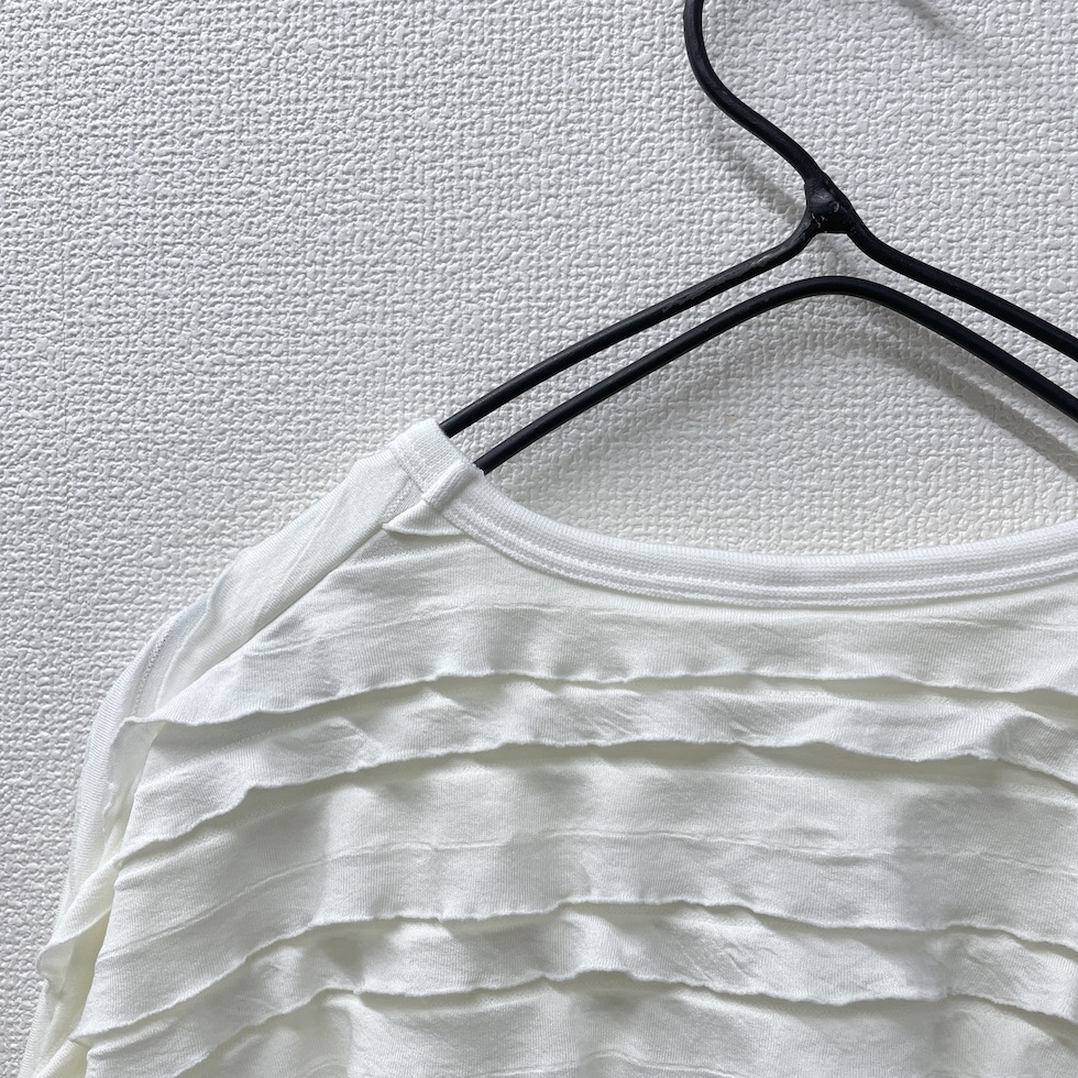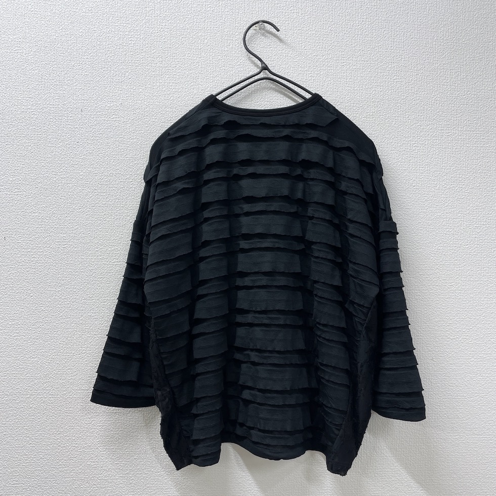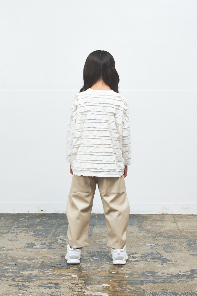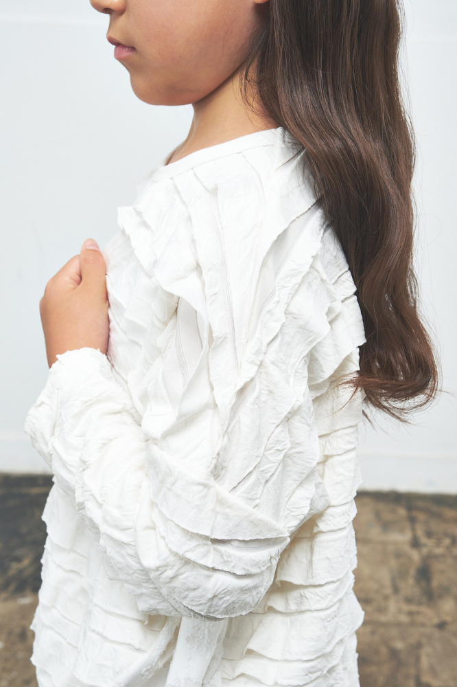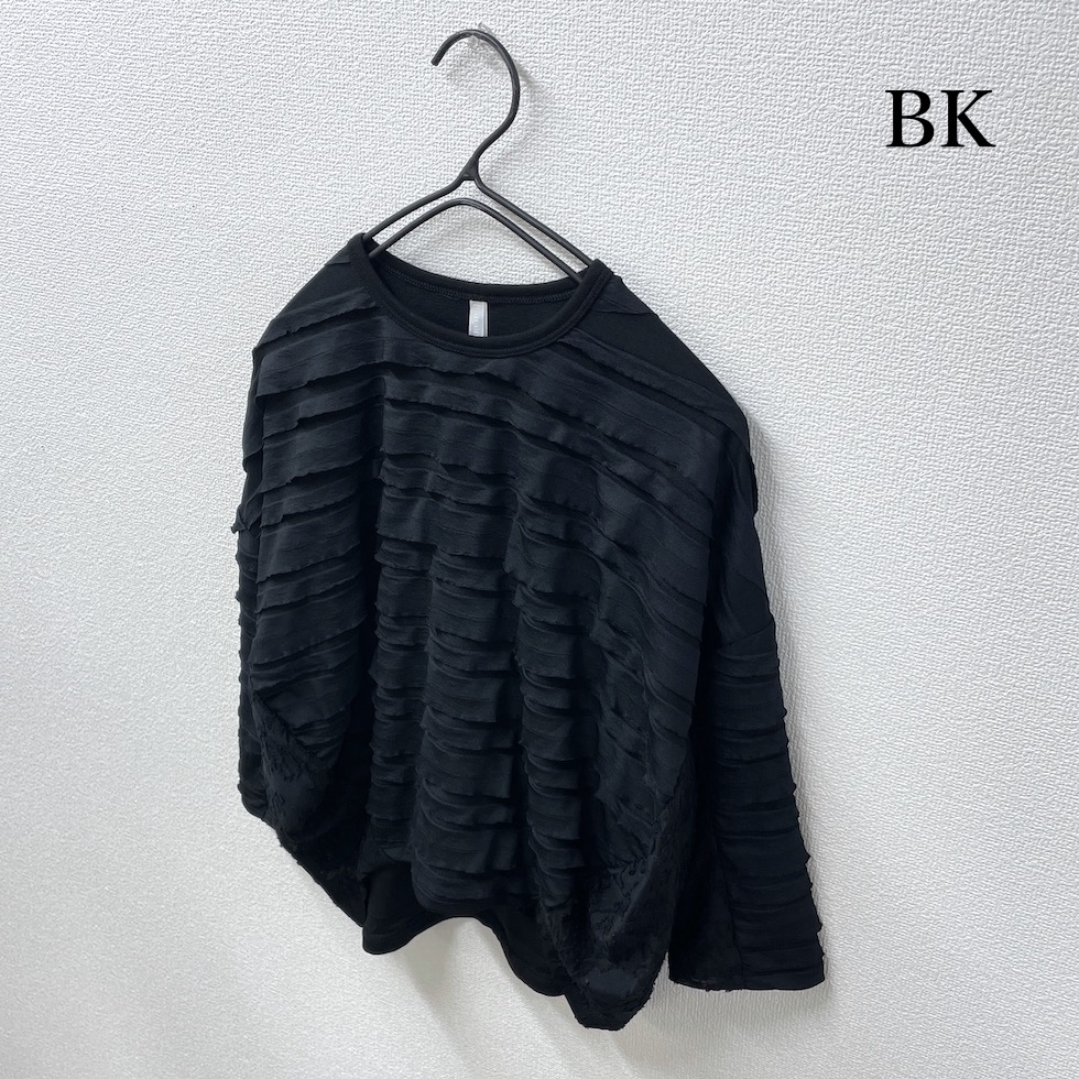 段々とした立体感が特徴の素材を全面に使用したバルーンシルエットのプルオーバー。袖から身頃にかけて程よくボリュームを持たせつつも、サイドを透け感のあるレーシージャガードで切り替えることで、抜け感と軽やかさをプラスしました。異素材の組み合わせが奥行きを生み、シンプルながらも印象的な一枚に仕上がっています。