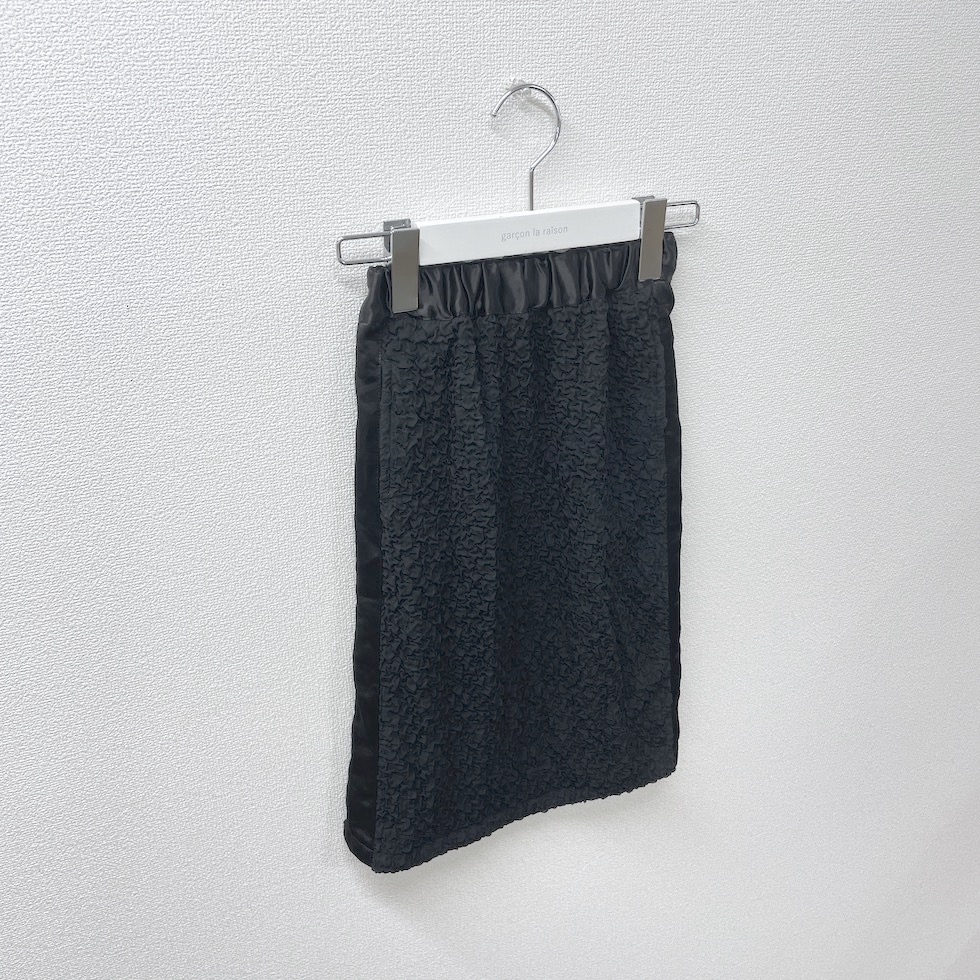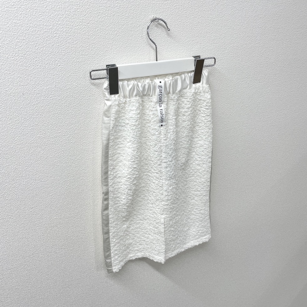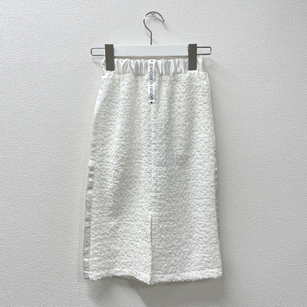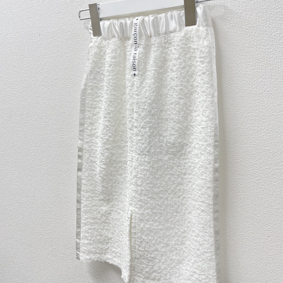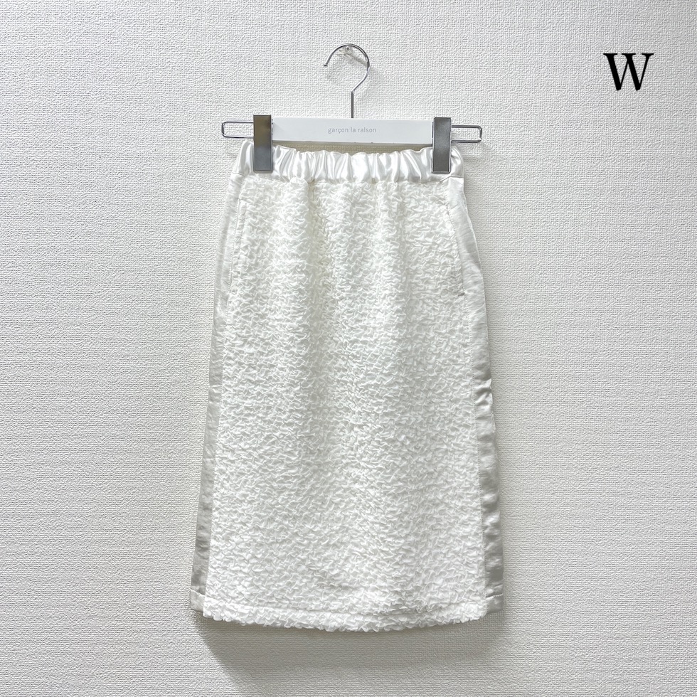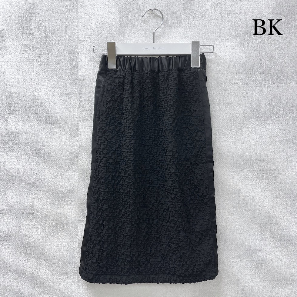 ふっくらと凹凸のあるフクレ素材を使用した、存在感たっぷりのサイドラインタイトスカート。両サイドには、光沢感のあるメタリックラインをあしらい、シンプルながらもエッジの効いたデザインに仕上げています。ストレートに落ちるシルエットが縦のラインを強調し、すっきり見せを叶えてくれます。ウエストはゴム仕様で快適な履き心地でありつつ、バックにはスリット入りで動きやすさも◎同じメタリックラインをあしらったトップスとのセットアップもおすすめです♪