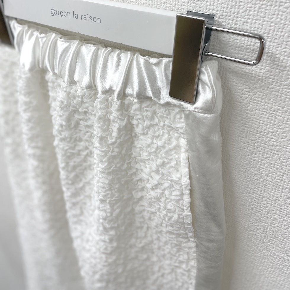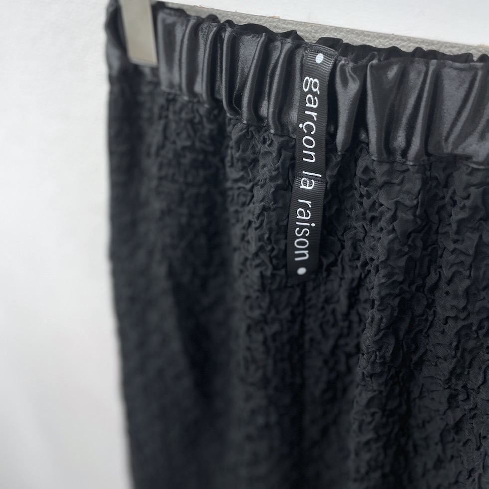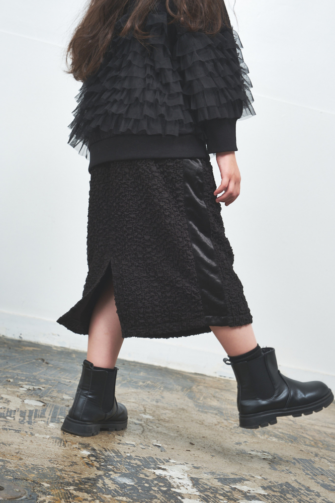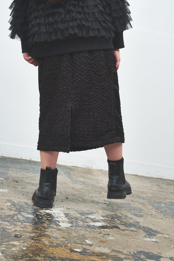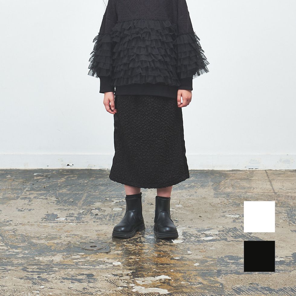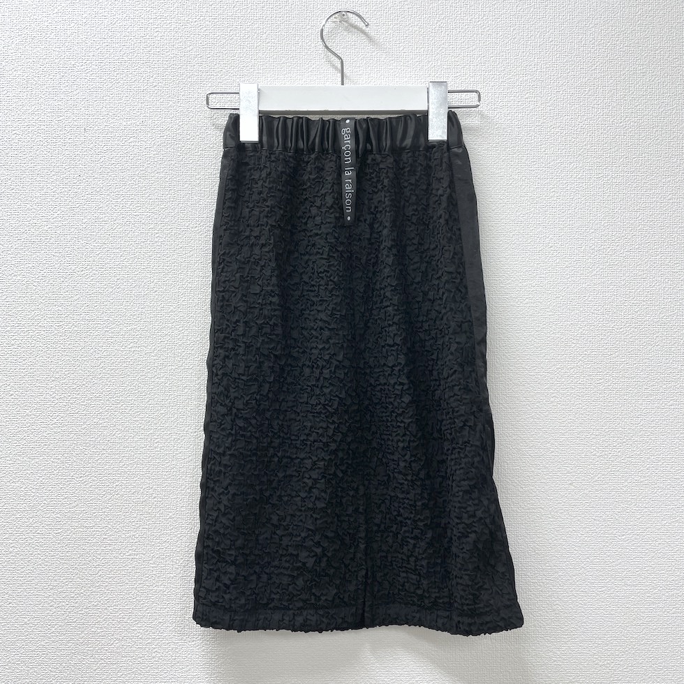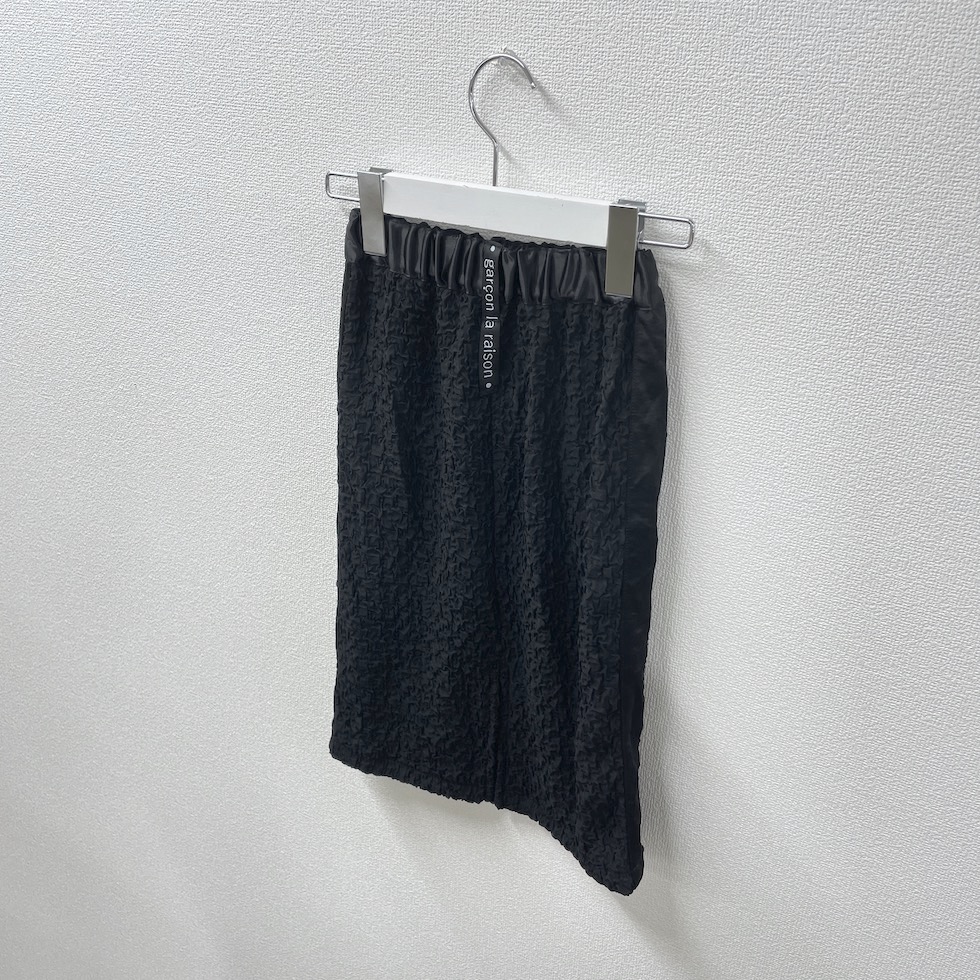 ふっくらと凹凸のあるフクレ素材を使用した、存在感たっぷりのサイドラインタイトスカート。両サイドには、光沢感のあるメタリックラインをあしらい、シンプルながらもエッジの効いたデザインに仕上げています。ストレートに落ちるシルエットが縦のラインを強調し、すっきり見せを叶えてくれます。ウエストはゴム仕様で快適な履き心地でありつつ、バックにはスリット入りで動きやすさも◎同じメタリックラインをあしらったトップスとのセットアップもおすすめです♪