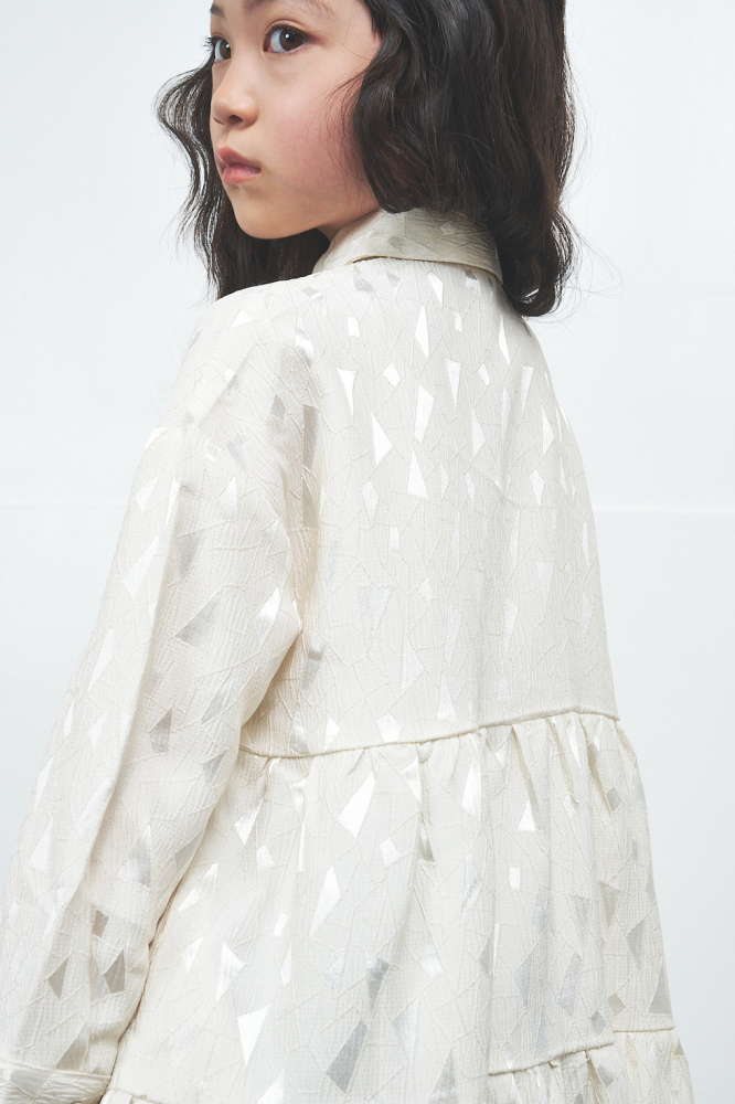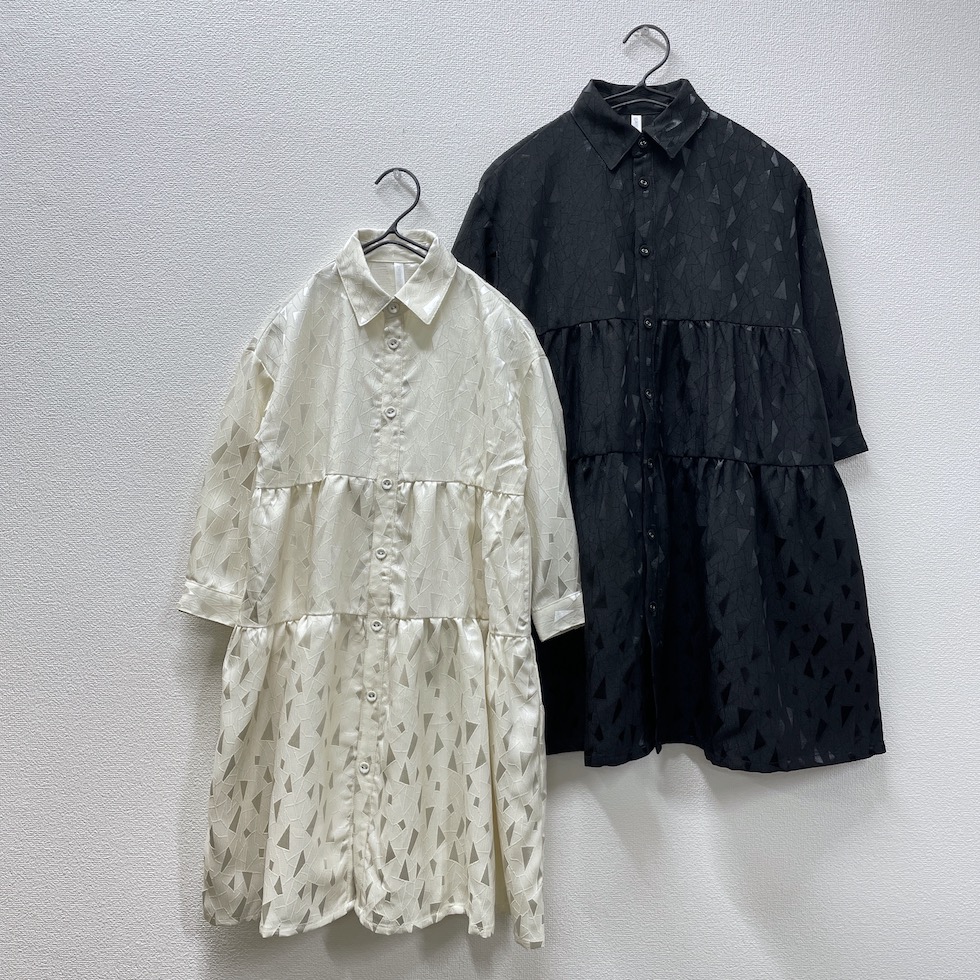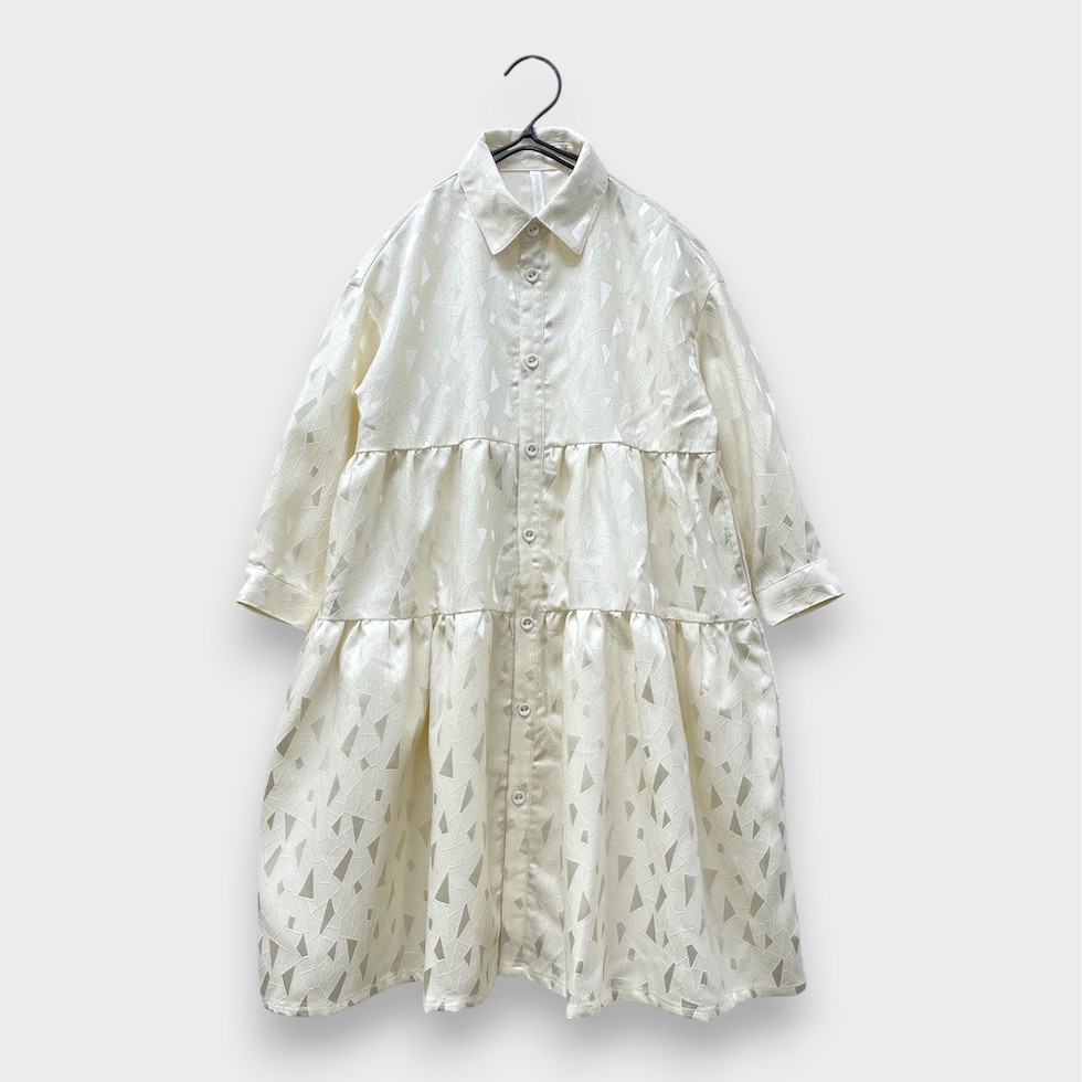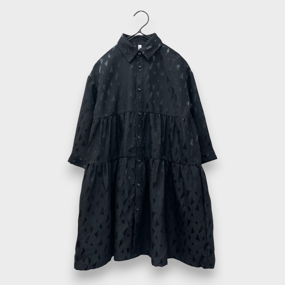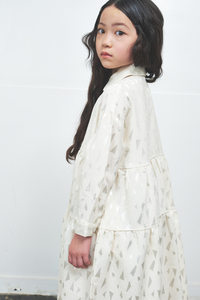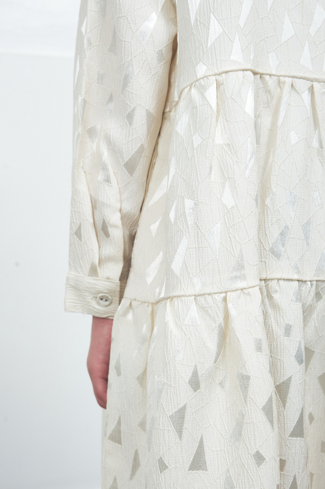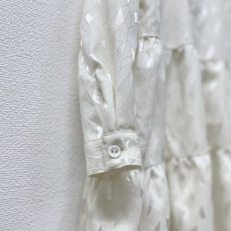 光沢のあるジオメトリック柄のジャガード素材を使用した、存在感のあるティアードワンピース。グラフィカルな柄の光沢が、程よいモード感と奥行きを演出します。