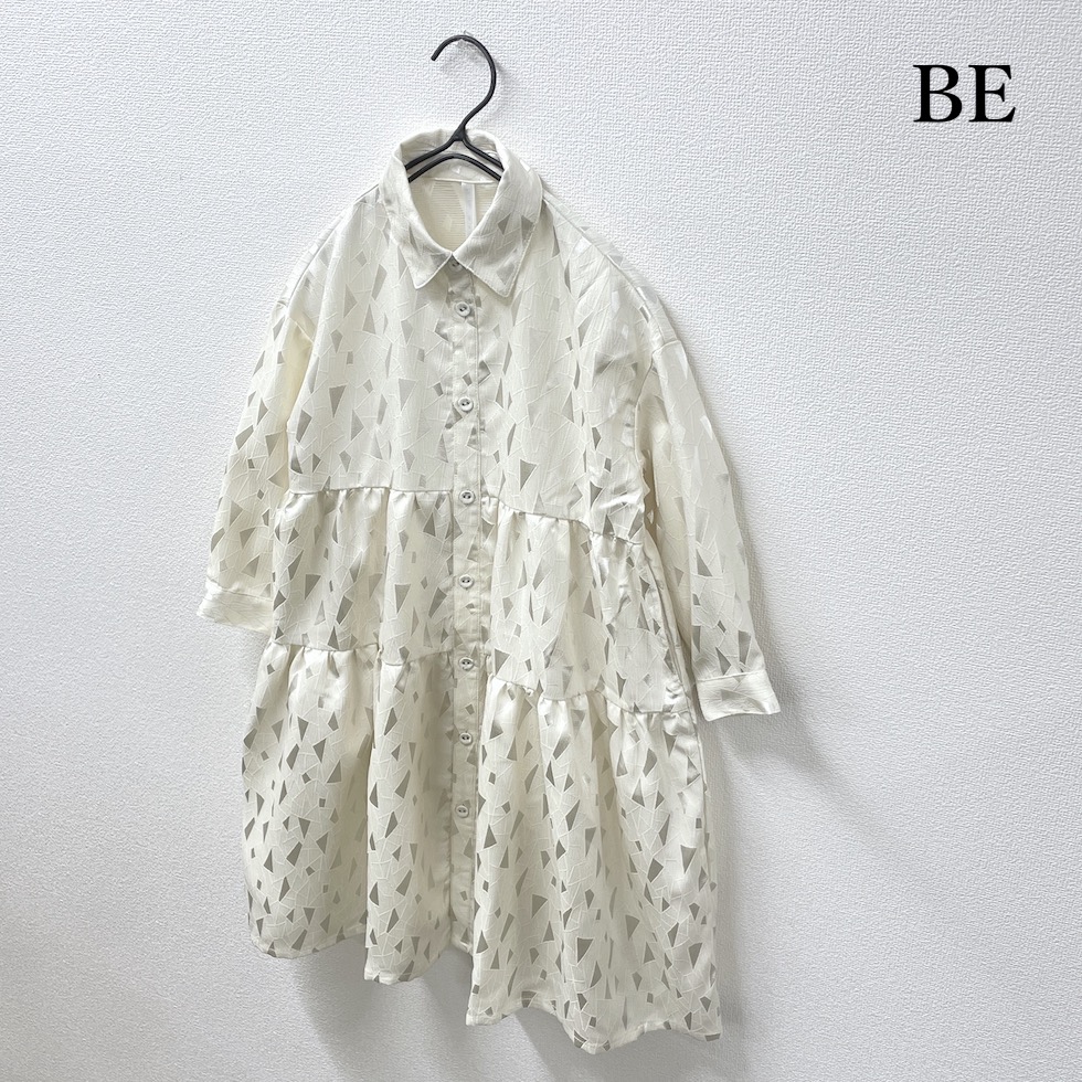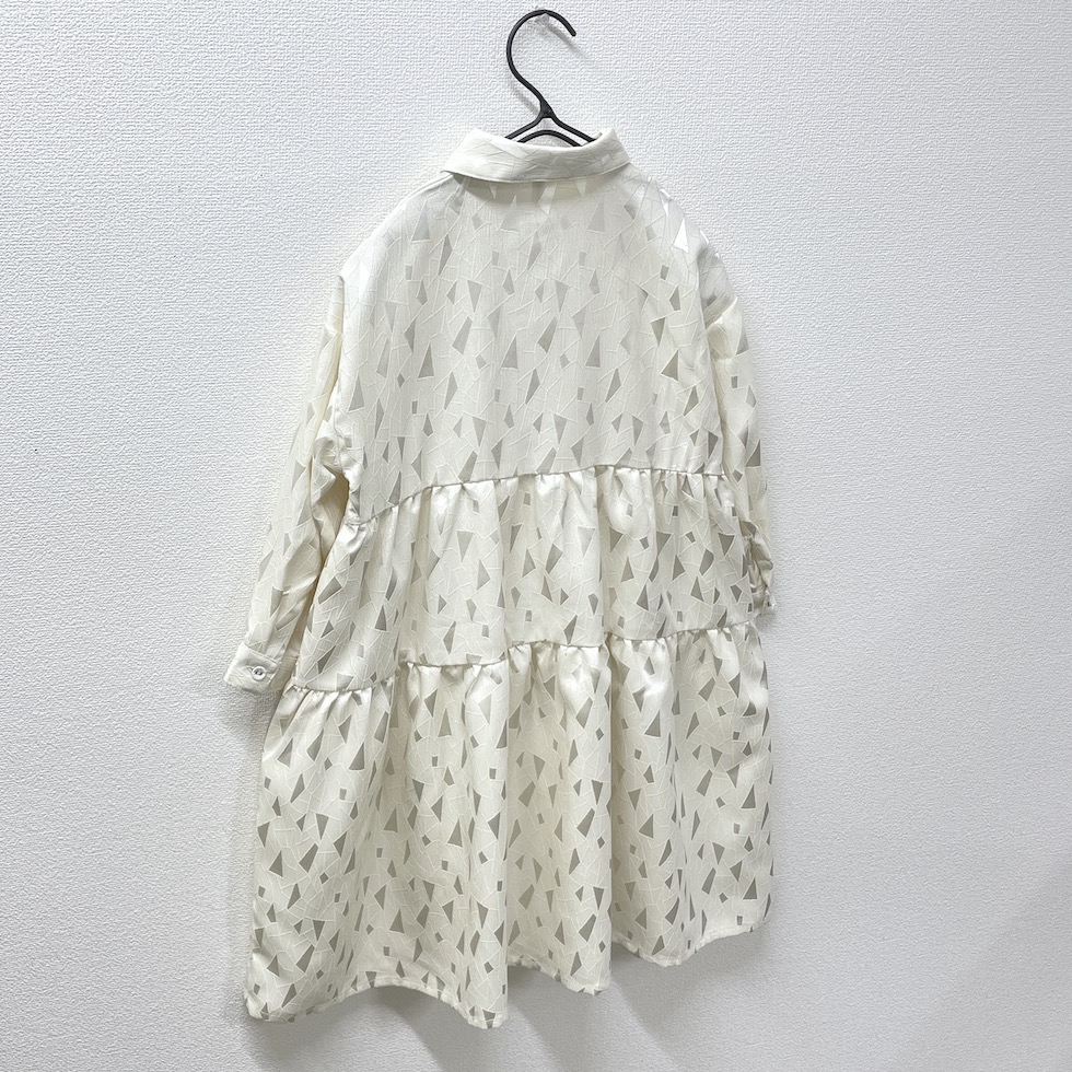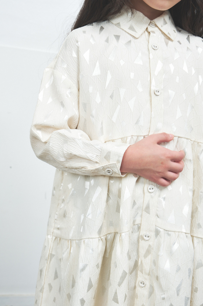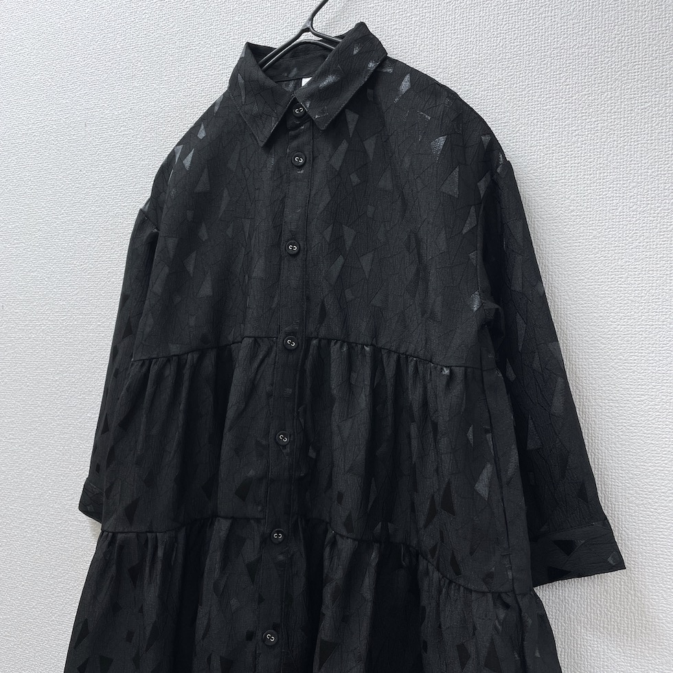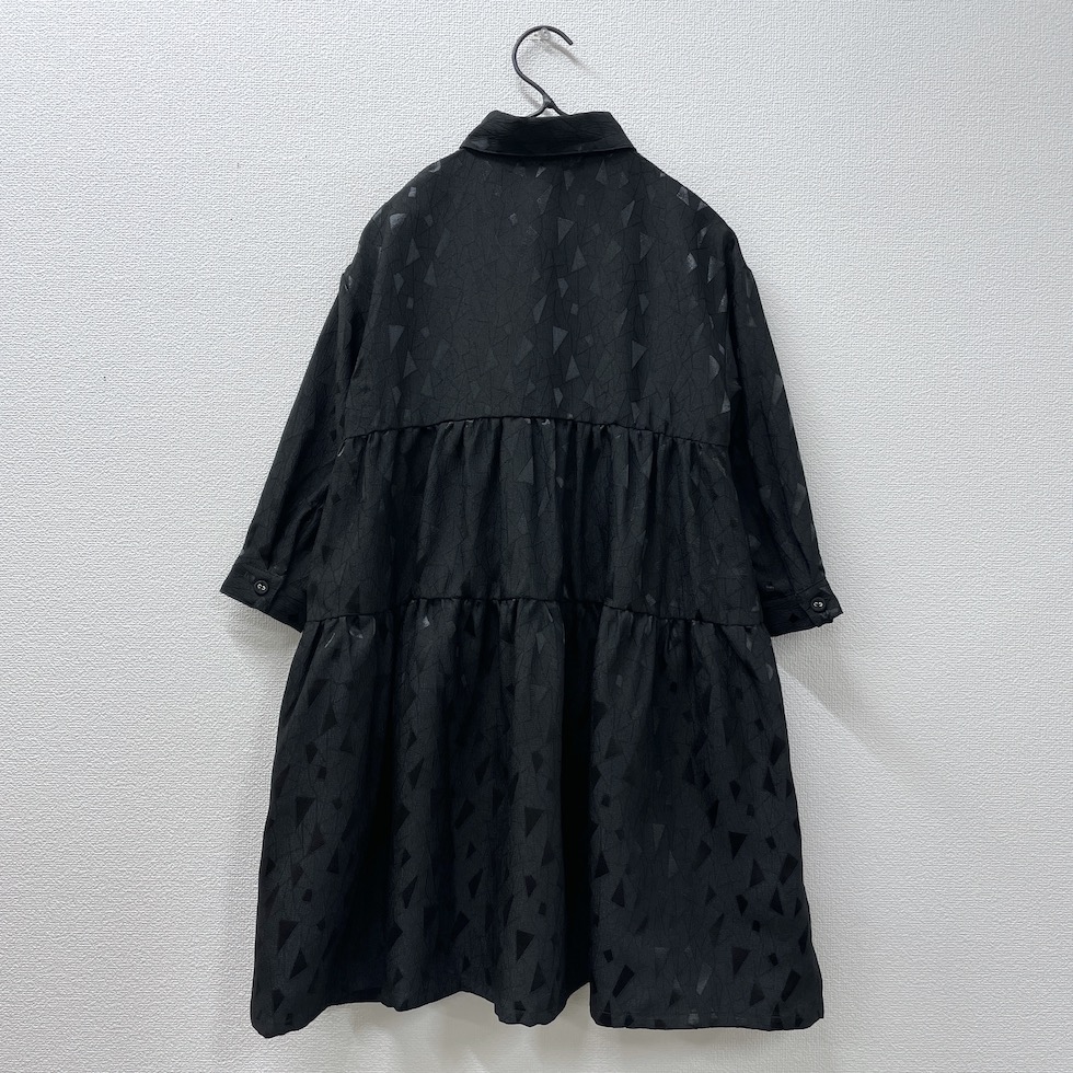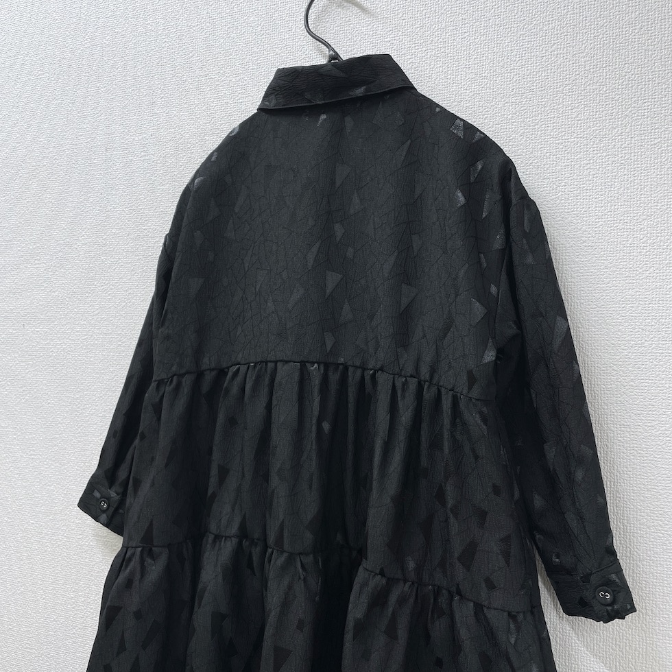 光沢のあるジオメトリック柄のジャガード素材を使用した、存在感のあるティアードワンピース。グラフィカルな柄の光沢が、程よいモード感と奥行きを演出します。
