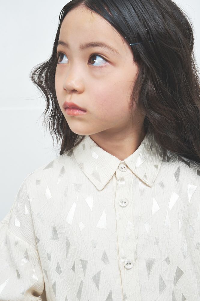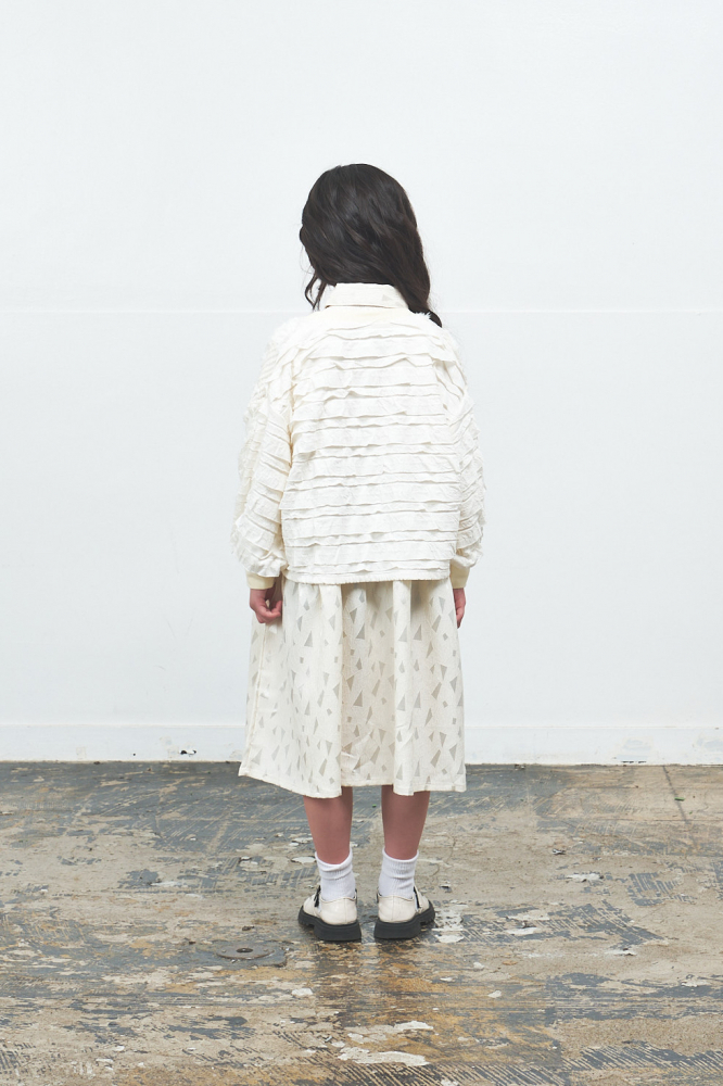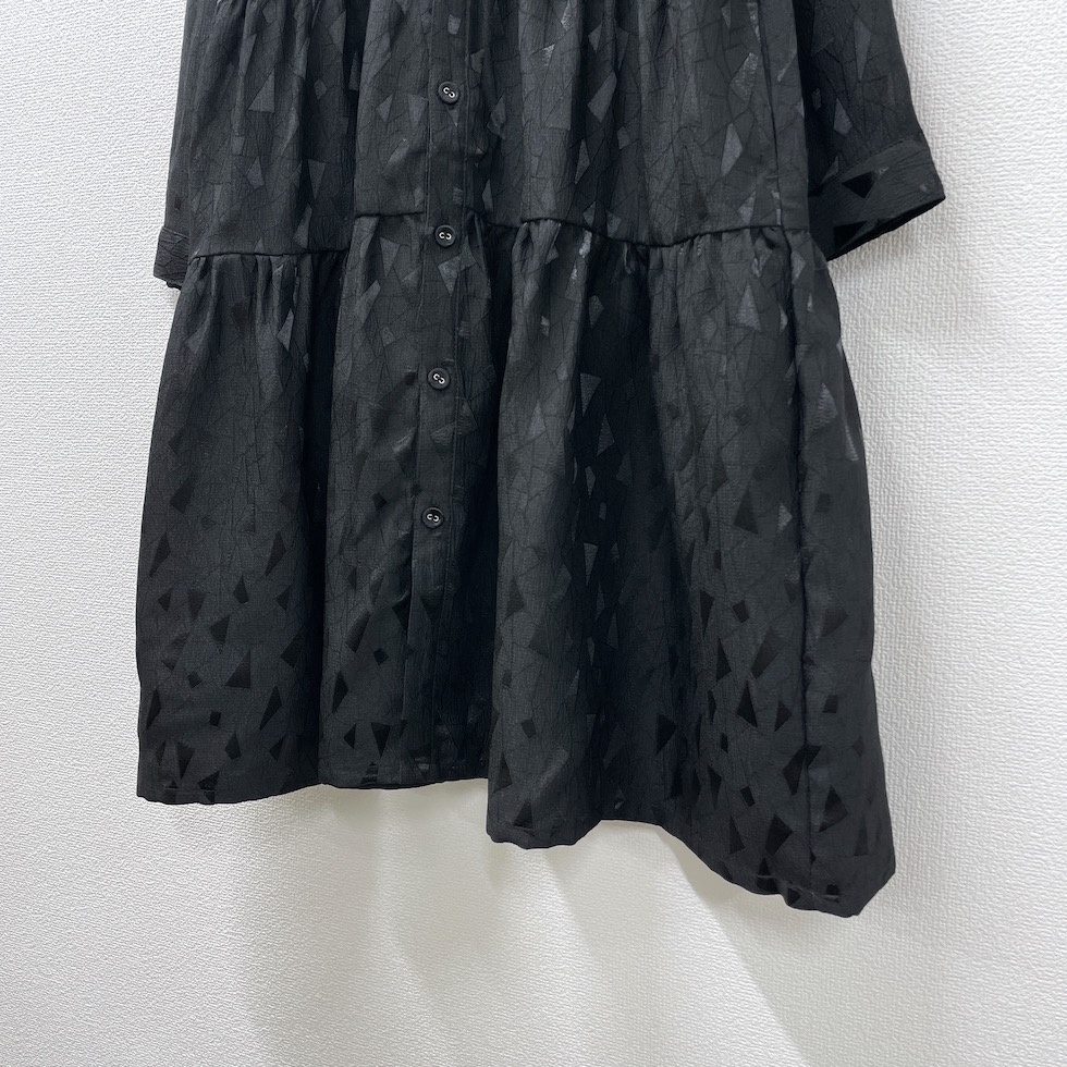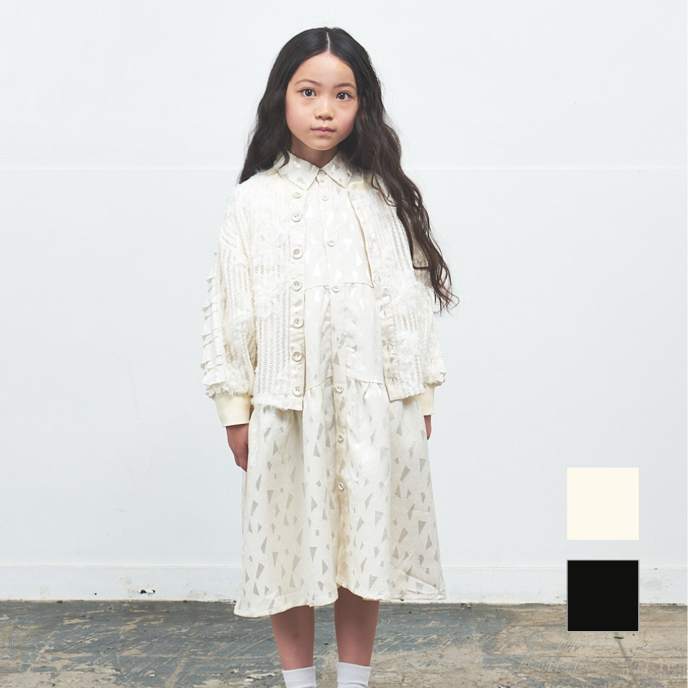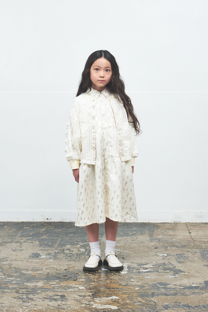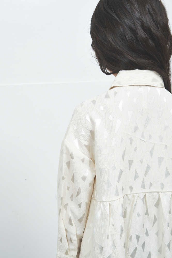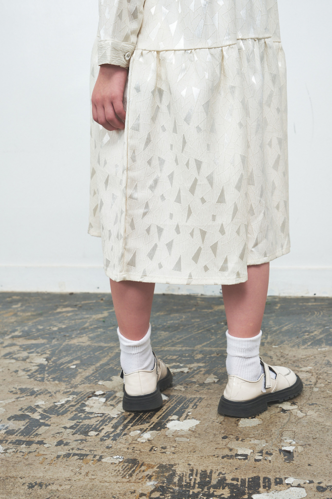 光沢のあるジオメトリック柄のジャガード素材を使用した、存在感のあるティアードワンピース。グラフィカルな柄の光沢が、程よいモード感と奥行きを演出します。