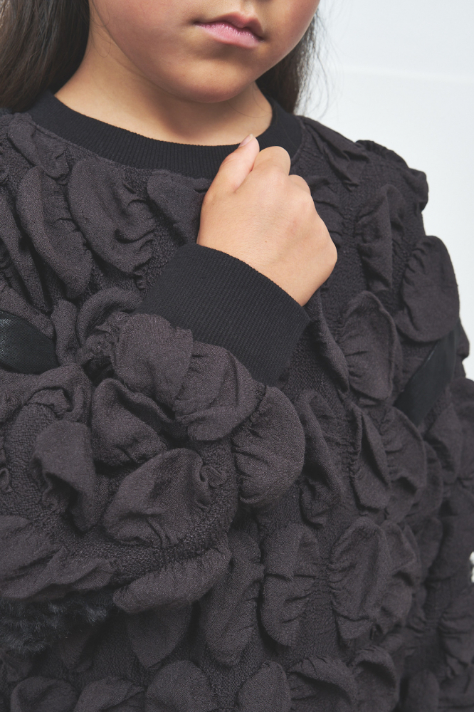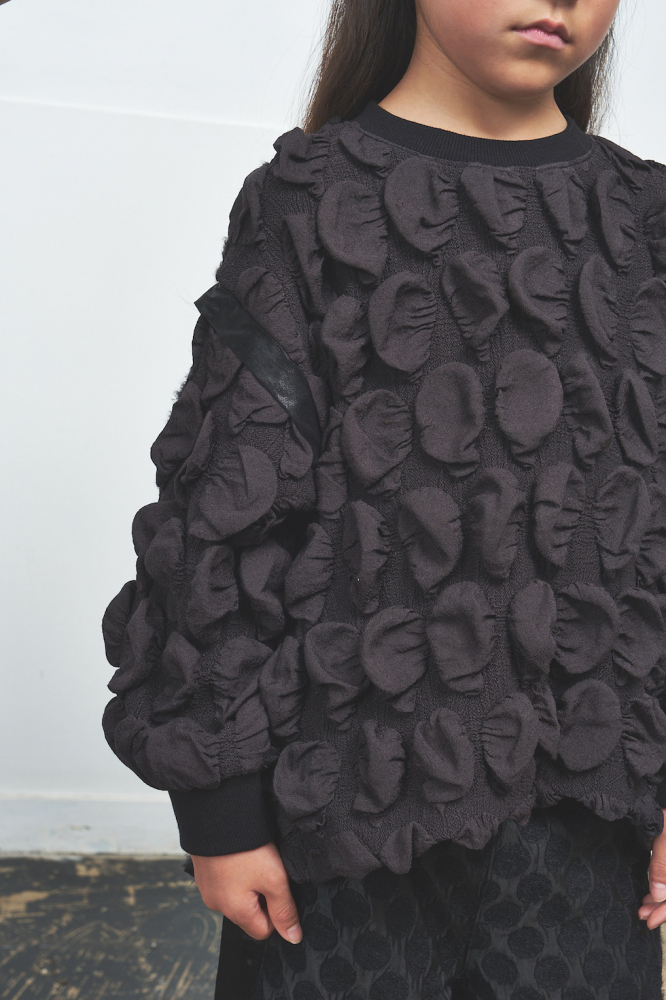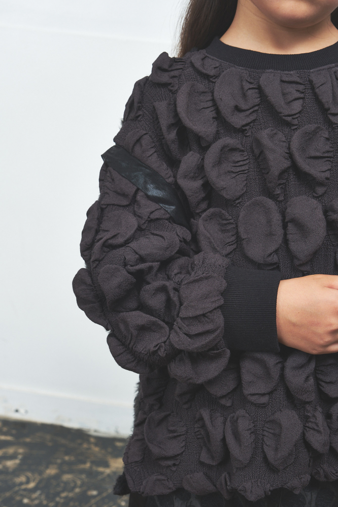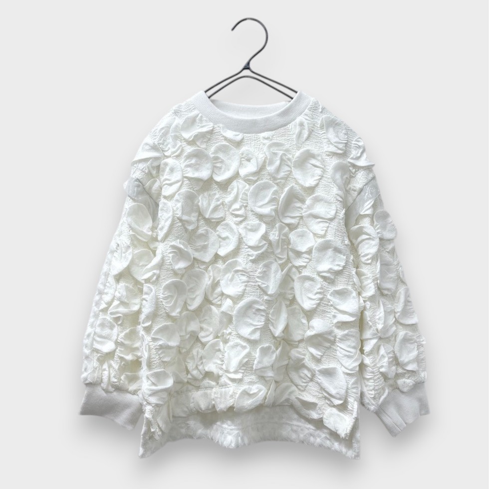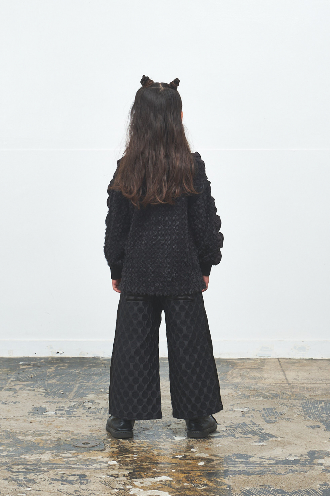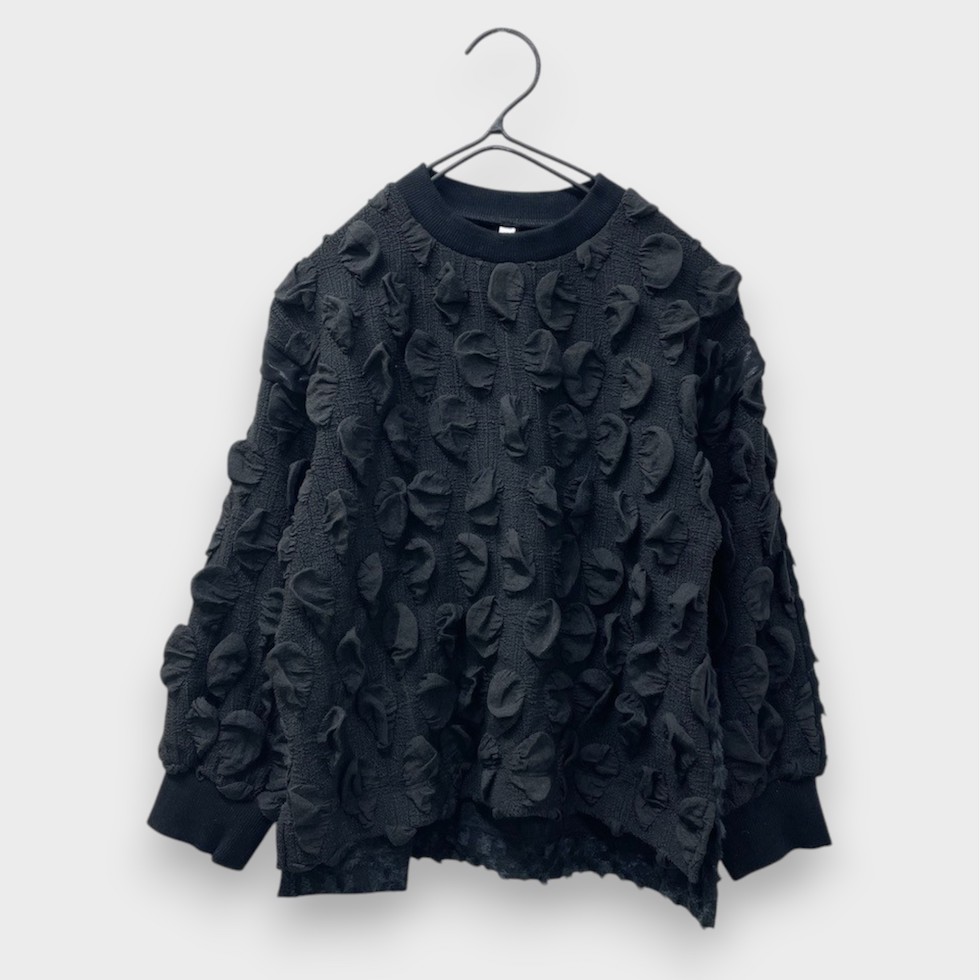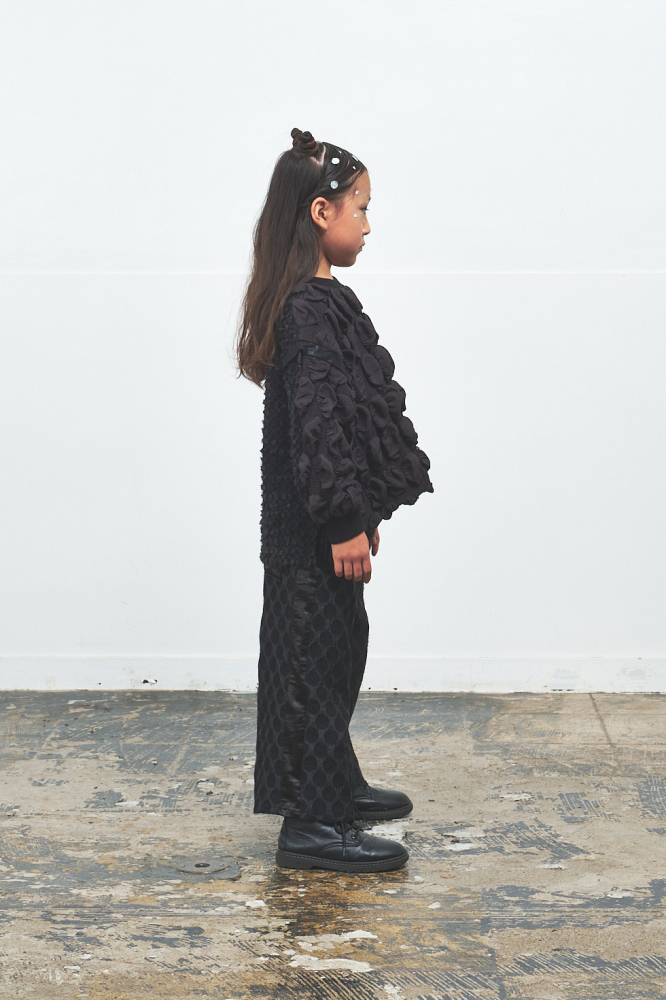 トレンド感のある異素材切り替えと立体的な表情が魅力のボックストレーナーです。フロントはオーバルフクレ素材(立体的な楕円形の凹凸が特徴)を採用し、シンプルな中にも存在感のあるユニークな表情をプラス。背面は柔らかくふわっとしたポイントファー仕様で暖かさと高級感のある仕上がりに。袖の切り替え部分には、挟み込んだメタルネット素材が、さり気ないメタリックな輝きと異素材感で、全体の印象を引き締めモードな雰囲気を演出します。