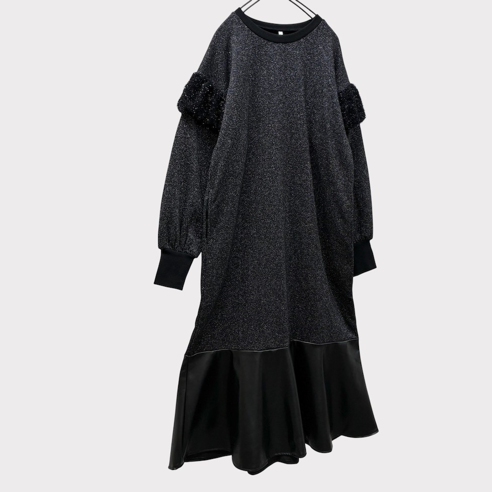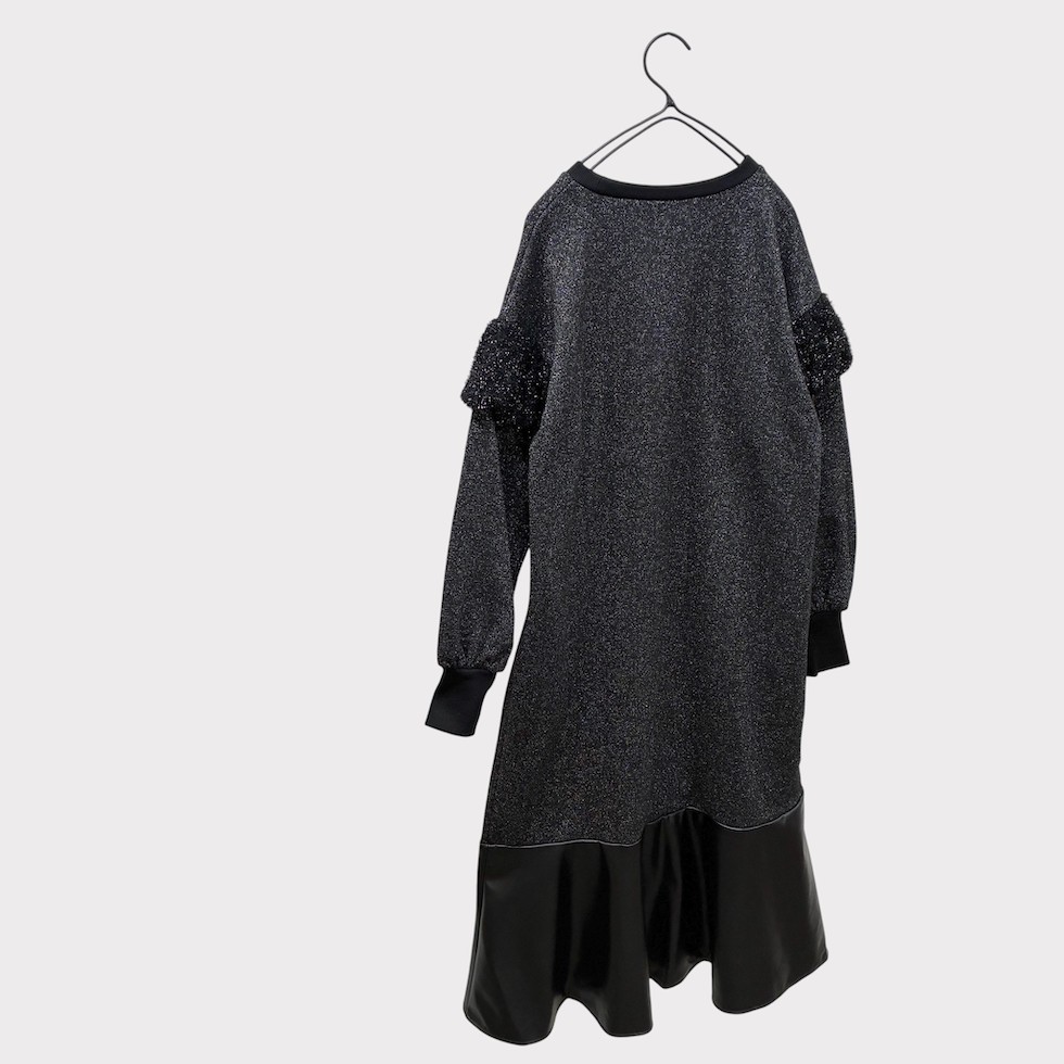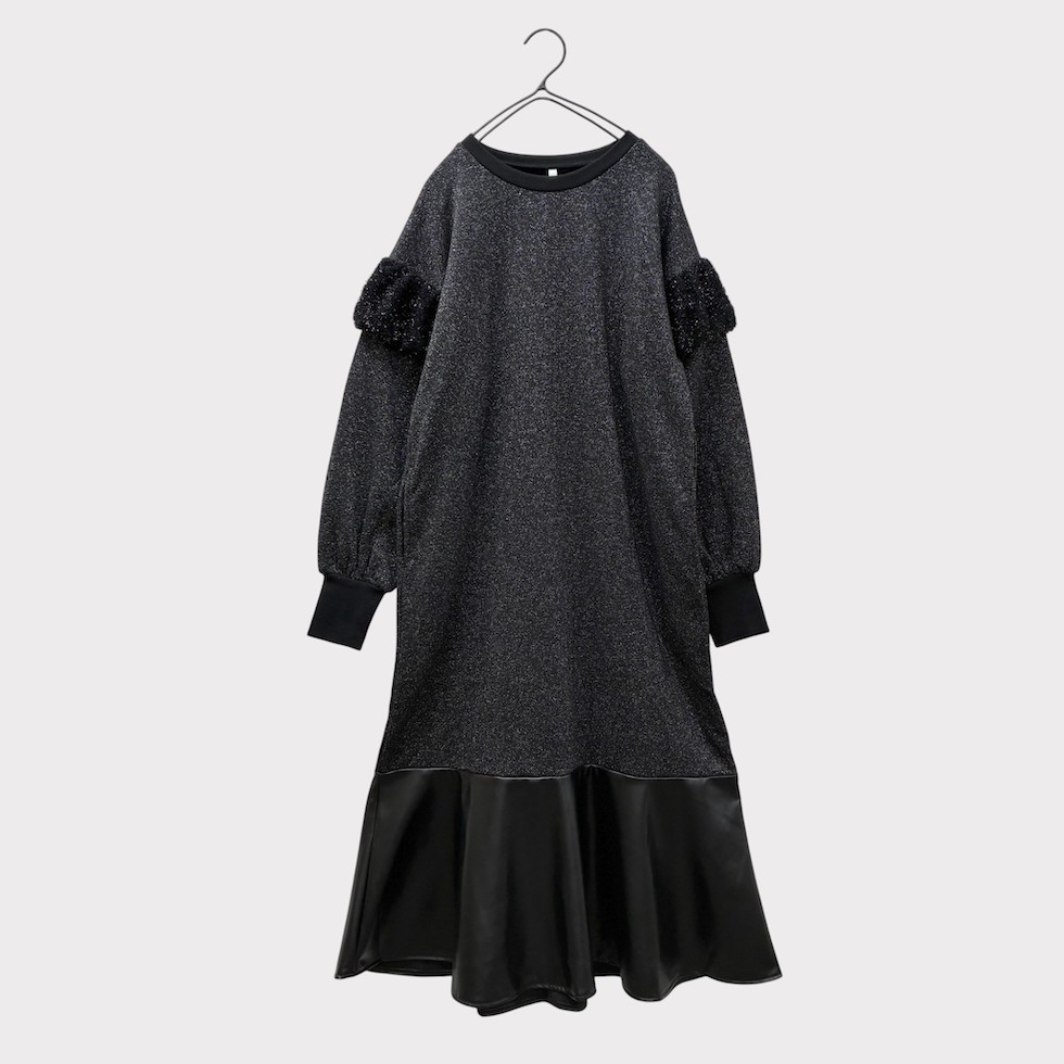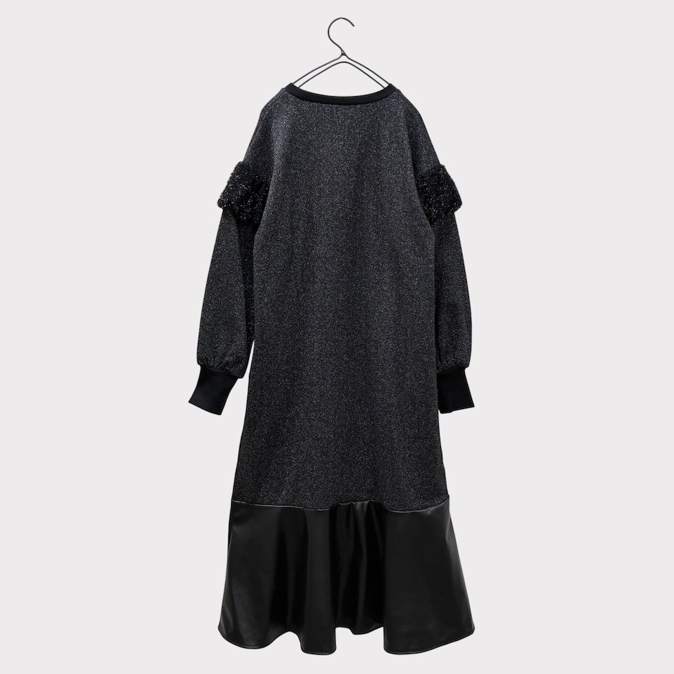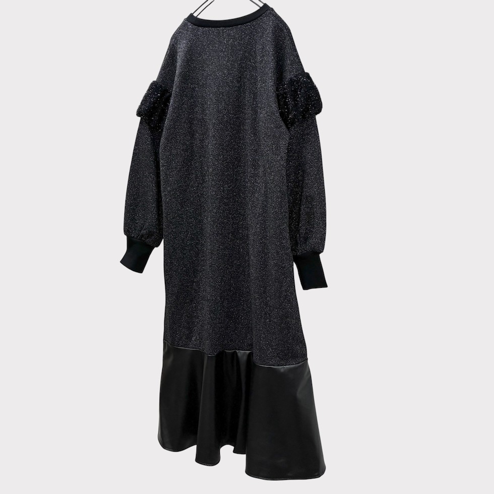 上品なラメ裏毛素材の身頃に、ふんわり華やかなラメ起毛の袖切替、そして裾にはフェイクレザーのマーメイドライン。異素材のリズムが絶妙に響き合う、主役級の一枚ワンピースです。袖にはラメ起毛のフリル切替を施し、さりげなくフェミニンなニュアンスをプラス。裾はフェイクレザーで切り替えたマーメイドシルエットになっており、動くたびにしなやかに揺れる美しいラインを演出します。シンプルながら、どこから見ても絵になる一着。