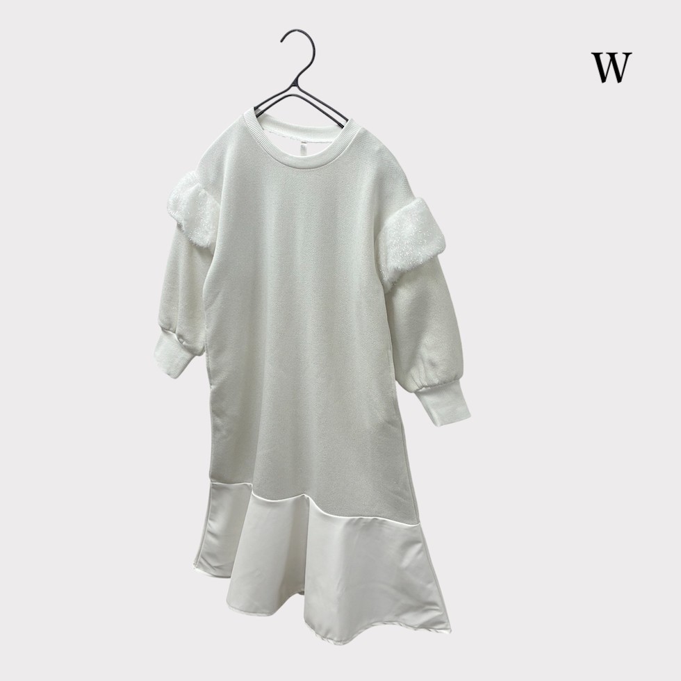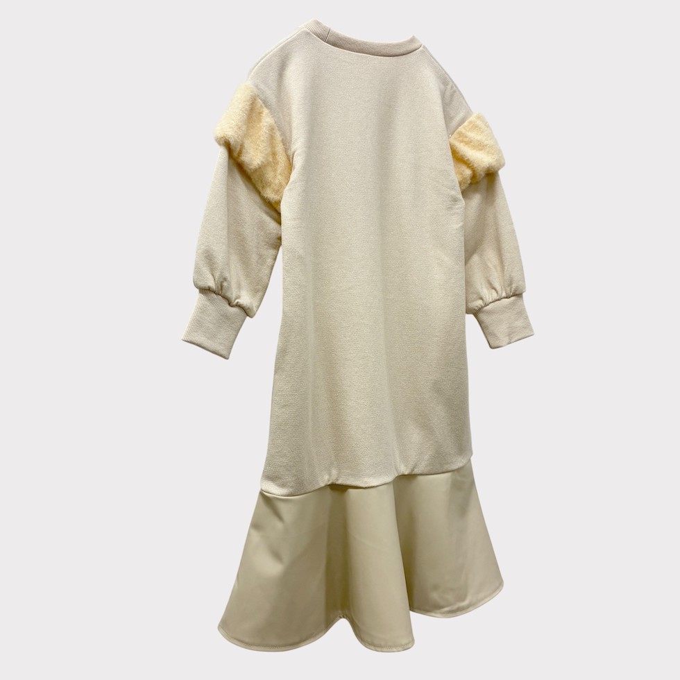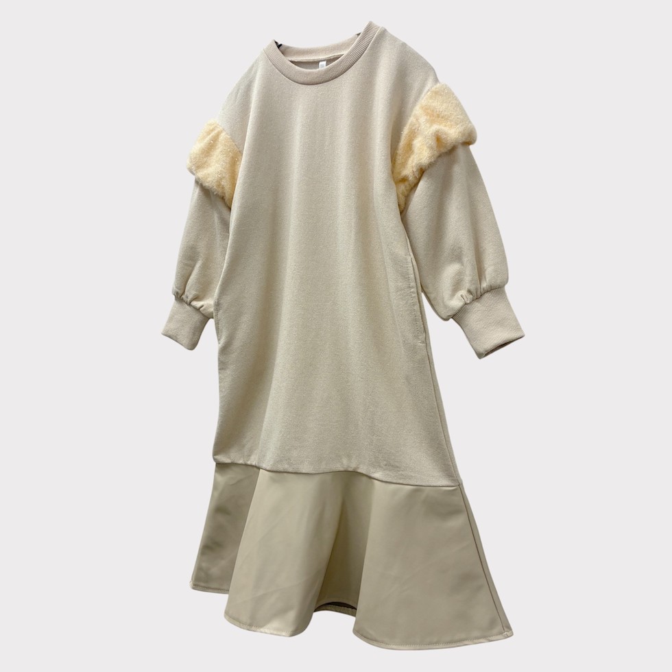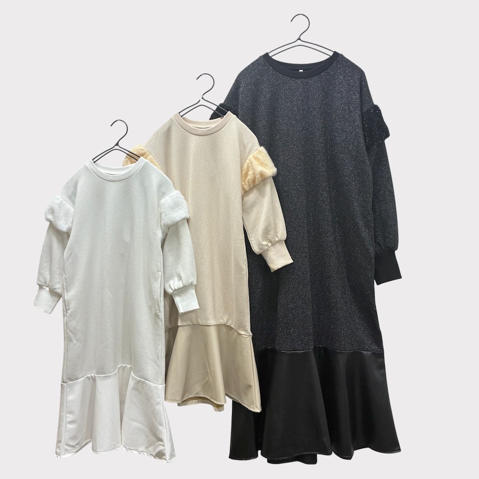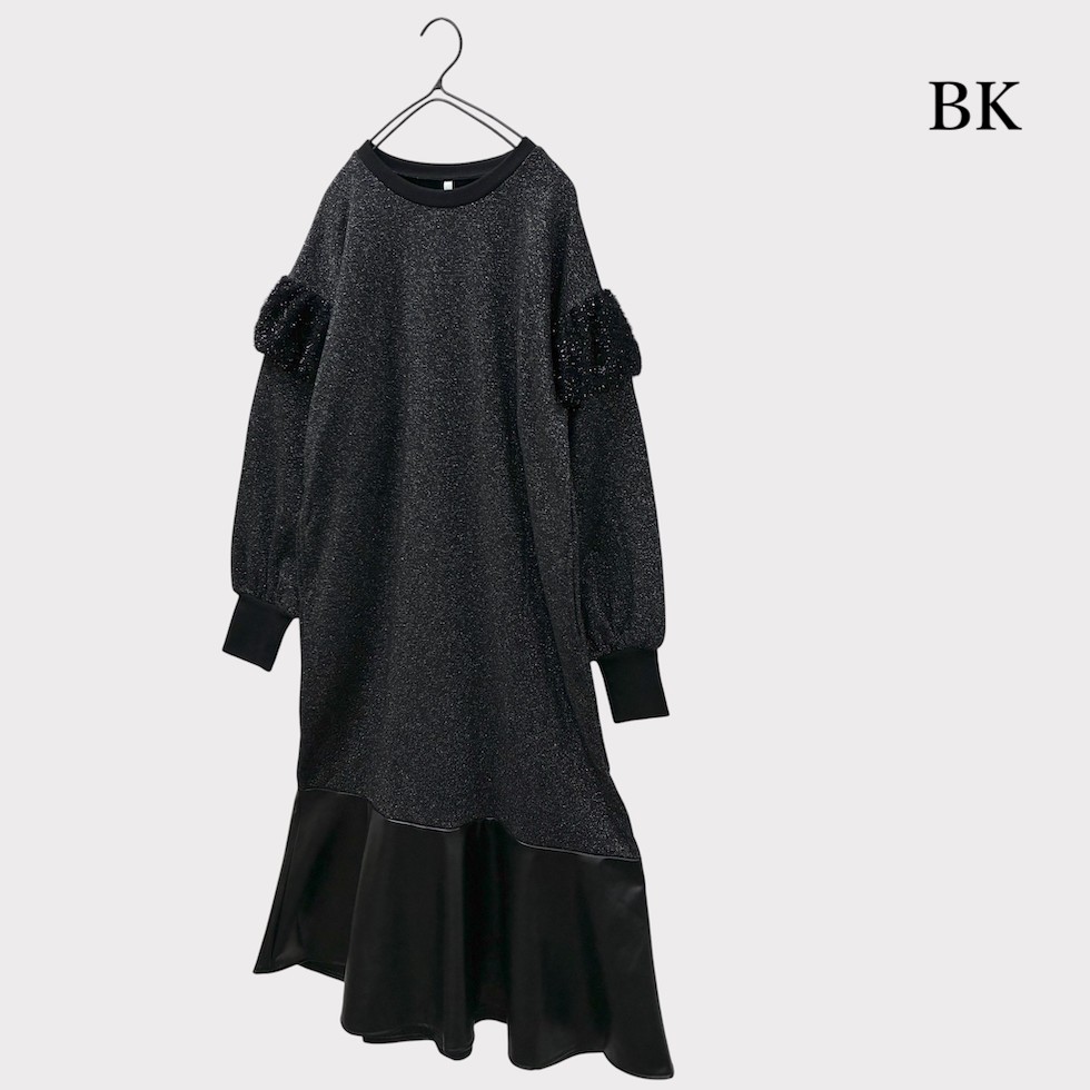 上品なラメ裏毛素材の身頃に、ふんわり華やかなラメ起毛の袖切替、そして裾にはフェイクレザーのマーメイドライン。異素材のリズムが絶妙に響き合う、主役級の一枚ワンピースです。袖にはラメ起毛のフリル切替を施し、さりげなくフェミニンなニュアンスをプラス。裾はフェイクレザーで切り替えたマーメイドシルエットになっており、動くたびにしなやかに揺れる美しいラインを演出します。シンプルながら、どこから見ても絵になる一着。