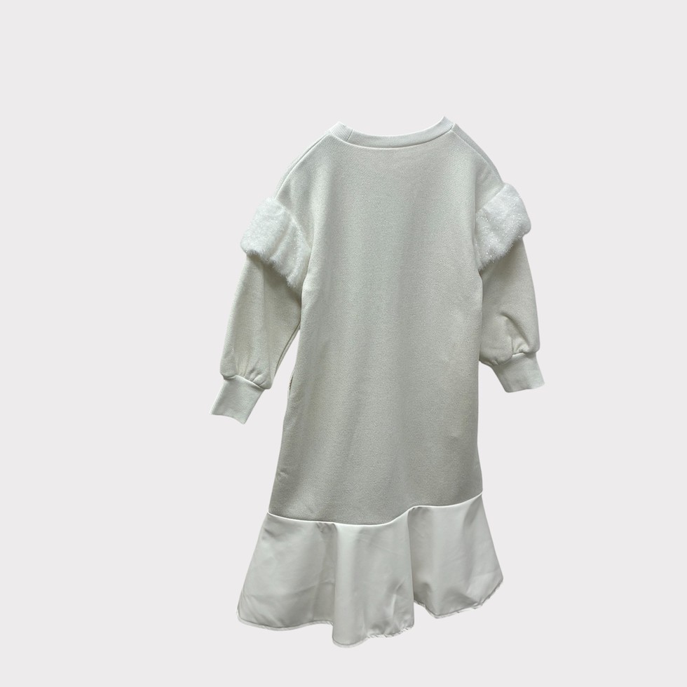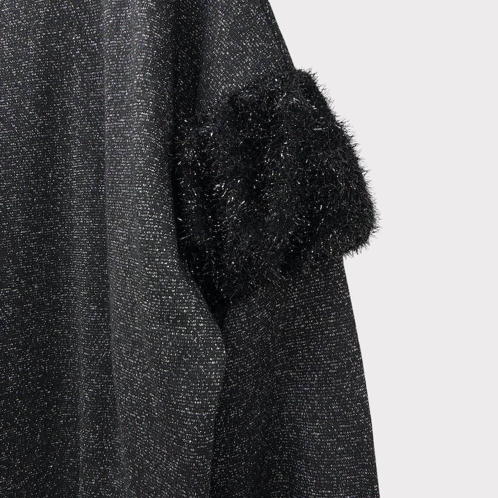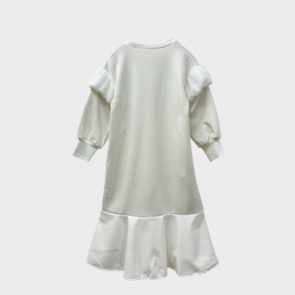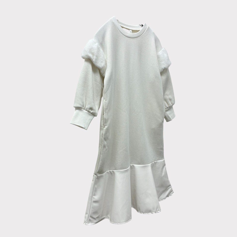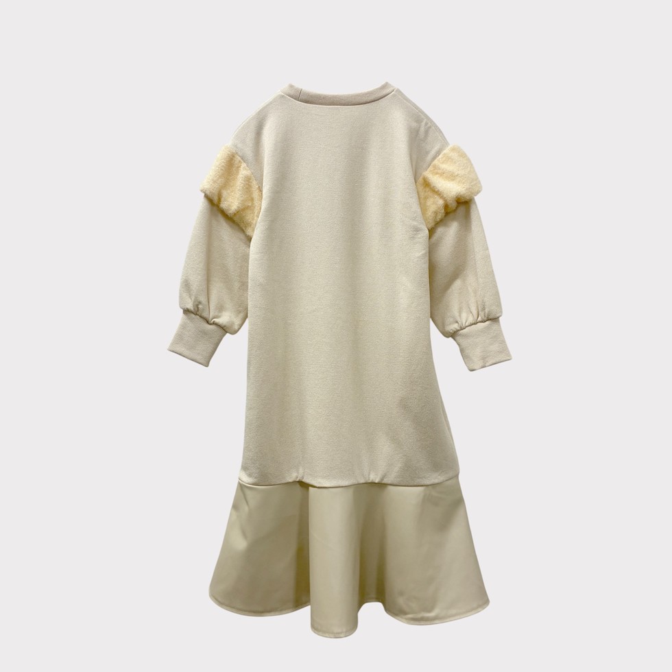 上品なラメ裏毛素材の身頃に、ふんわり華やかなラメ起毛の袖切替、そして裾にはフェイクレザーのマーメイドライン。異素材のリズムが絶妙に響き合う、主役級の一枚ワンピースです。袖にはラメ起毛のフリル切替を施し、さりげなくフェミニンなニュアンスをプラス。裾はフェイクレザーで切り替えたマーメイドシルエットになっており、動くたびにしなやかに揺れる美しいラインを演出します。シンプルながら、どこから見ても絵になる一着。