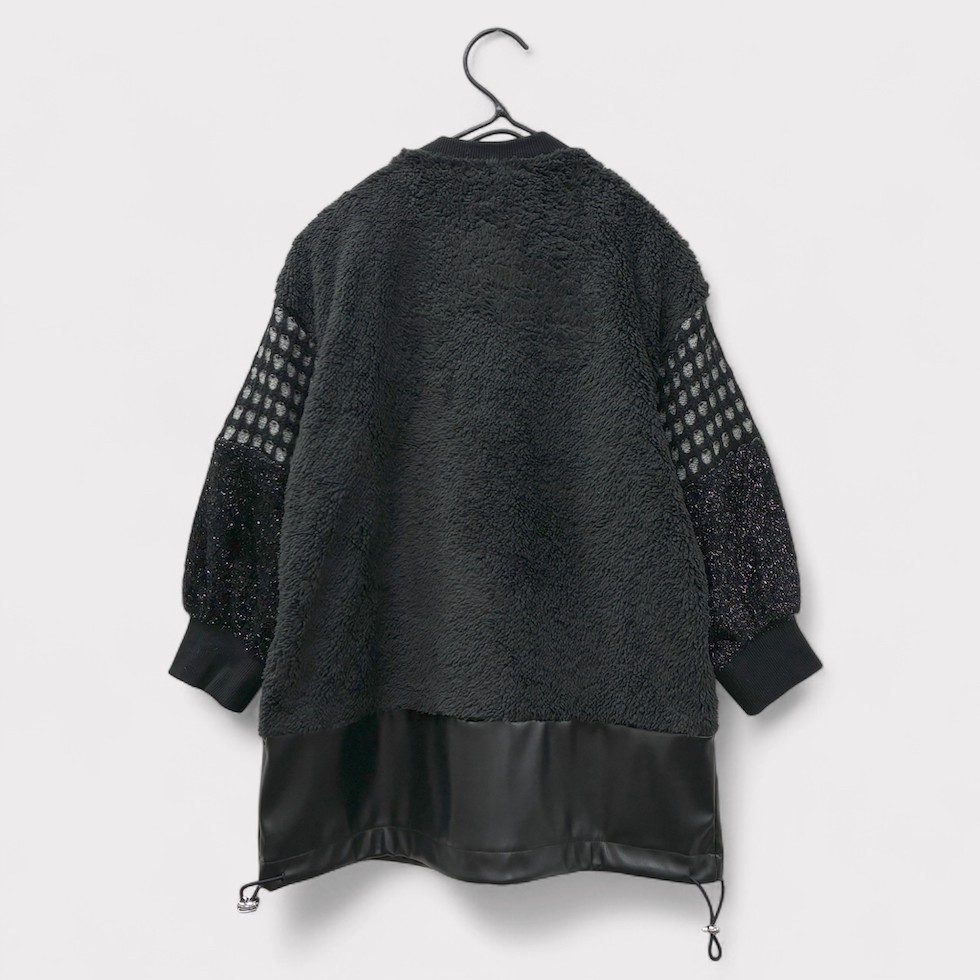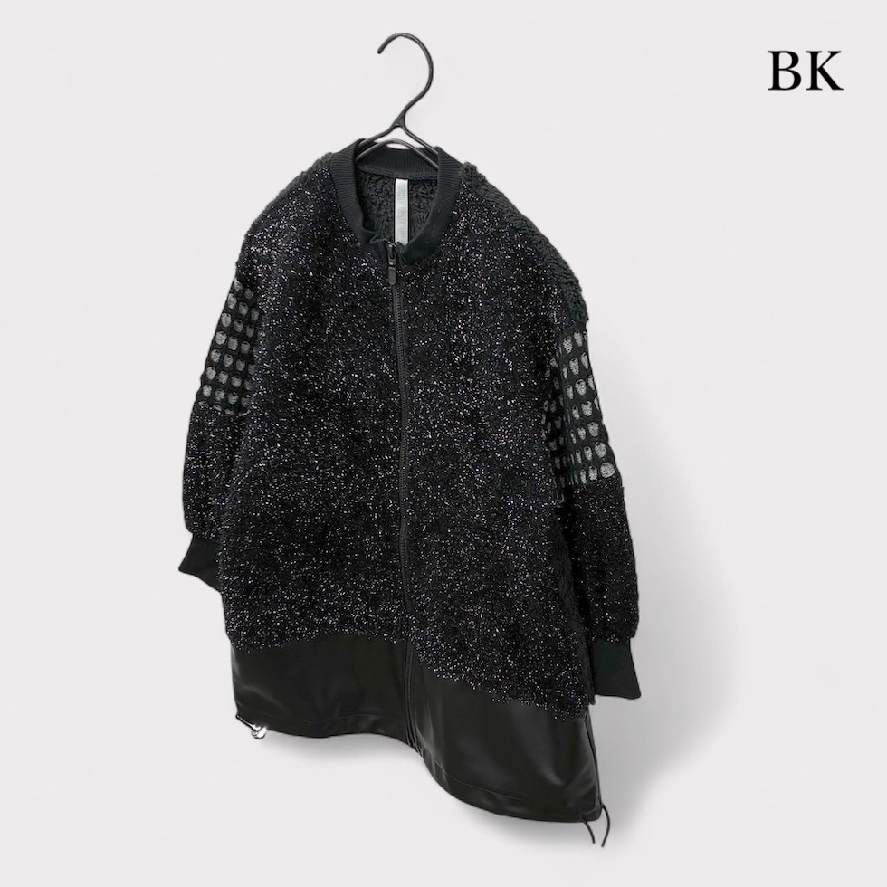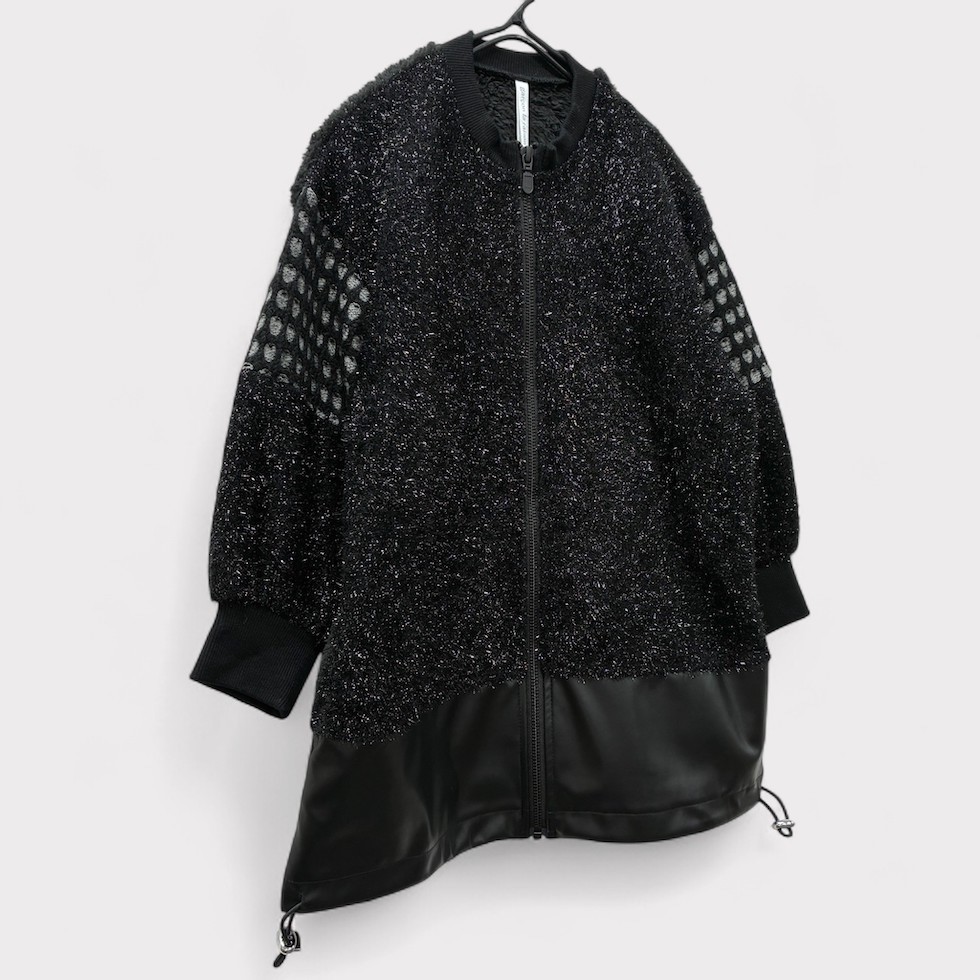 異素材を贅沢に組み合わせた、存在感のあるジップアップコーディガン。ラメ起毛・ボア・格子柄ニット・フェイクレザーが絶妙にミックスされ、一枚でスタイリングが完成する主役級のアイテムです。裾のドロスト仕様でシルエットを調整でき、防寒性もアップ。ユニセックスで楽しめる、秋冬のマストアウターです。