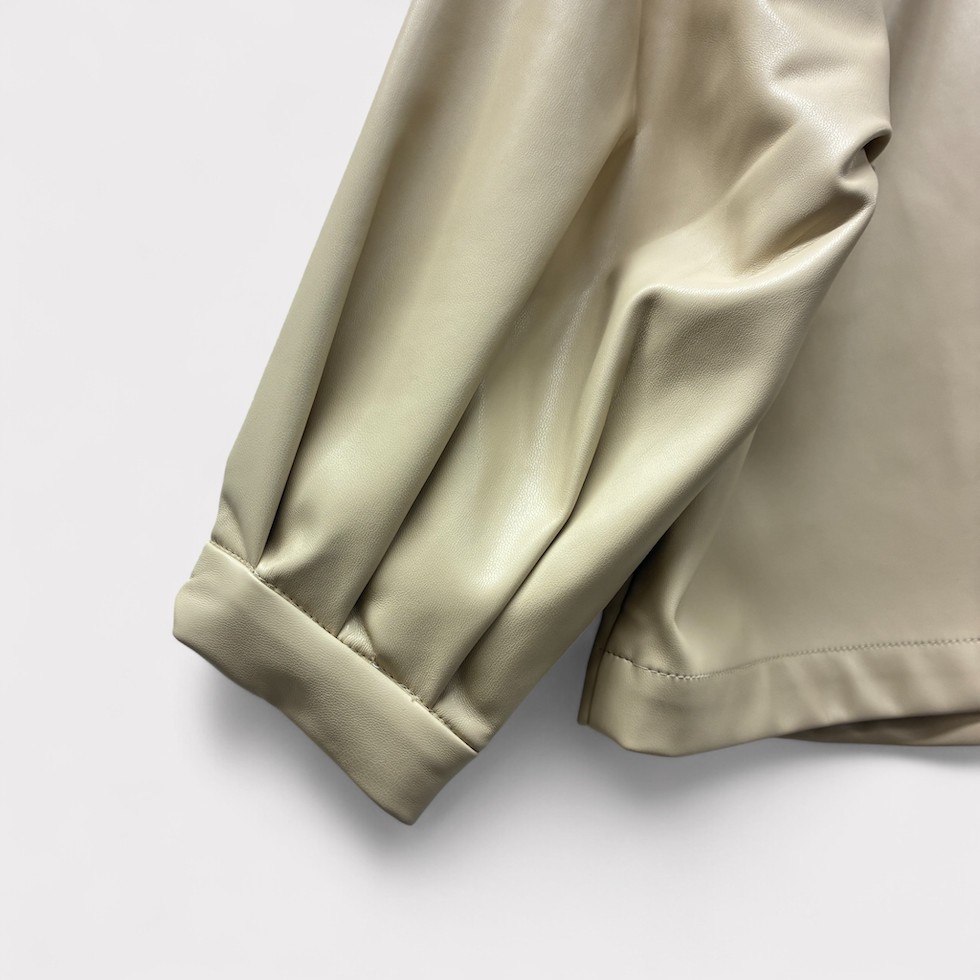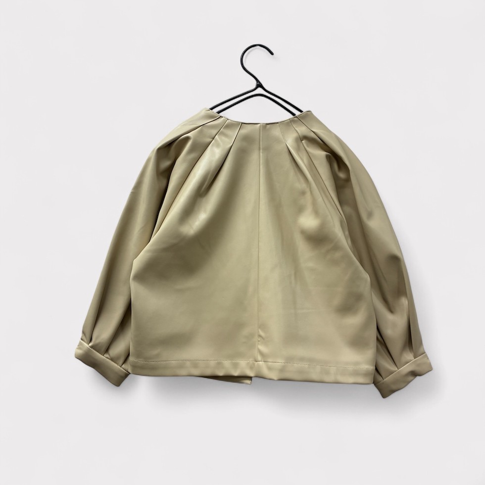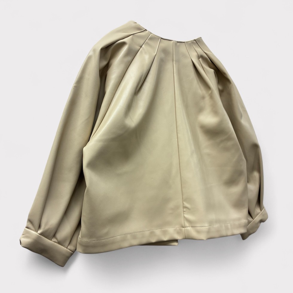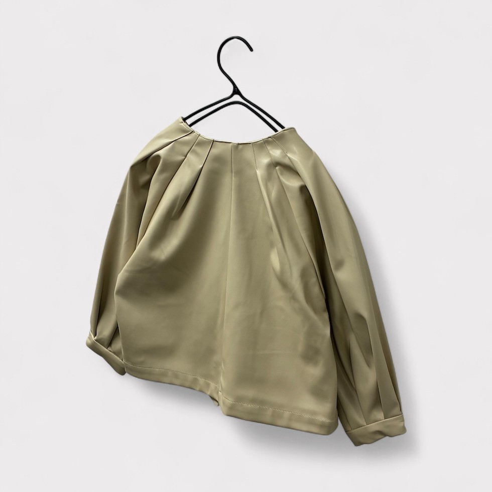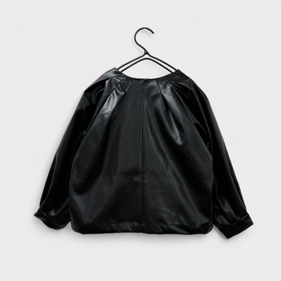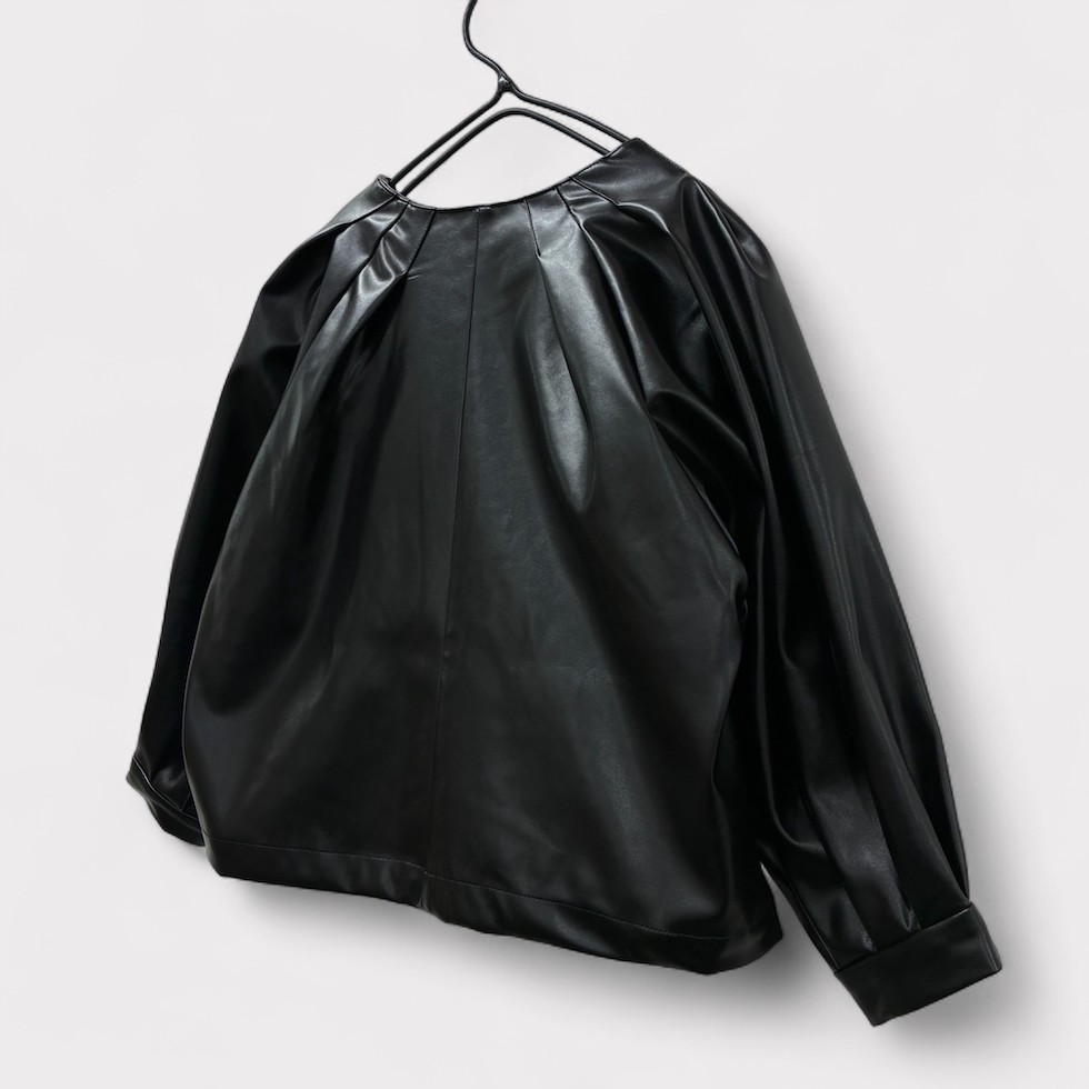 タックディテールが効いたフェイクレザーのバルーンスリーブジャケット。しなやかな質感のフェイクレザーを使用したライトアウターで、袖口と襟ぐりに施したタックが立体的なフォルムを生み出します。柔らかくもエッジの効いたデザインで、モードにもカジュアルにも振れる一着。同素材で展開しているタックワイドパンツとのセットアップスタイルは、ジェンダーにとらわれない洗練された印象に。シンプルながらも存在感のあるシルエットで、着る人の個性を引き立ててくれるアイテムです。