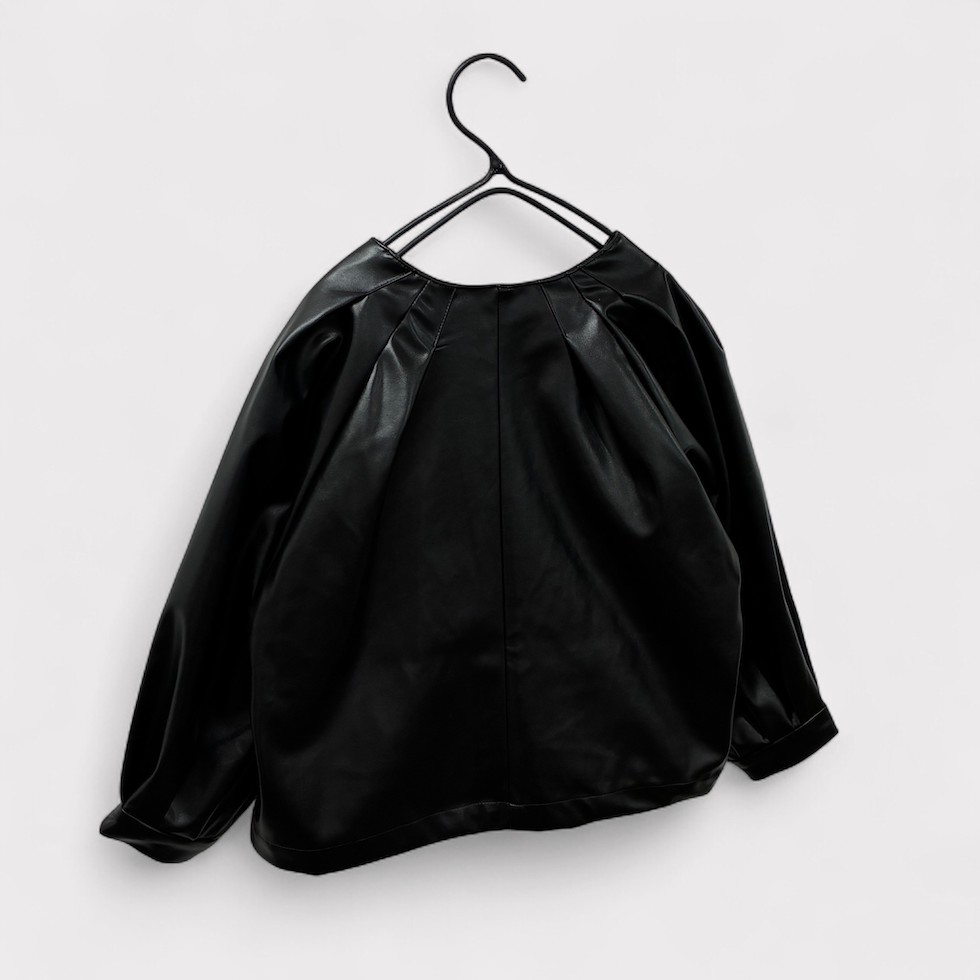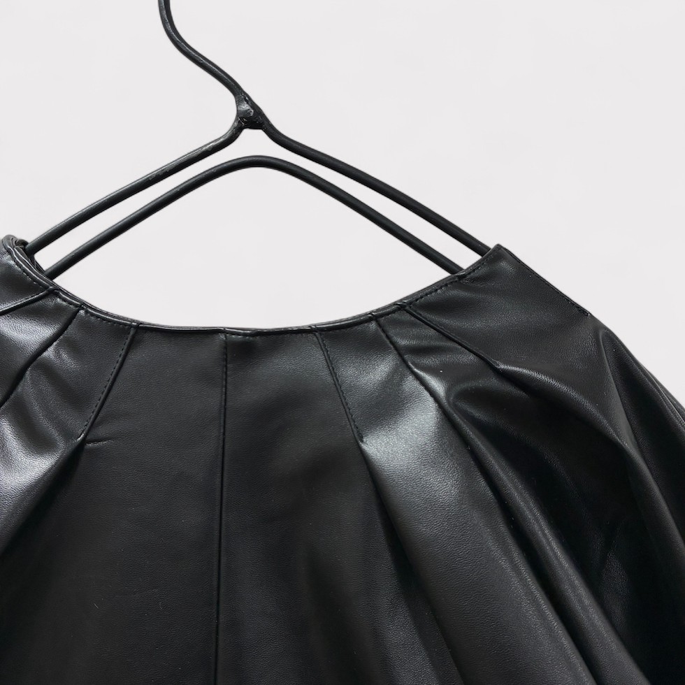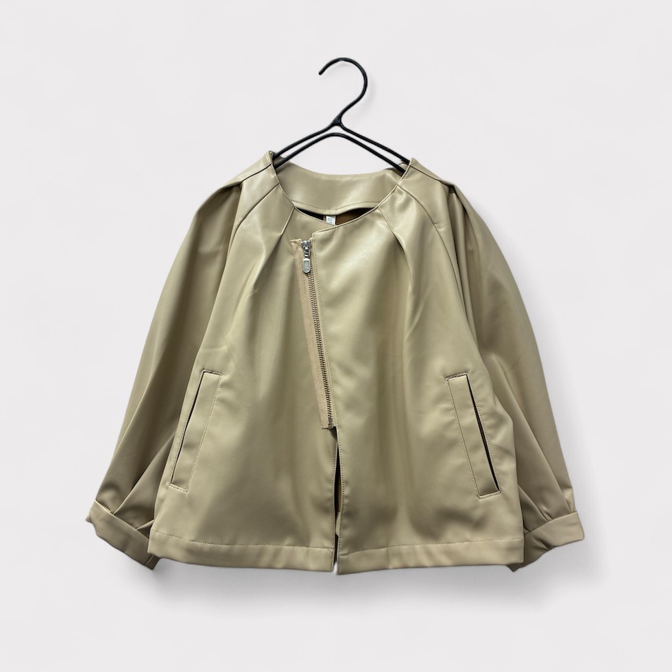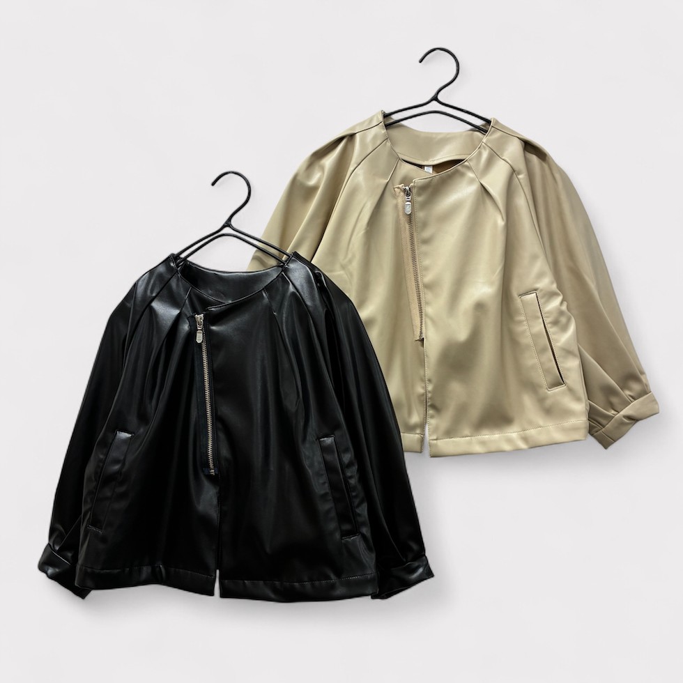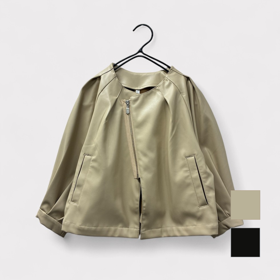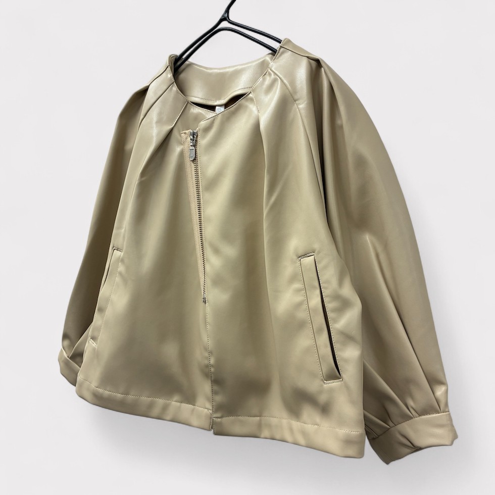 タックディテールが効いたフェイクレザーのバルーンスリーブジャケット。しなやかな質感のフェイクレザーを使用したライトアウターで、袖口と襟ぐりに施したタックが立体的なフォルムを生み出します。柔らかくもエッジの効いたデザインで、モードにもカジュアルにも振れる一着。同素材で展開しているタックワイドパンツとのセットアップスタイルは、ジェンダーにとらわれない洗練された印象に。シンプルながらも存在感のあるシルエットで、着る人の個性を引き立ててくれるアイテムです。