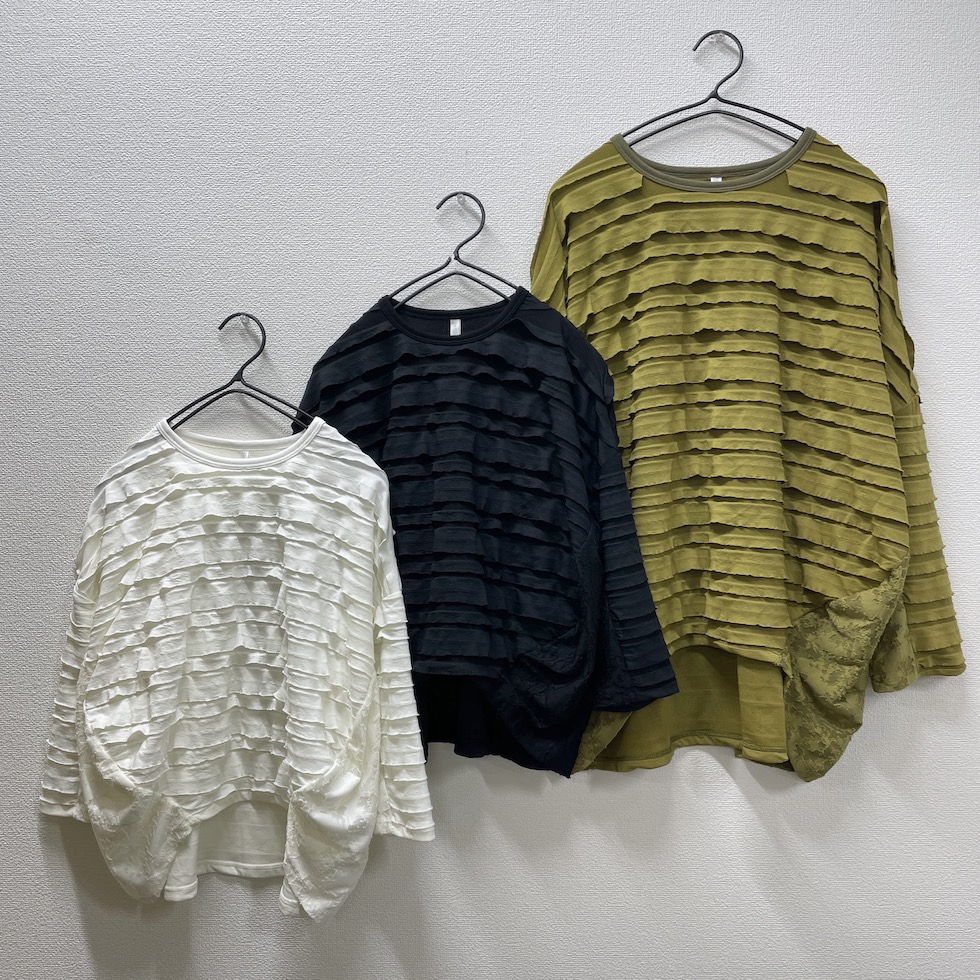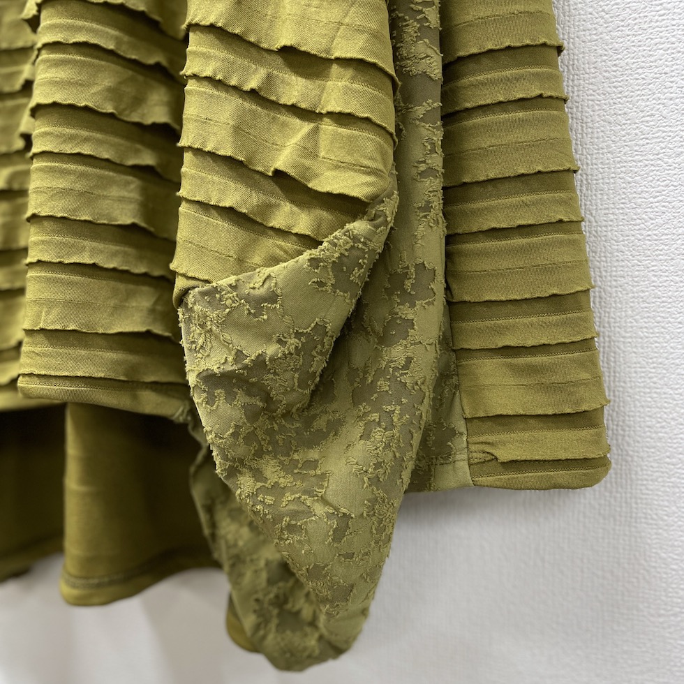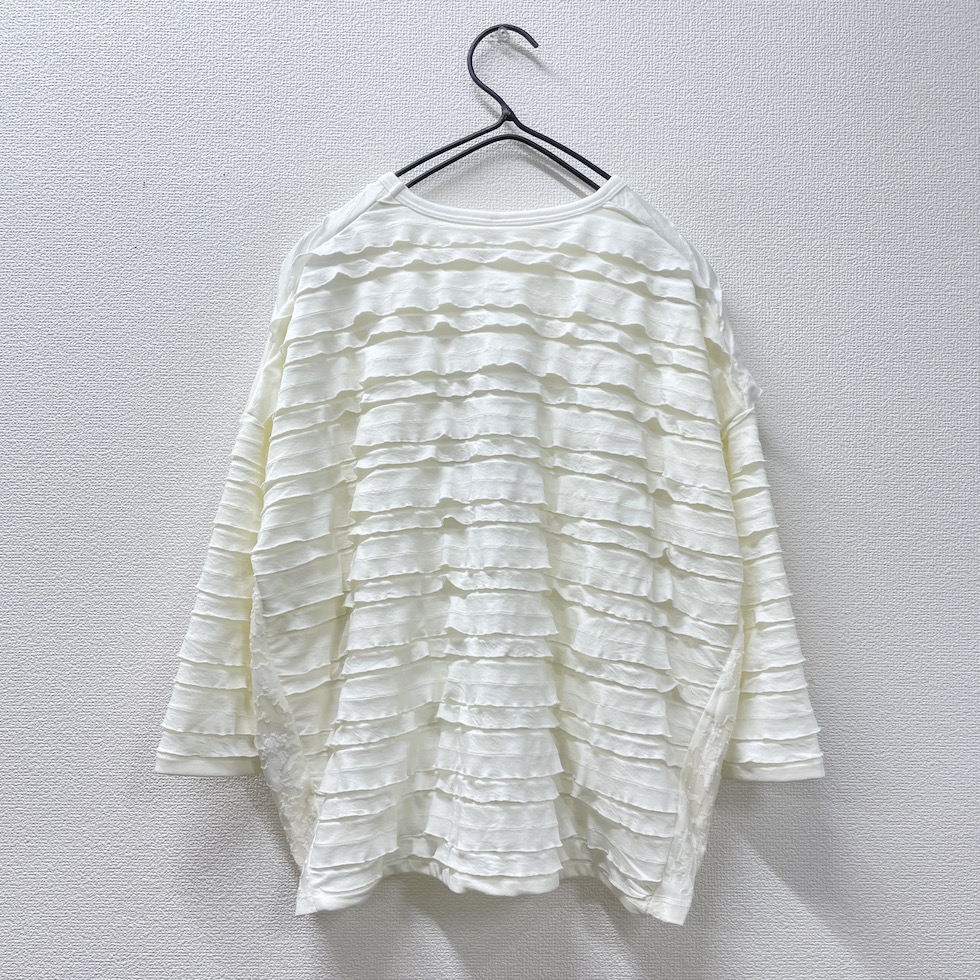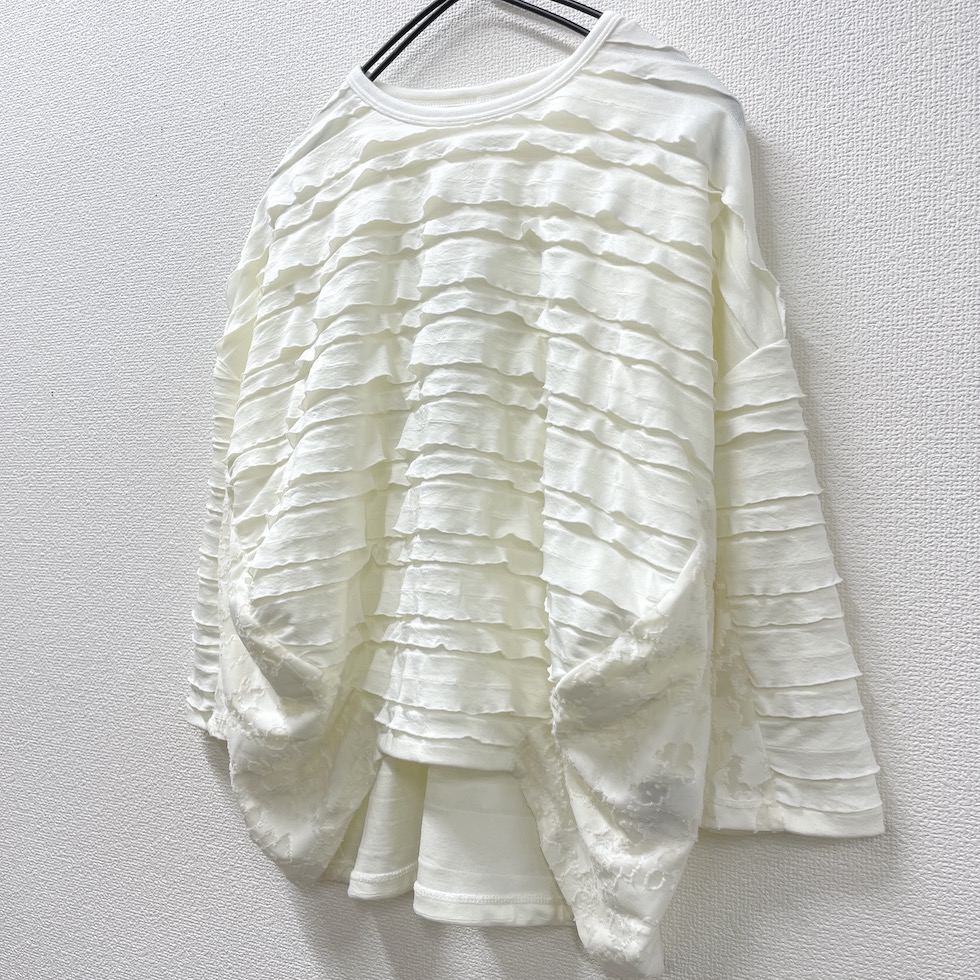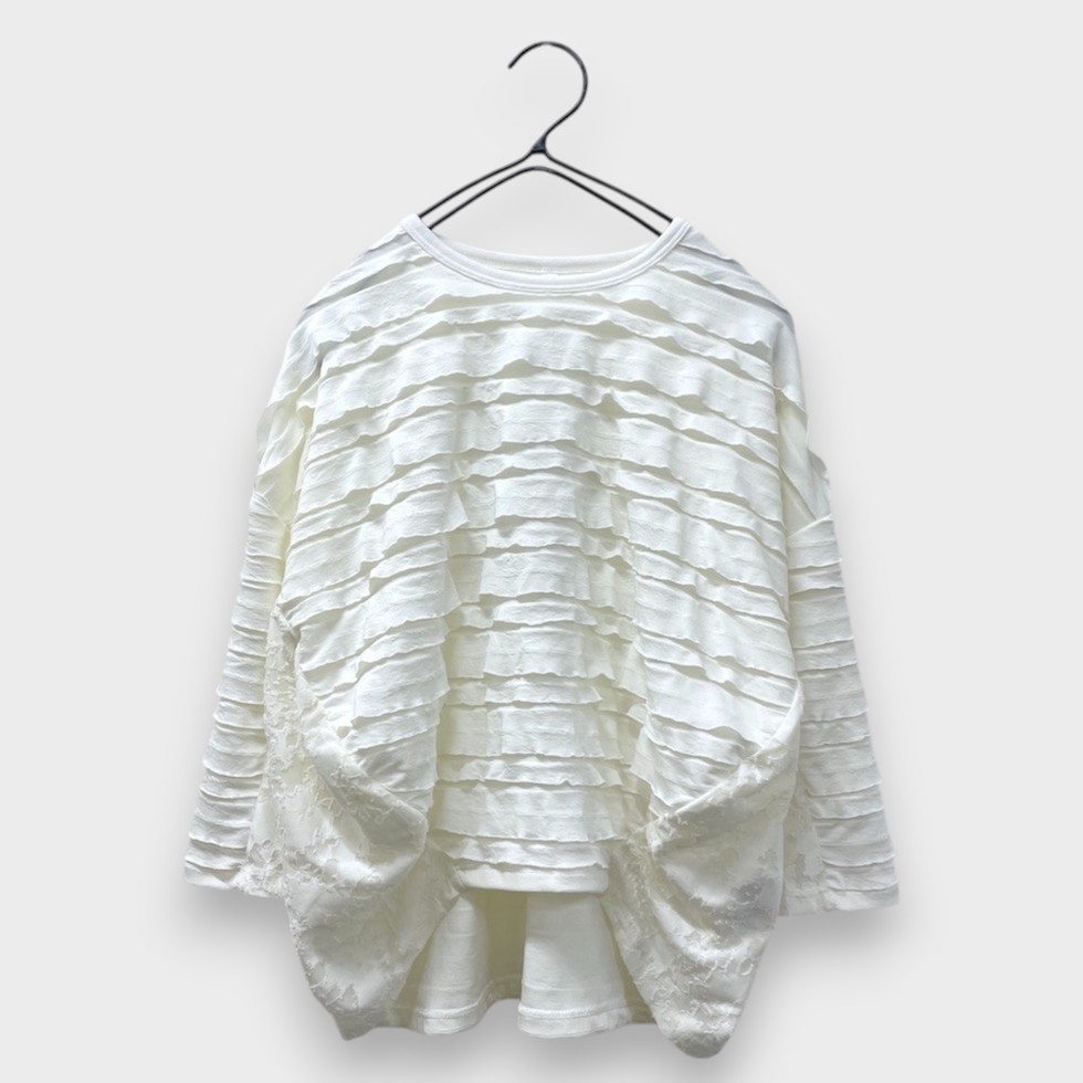 段々とした立体感が特徴の素材を全面に使用したバルーンシルエットのプルオーバー。袖から身頃にかけて程よくボリュームを持たせつつも、サイドを透け感のあるレーシージャガードで切り替えることで、抜け感と軽やかさをプラスしました。異素材の組み合わせが奥行きを生み、シンプルながらも印象的な一枚に仕上がっています。
