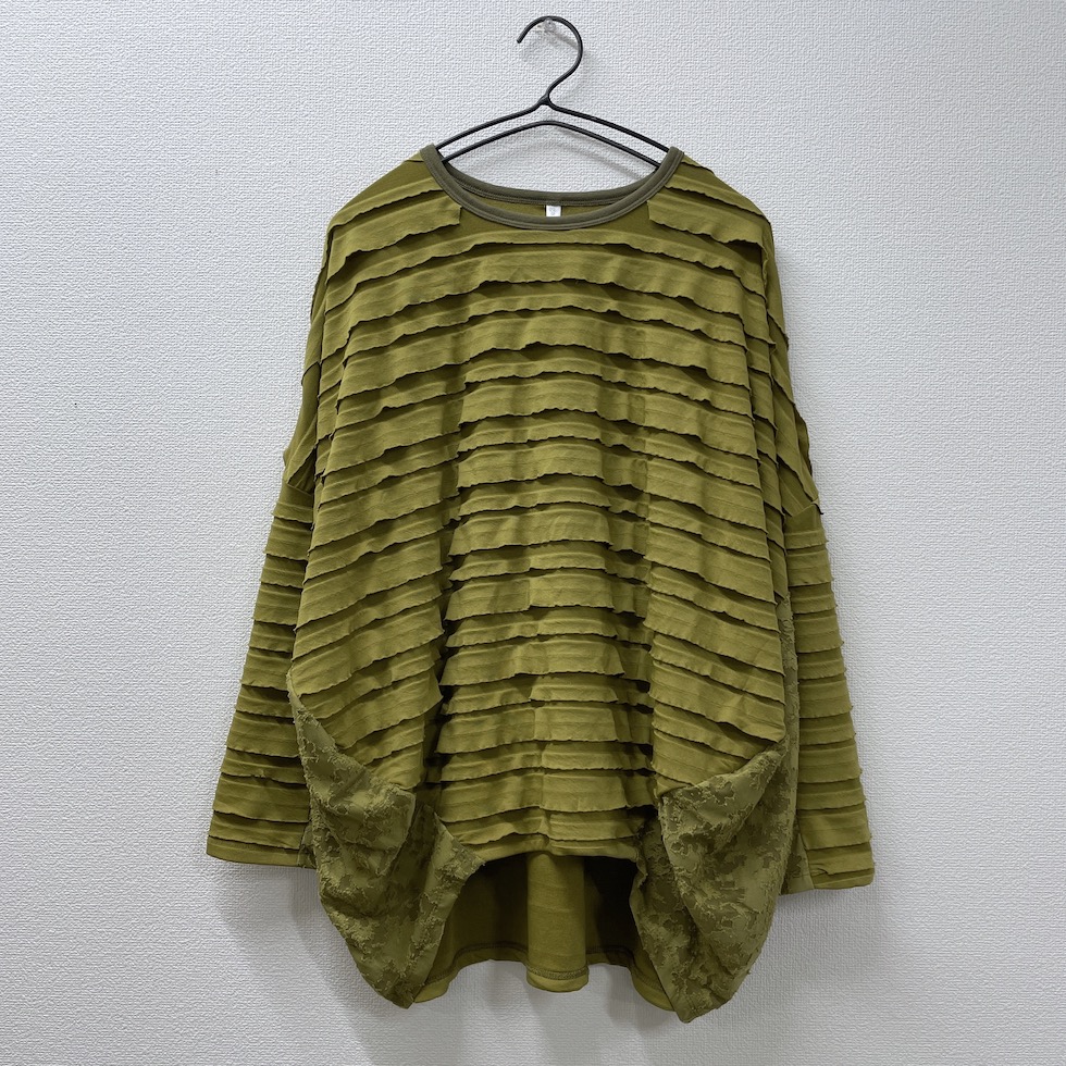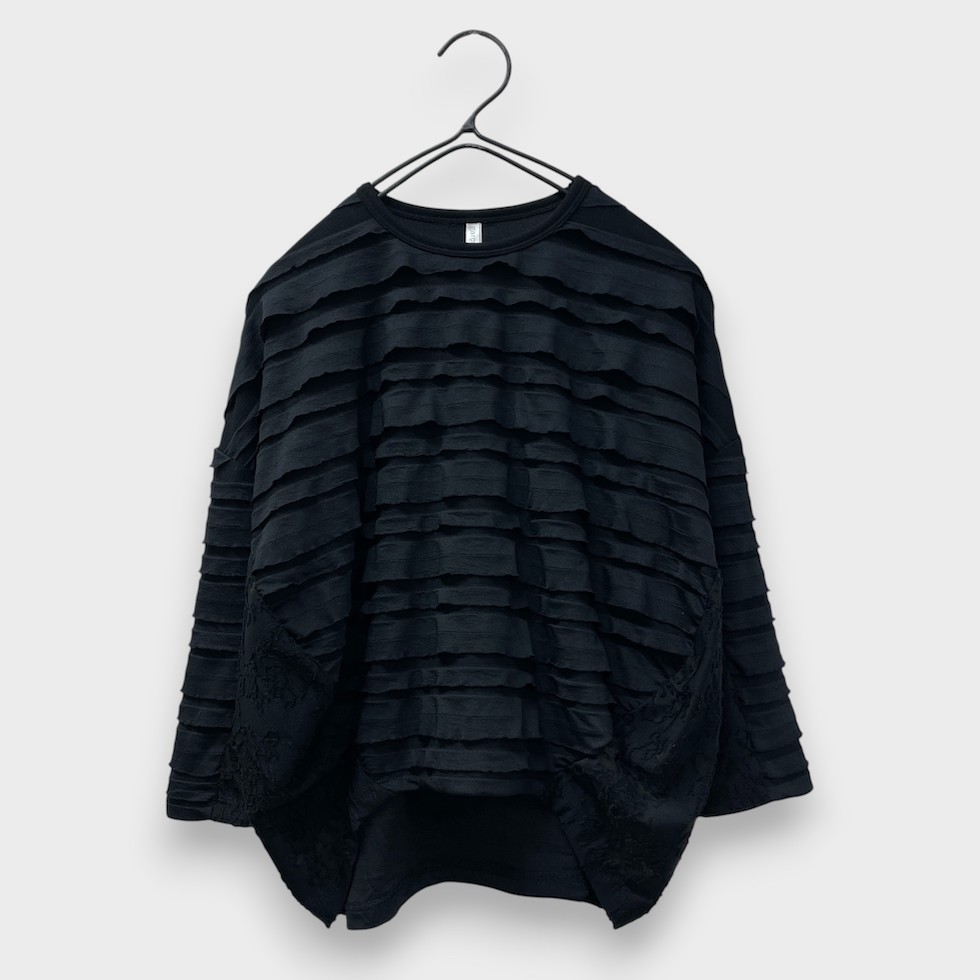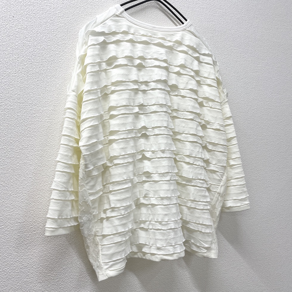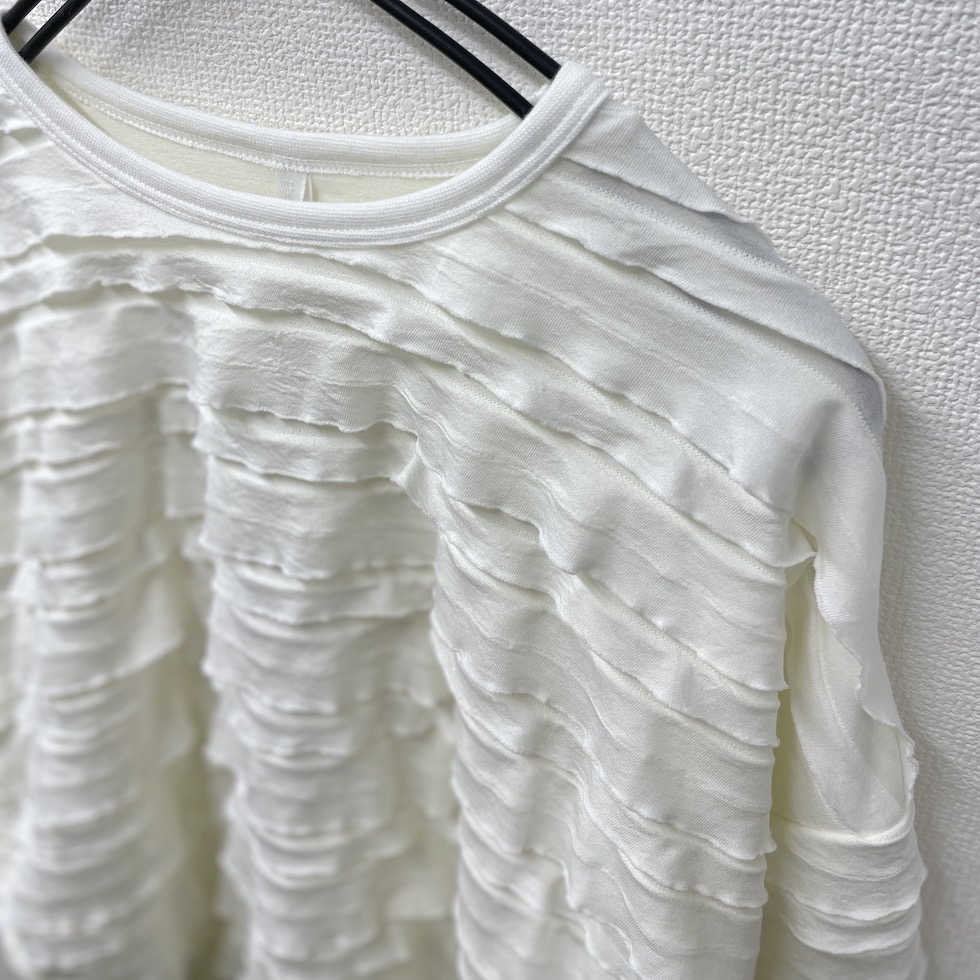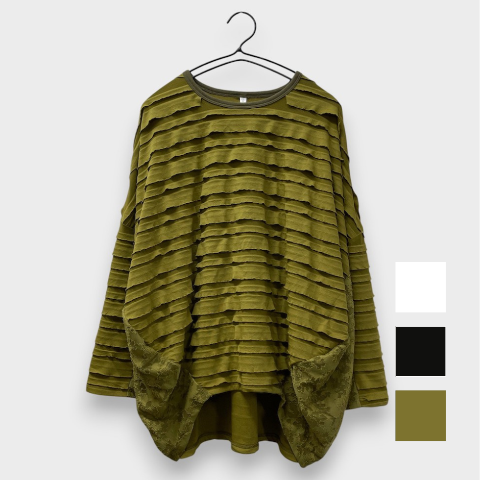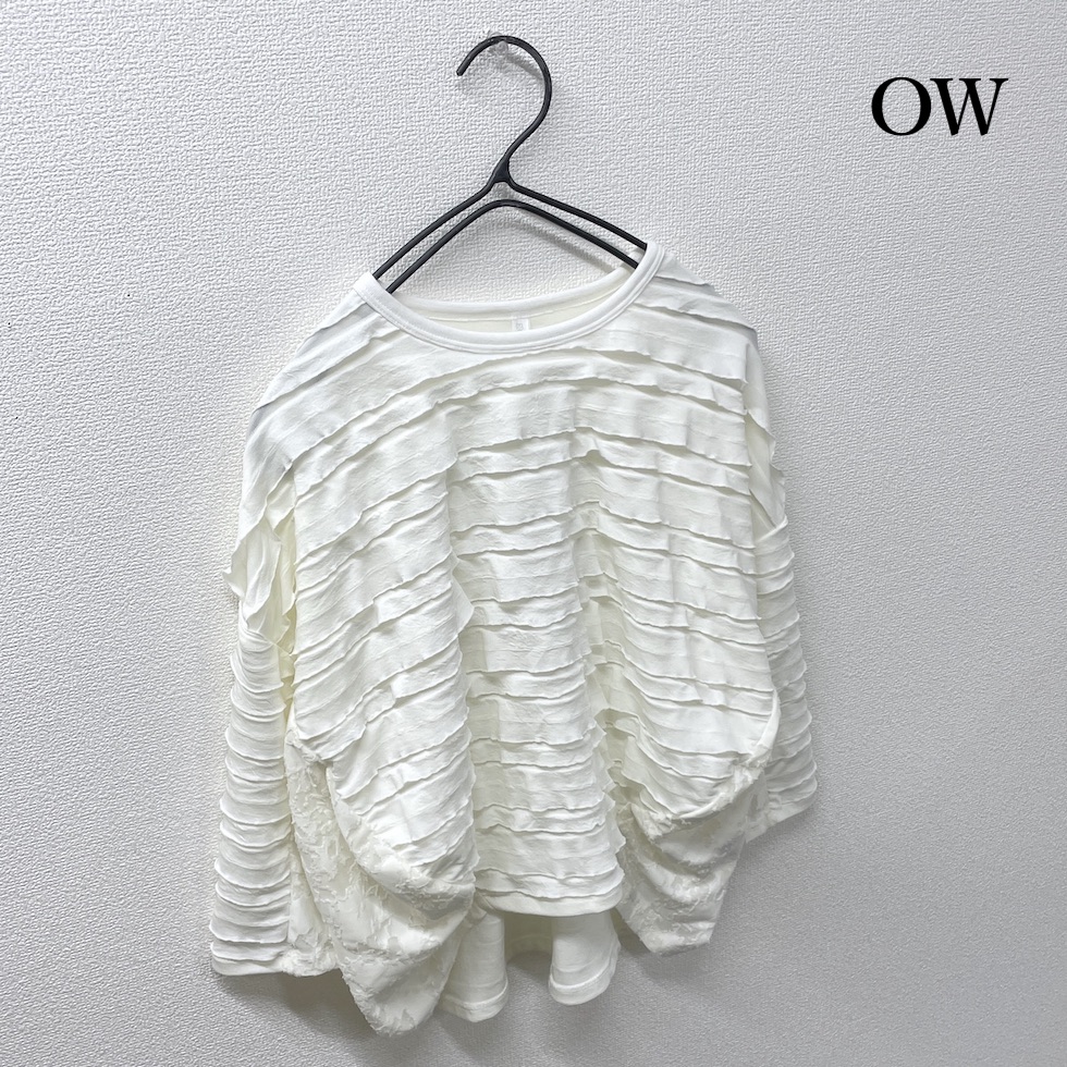 段々とした立体感が特徴の素材を全面に使用したバルーンシルエットのプルオーバー。袖から身頃にかけて程よくボリュームを持たせつつも、サイドを透け感のあるレーシージャガードで切り替えることで、抜け感と軽やかさをプラスしました。異素材の組み合わせが奥行きを生み、シンプルながらも印象的な一枚に仕上がっています。