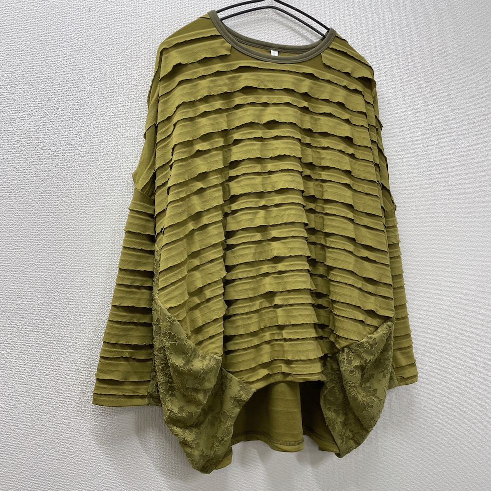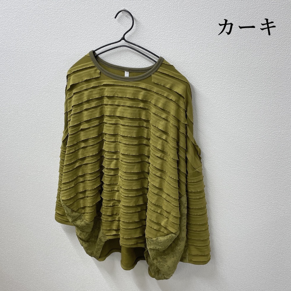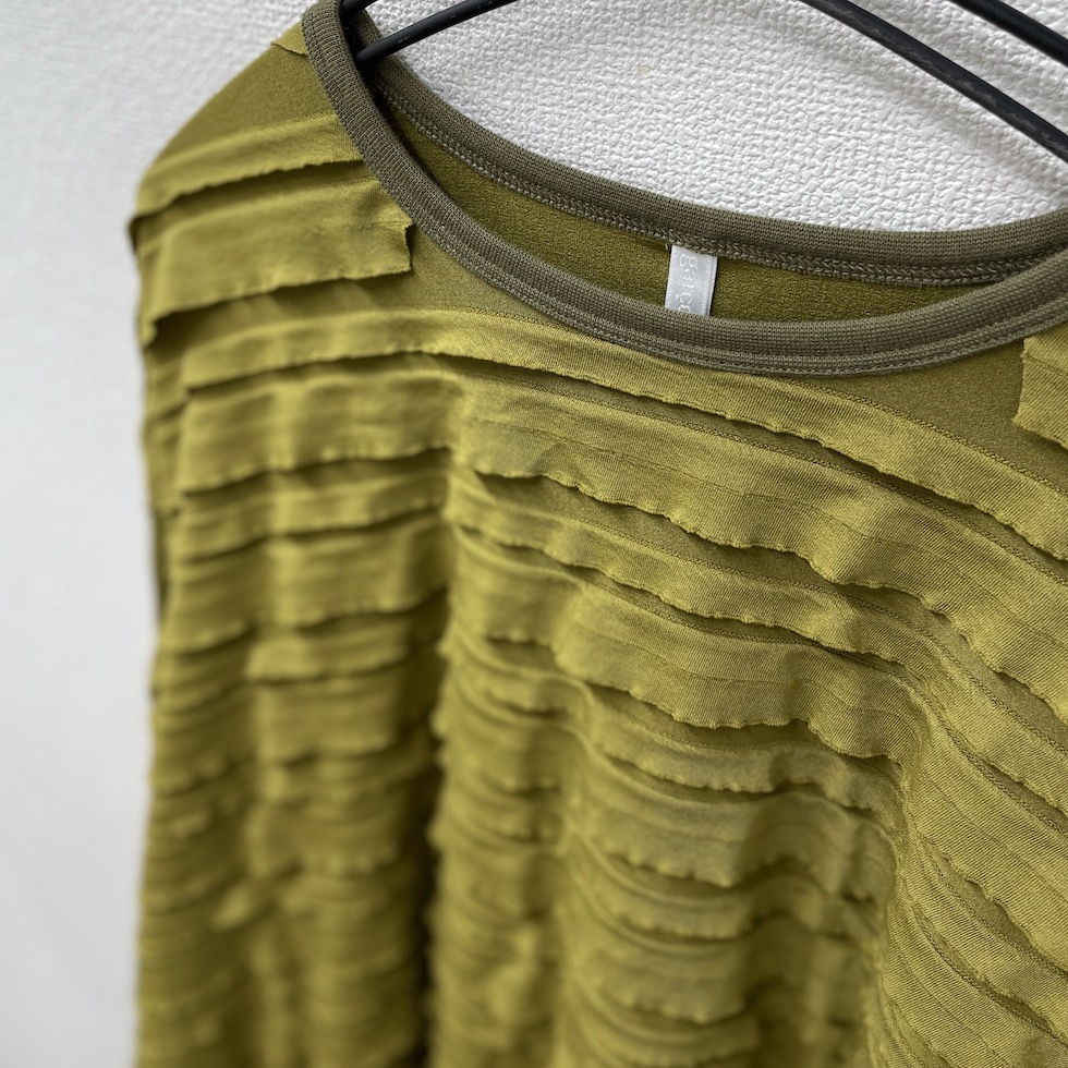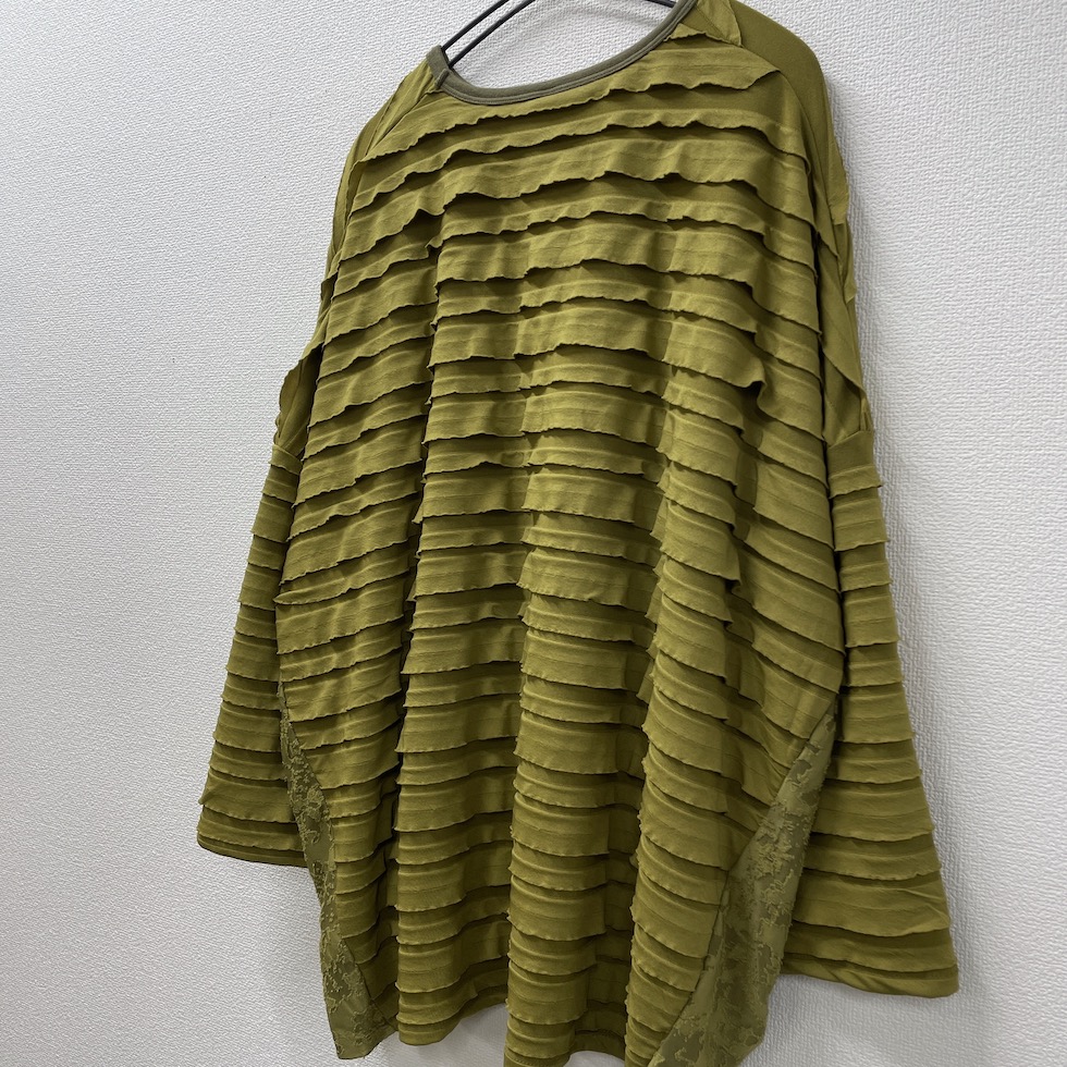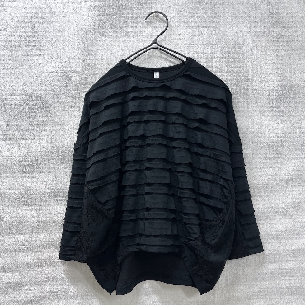 段々とした立体感が特徴の素材を全面に使用したバルーンシルエットのプルオーバー。袖から身頃にかけて程よくボリュームを持たせつつも、サイドを透け感のあるレーシージャガードで切り替えることで、抜け感と軽やかさをプラスしました。異素材の組み合わせが奥行きを生み、シンプルながらも印象的な一枚に仕上がっています。