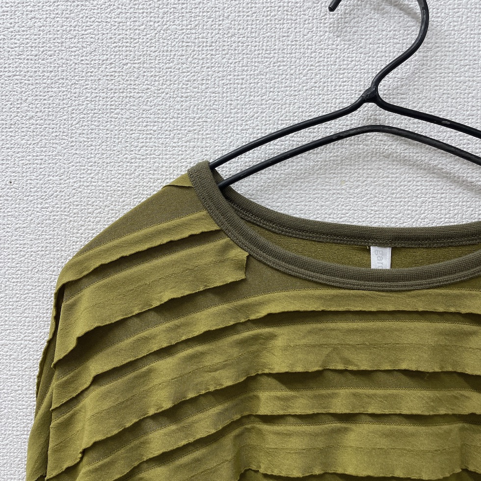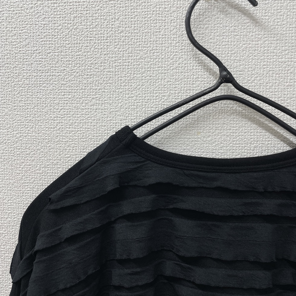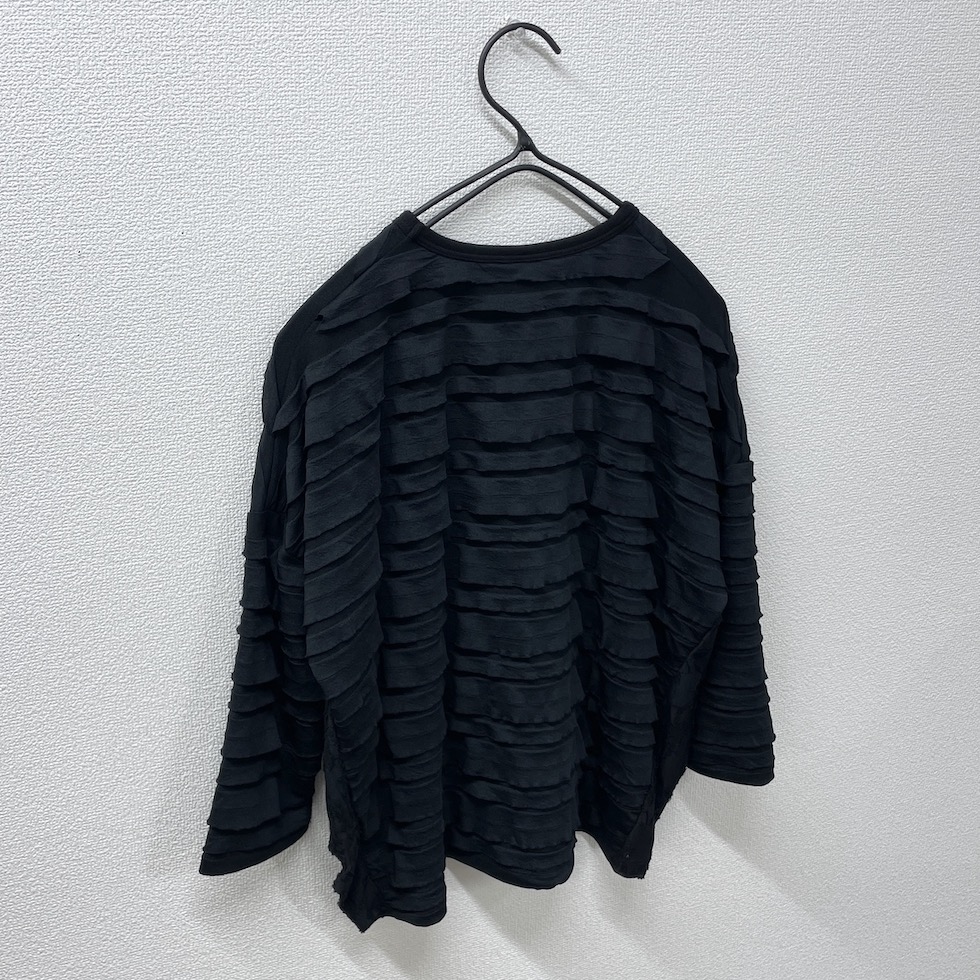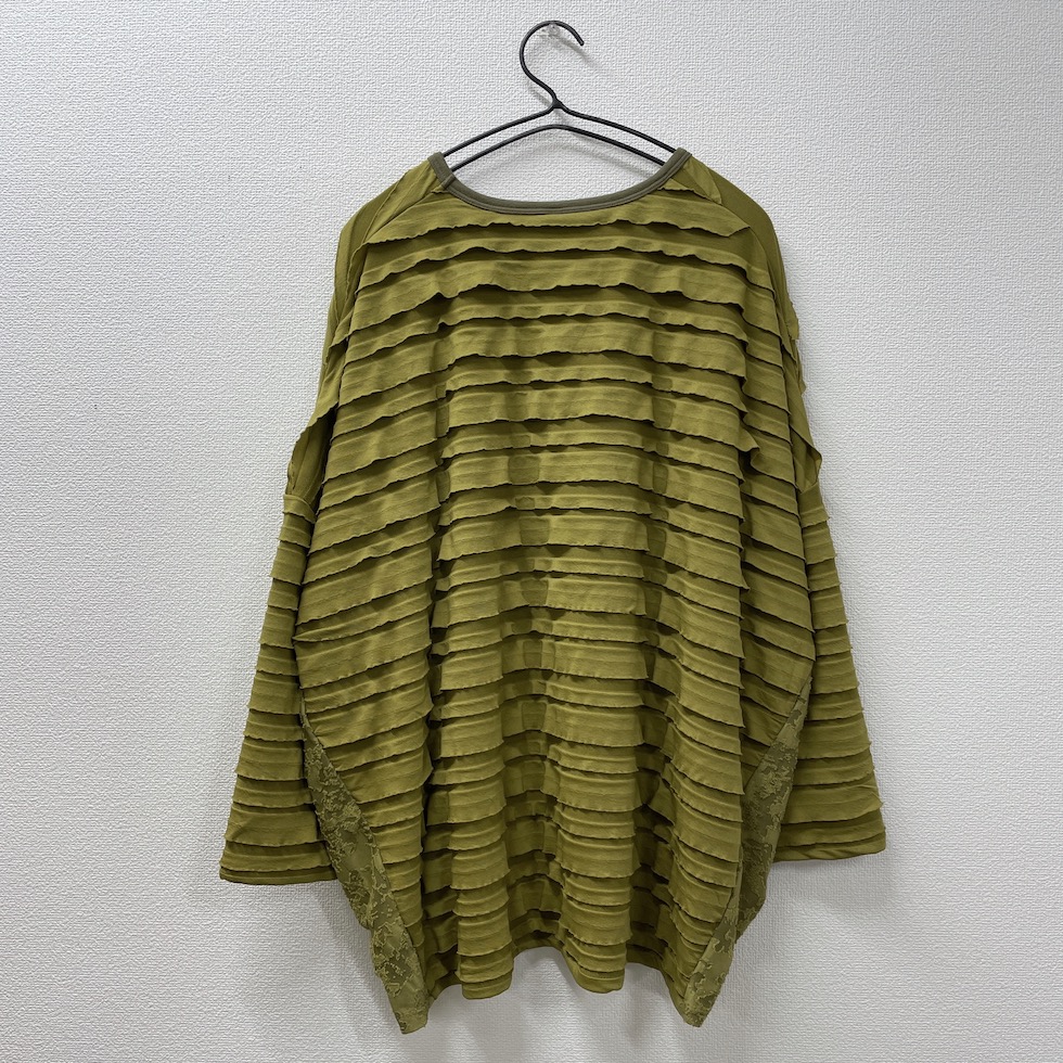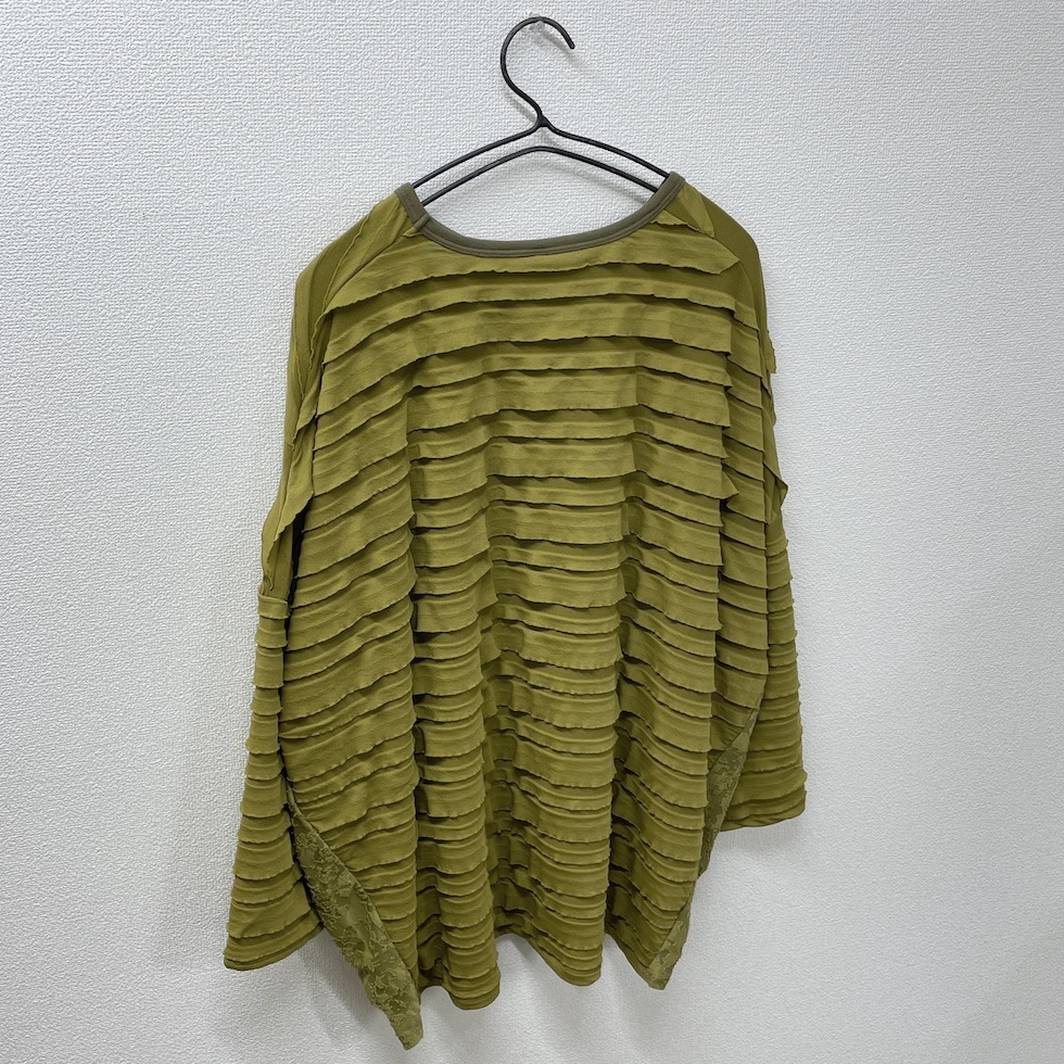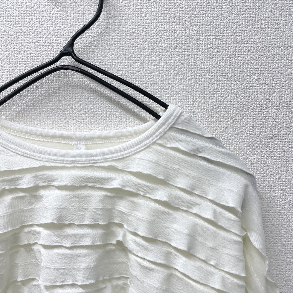 段々とした立体感が特徴の素材を全面に使用したバルーンシルエットのプルオーバー。袖から身頃にかけて程よくボリュームを持たせつつも、サイドを透け感のあるレーシージャガードで切り替えることで、抜け感と軽やかさをプラスしました。異素材の組み合わせが奥行きを生み、シンプルながらも印象的な一枚に仕上がっています。
