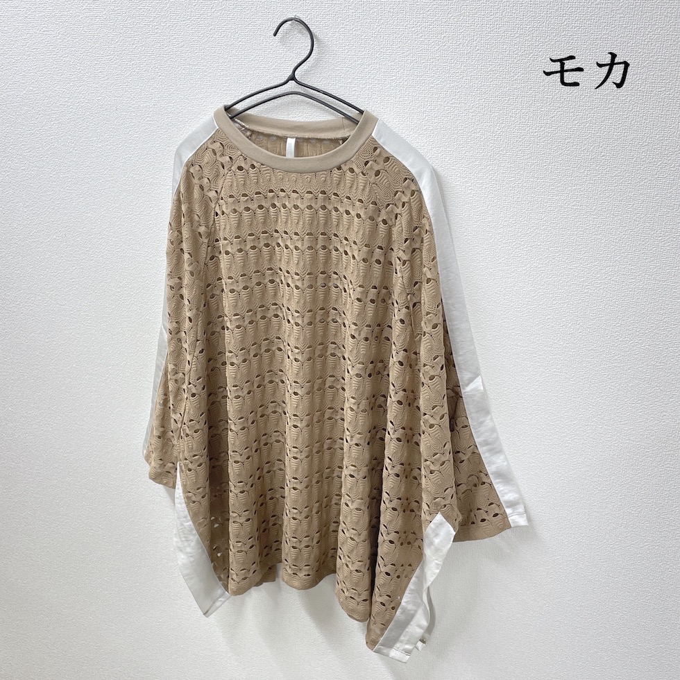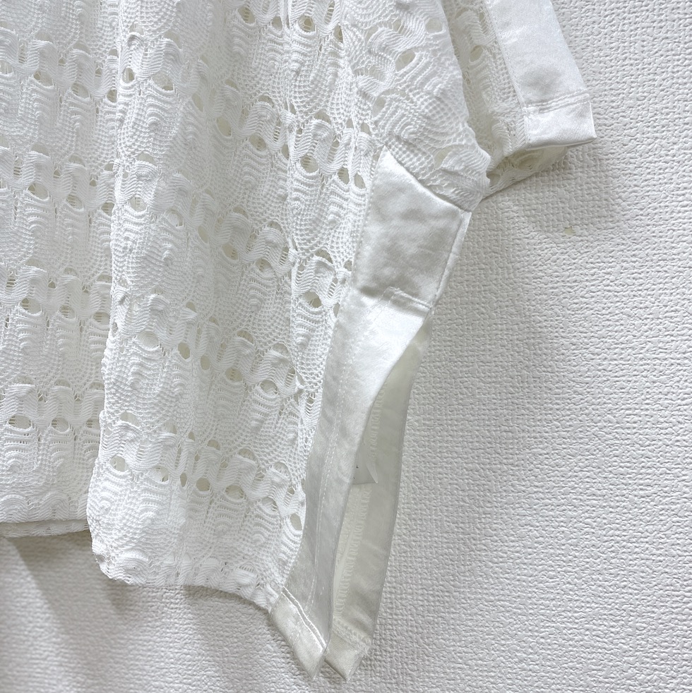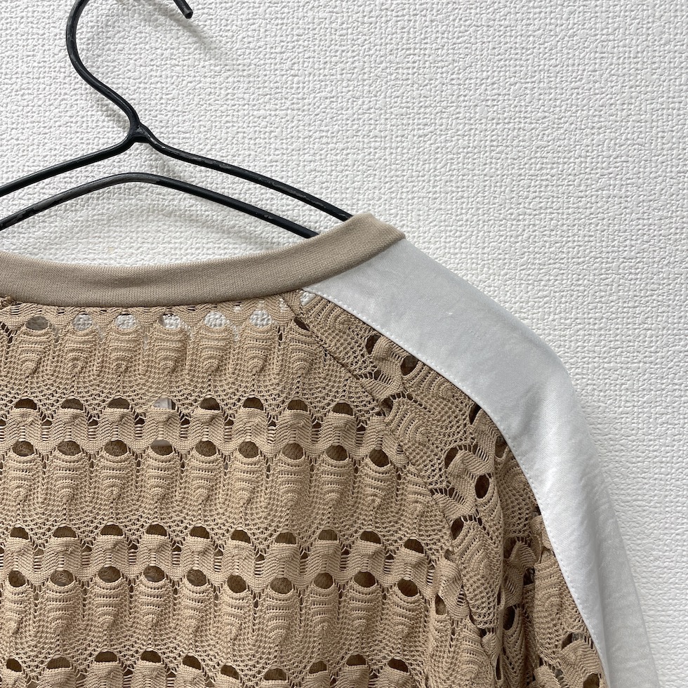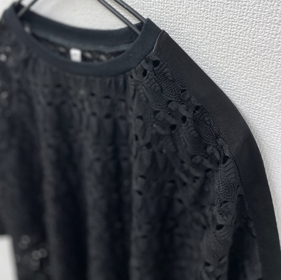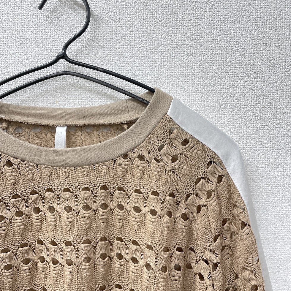 透かし編みのような立体感のある編地に、メタリック素材のラインをあしらったアクセントトップス。