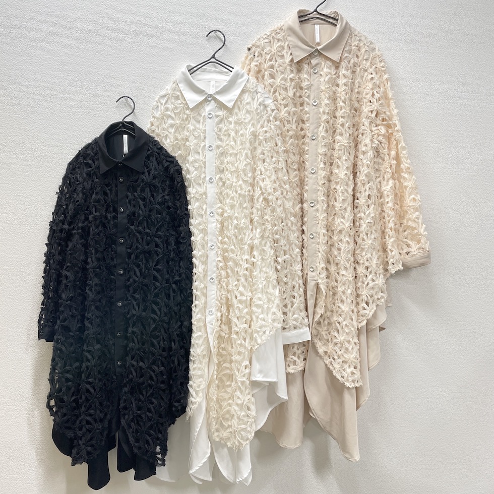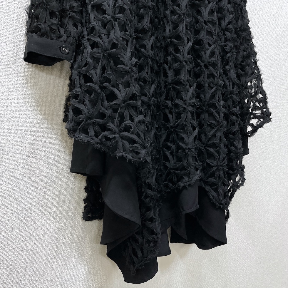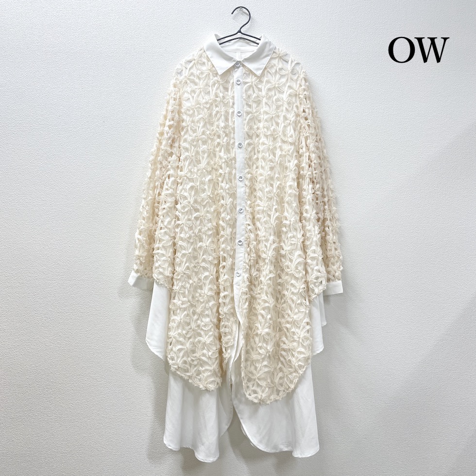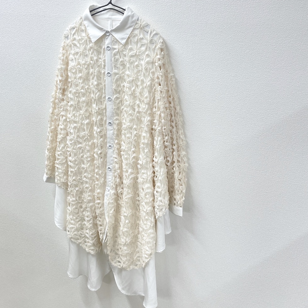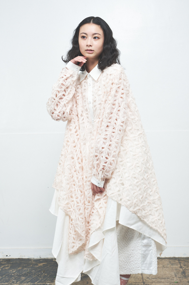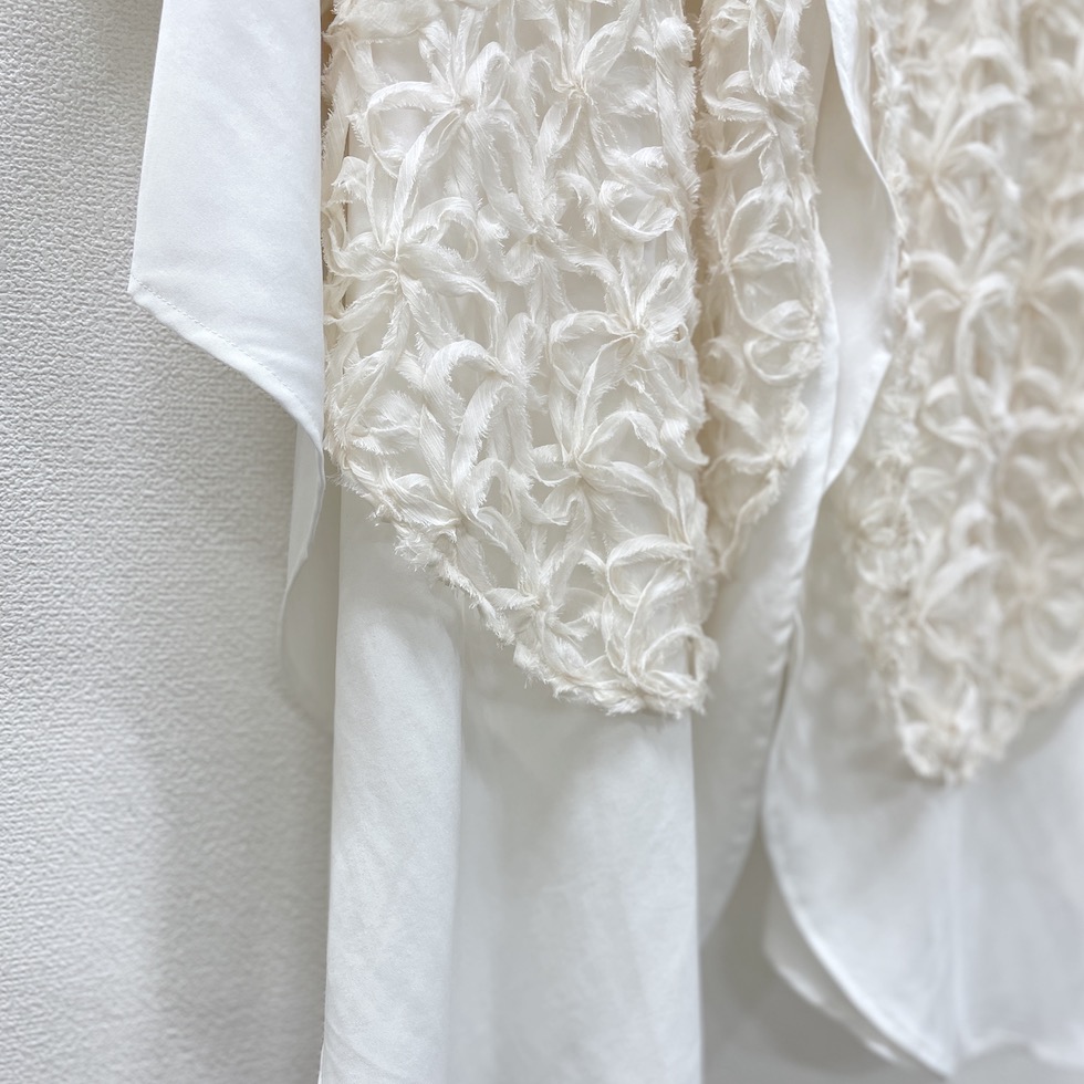 立体感のあるシフォンロープ素材に、T/R素材の裏地を合わせたワンピース。異素材を重ねたユニークな構築感と、動きの出る裾のレイヤードデザインが印象的です。