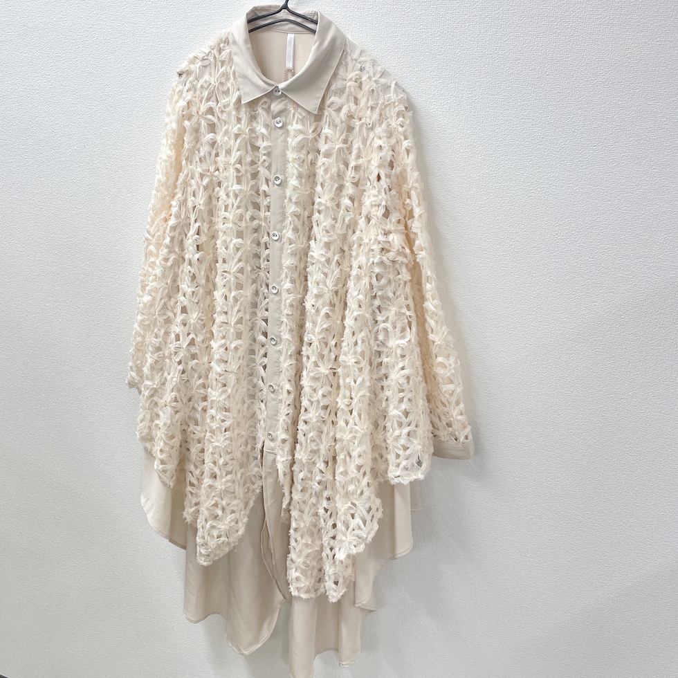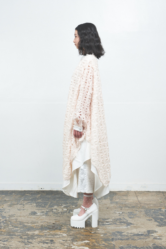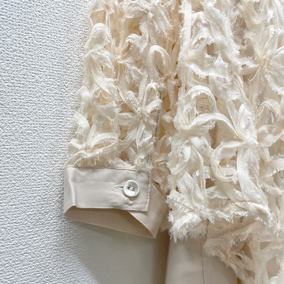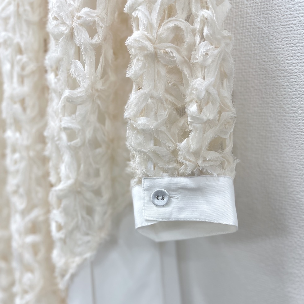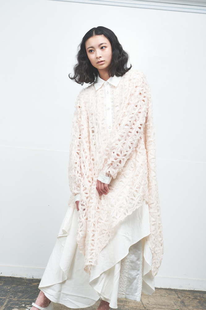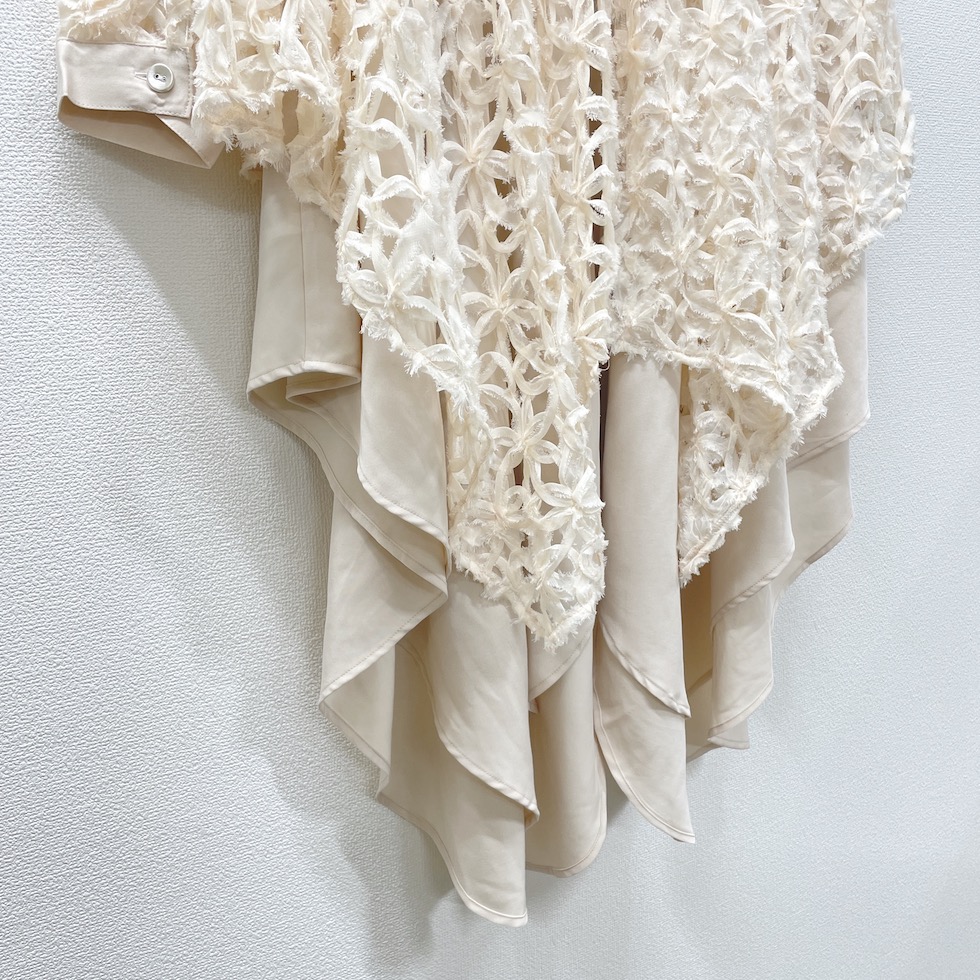 立体感のあるシフォンロープ素材に、T/R素材の裏地を合わせたワンピース。異素材を重ねたユニークな構築感と、動きの出る裾のレイヤードデザインが印象的です。