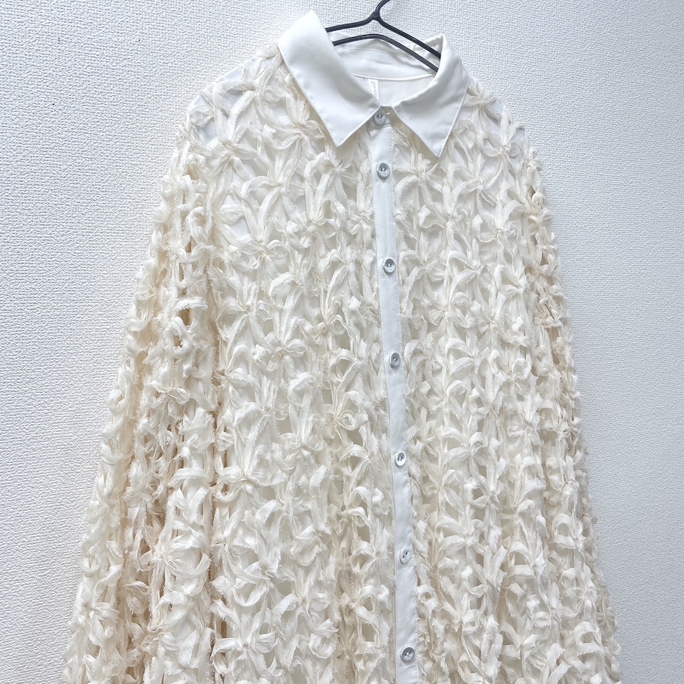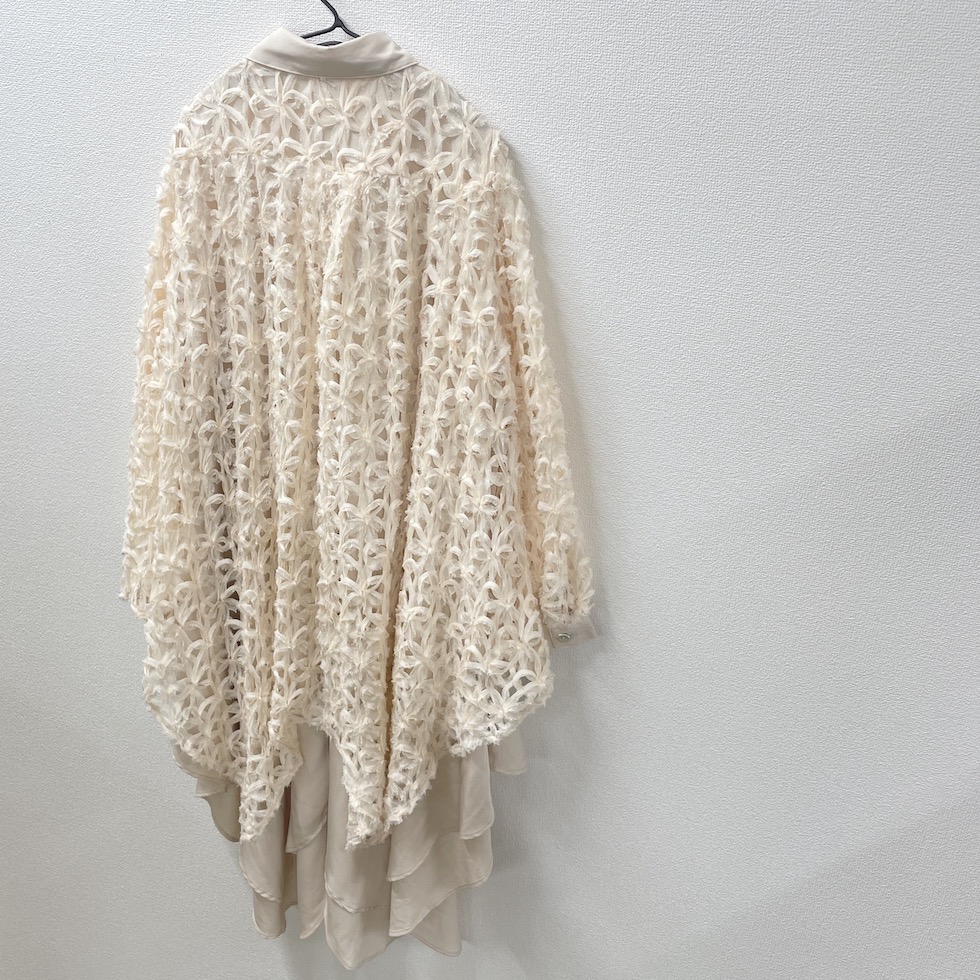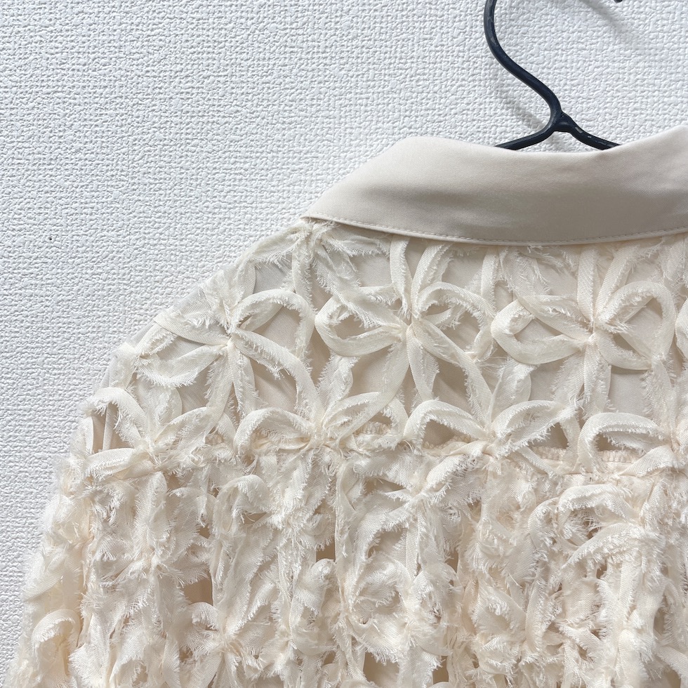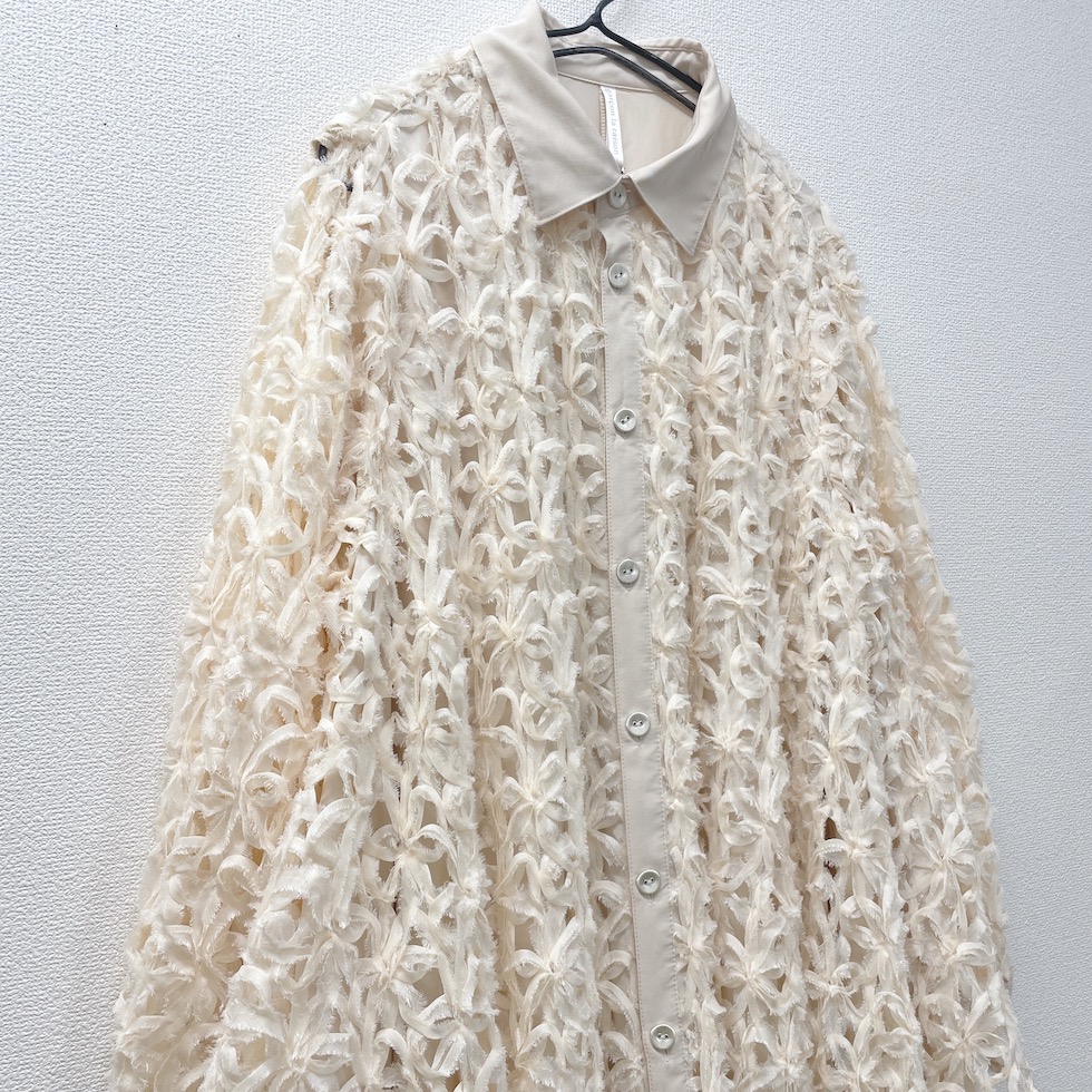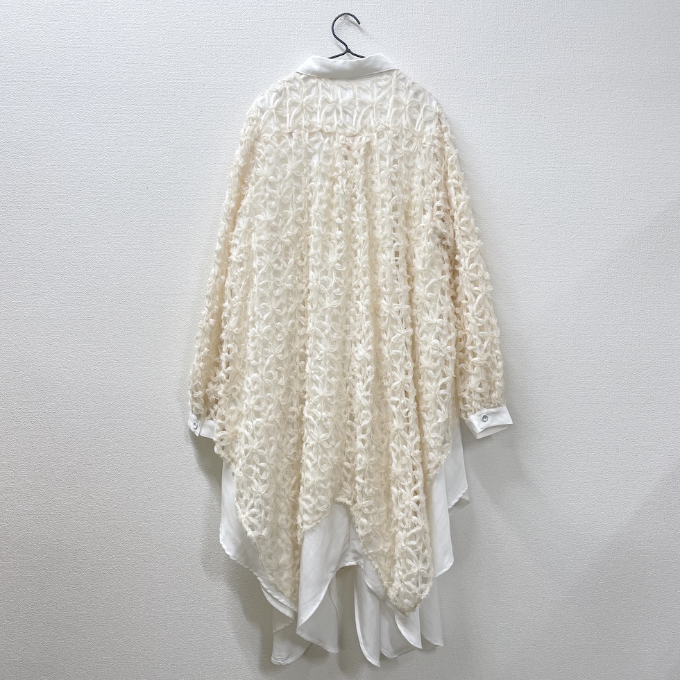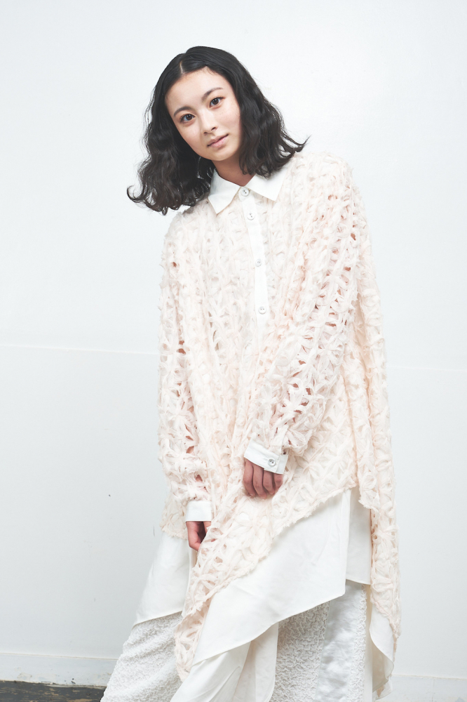 立体感のあるシフォンロープ素材に、T/R素材の裏地を合わせたワンピース。異素材を重ねたユニークな構築感と、動きの出る裾のレイヤードデザインが印象的です。