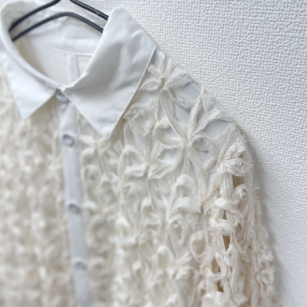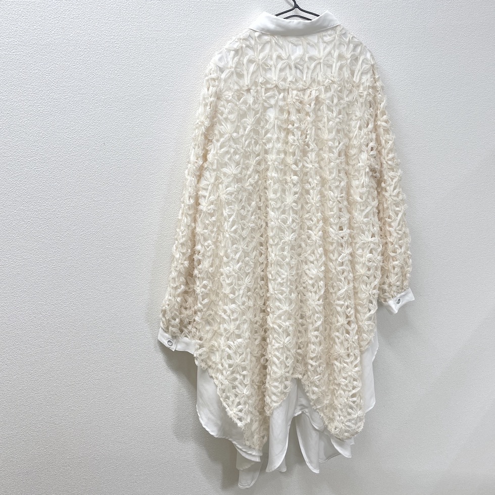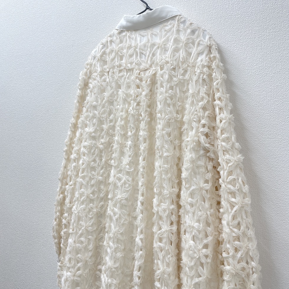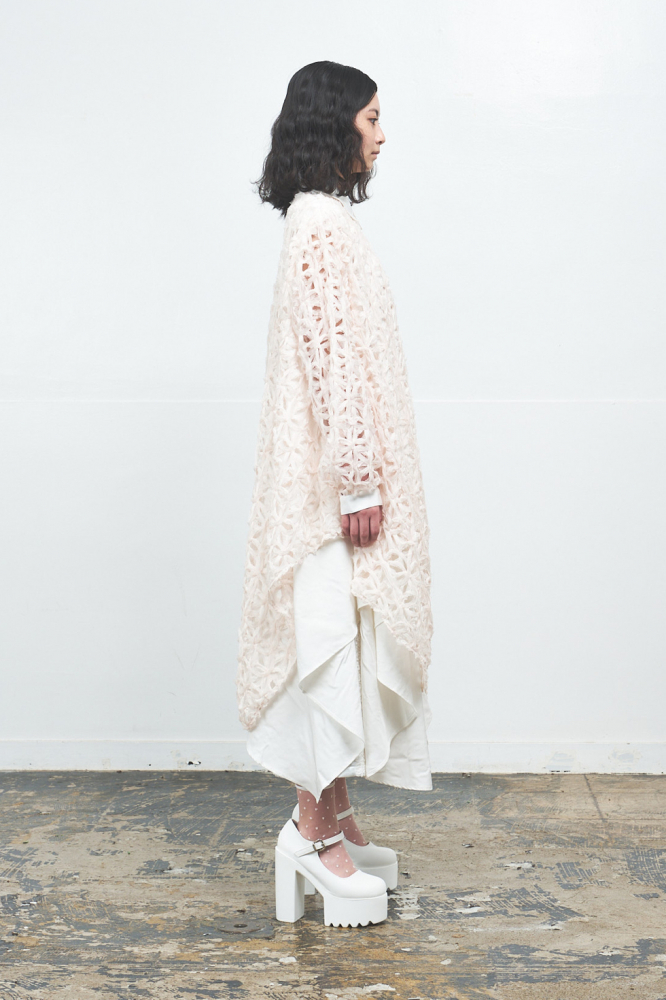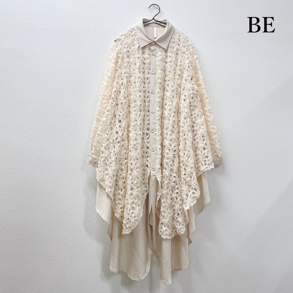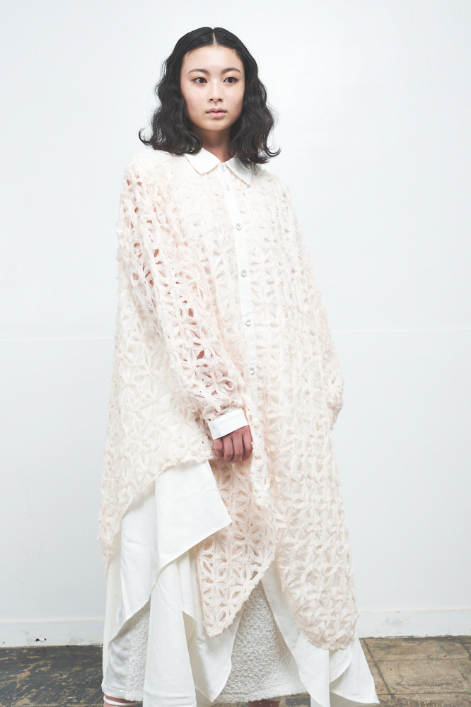 立体感のあるシフォンロープ素材に、T/R素材の裏地を合わせたワンピース。異素材を重ねたユニークな構築感と、動きの出る裾のレイヤードデザインが印象的です。