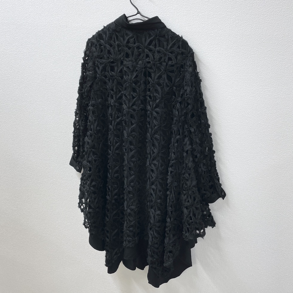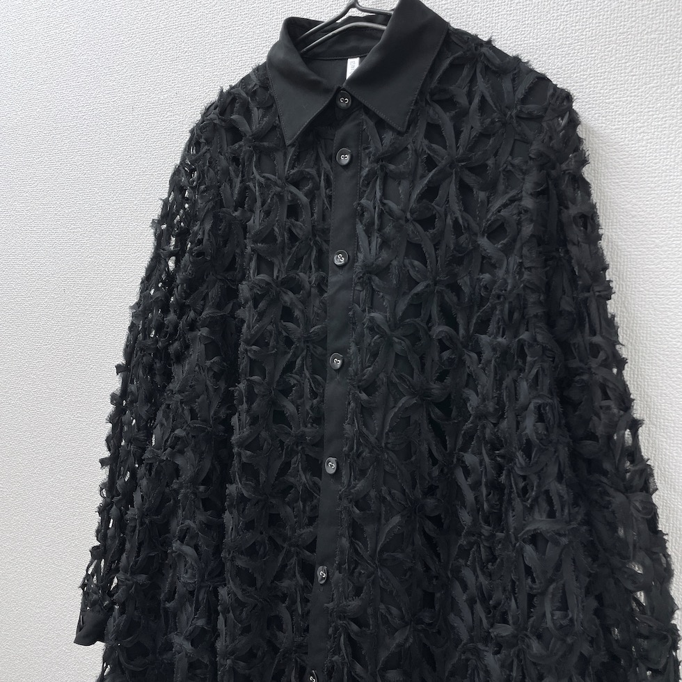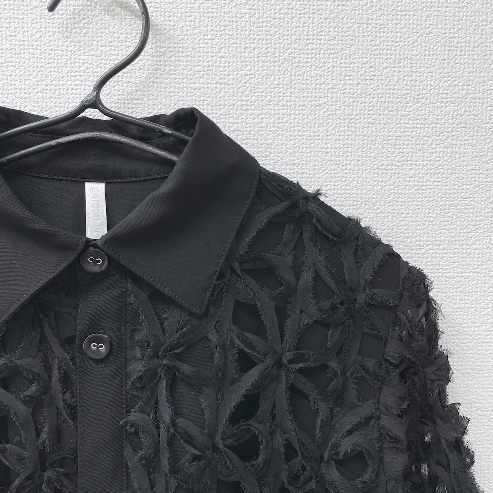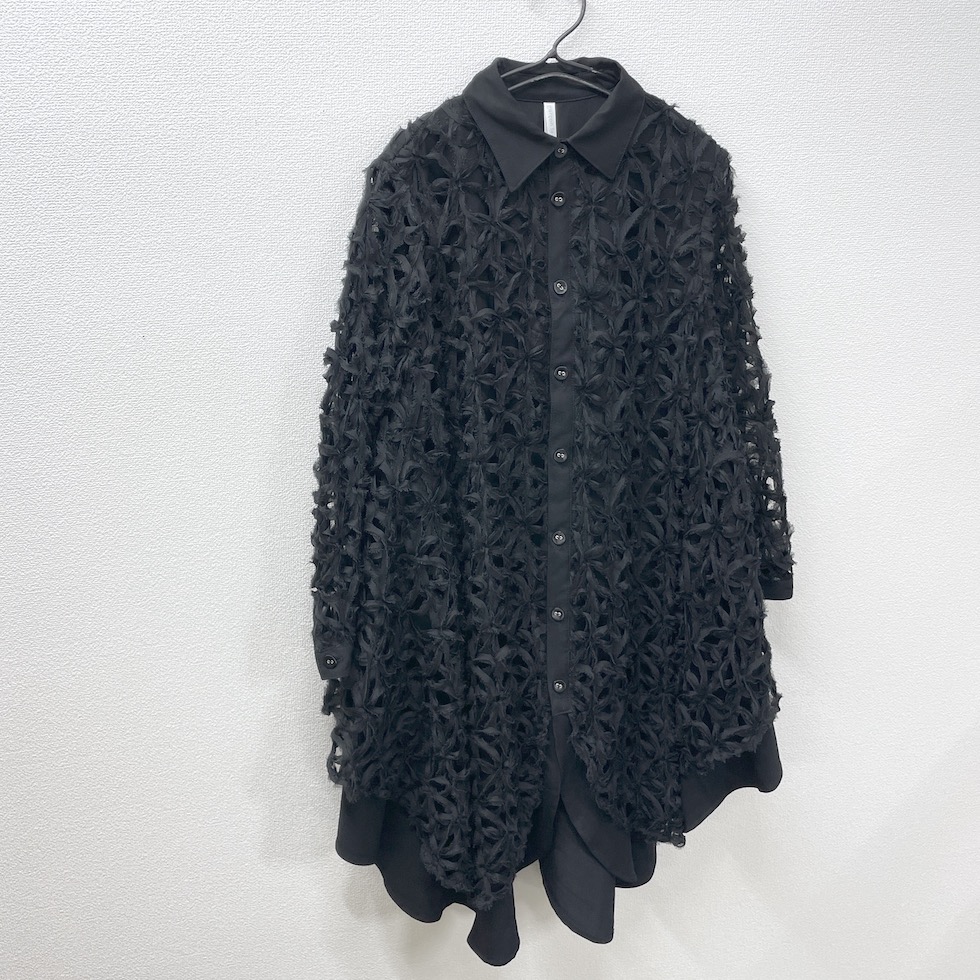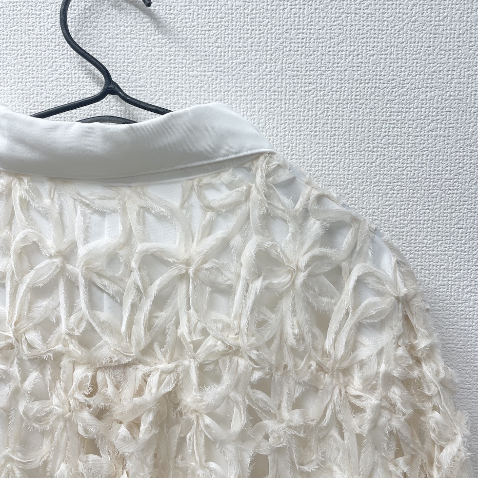 立体感のあるシフォンロープ素材に、T/R素材の裏地を合わせたワンピース。異素材を重ねたユニークな構築感と、動きの出る裾のレイヤードデザインが印象的です。