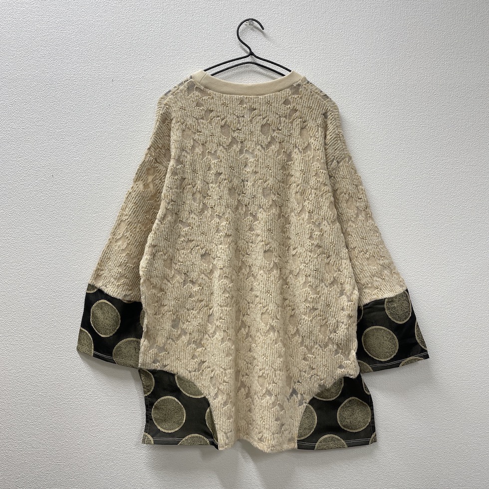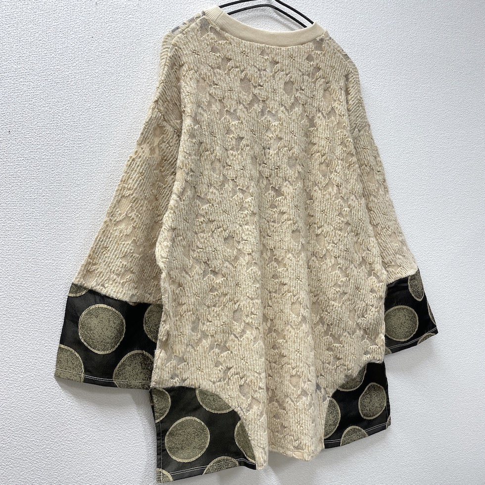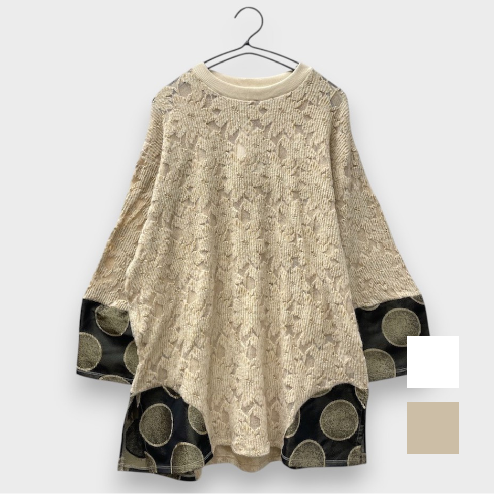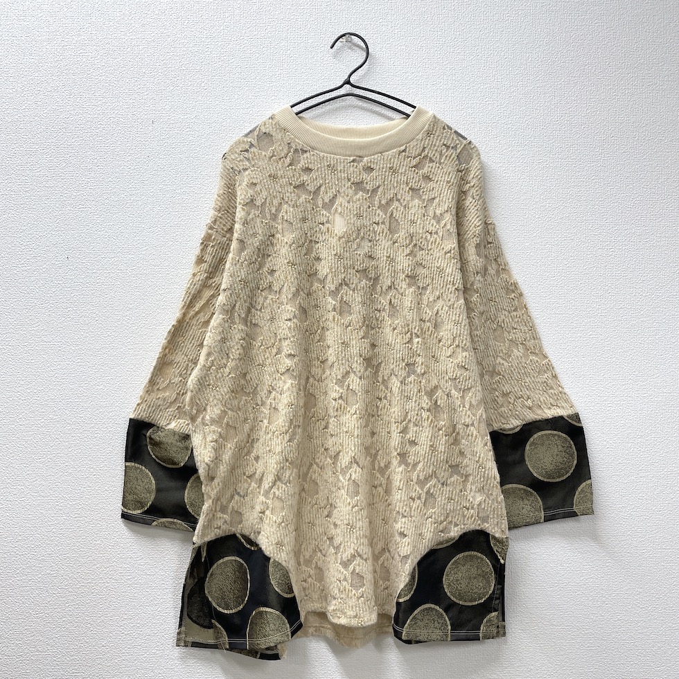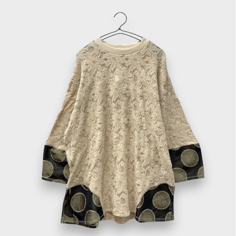 畦編みのネットジャガード生地を本体に使用し、繊細な透け感と軽やかさを実現したバルーンスリーブプルオーバー。袖と両サイドには、メタリックなサークル柄素材を大胆に切り替え、さり気ない光沢と遊び心あるパターンが、コーディネートに華やかさをプラスします。存在感あるバルーンスリーブは、程良いボリュームと丸みが特徴で、モードな雰囲気を演出します。