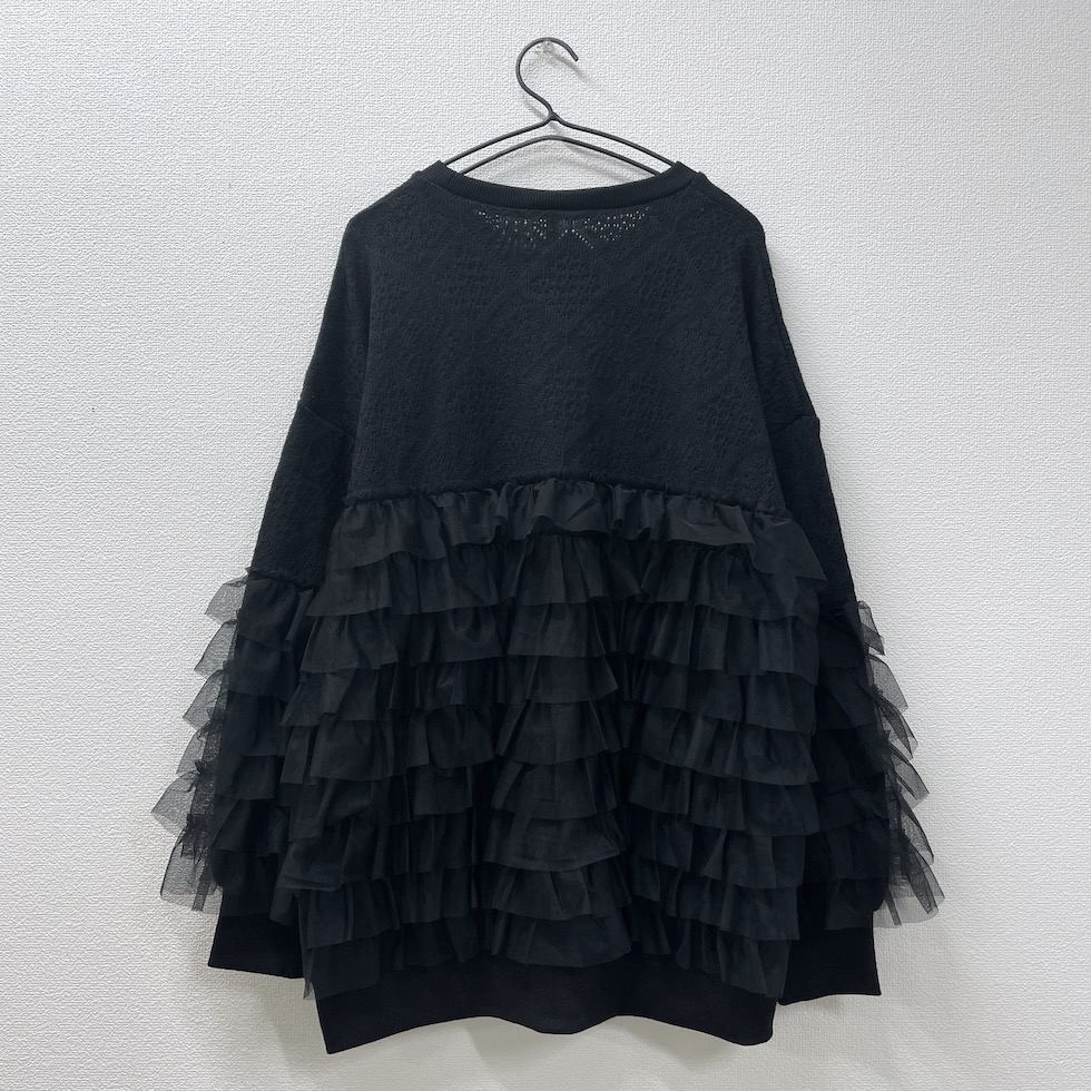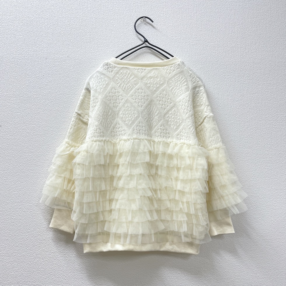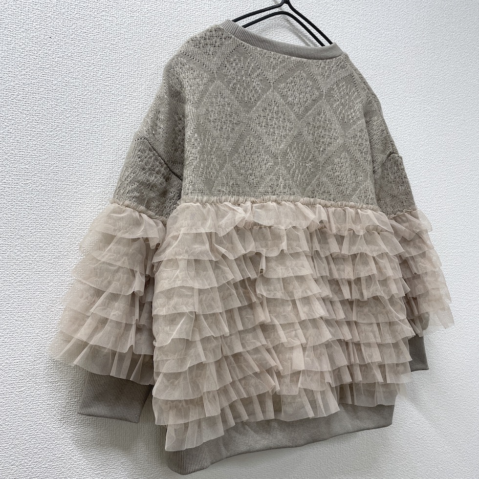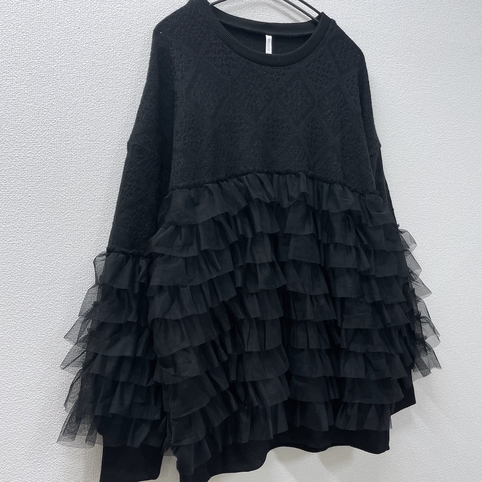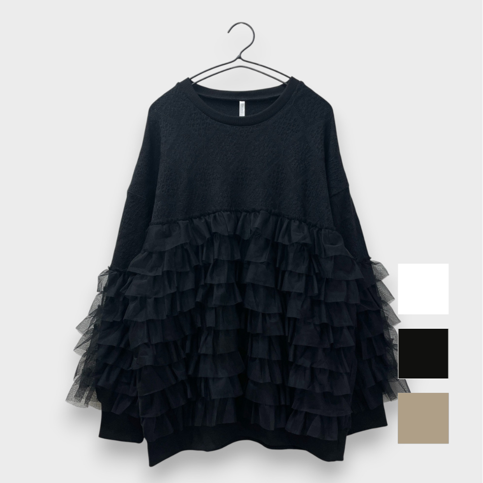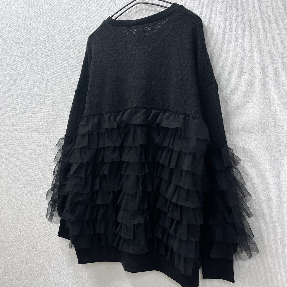 贅沢に重ねたフリルが目を惹くフリルトレーナー。上部はやわらかなかぎ針風のニット地で肌触りが良く、エレガントなダイヤ模様がポイント。フリルはネット生地でボリューム感がありながらも軽やかで、透明感と立体感演出。カジュアルからドレッシーまで幅広く着回せます。コーディネートの主役として、日常を彩る贅沢なフリルトレーナーをお楽しみください。