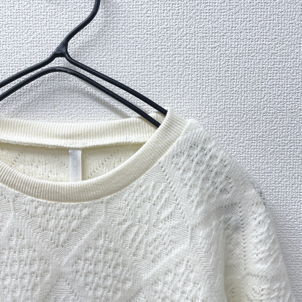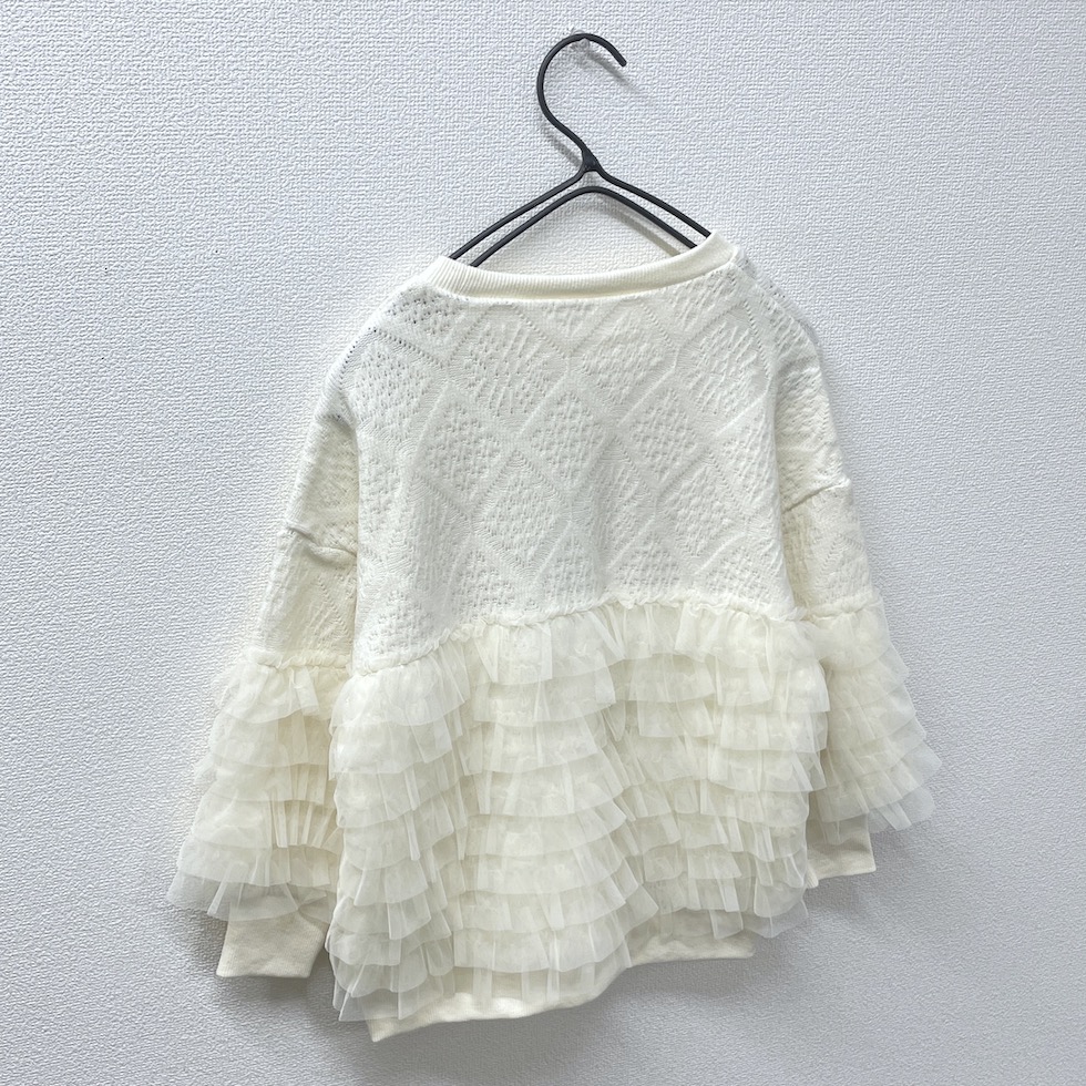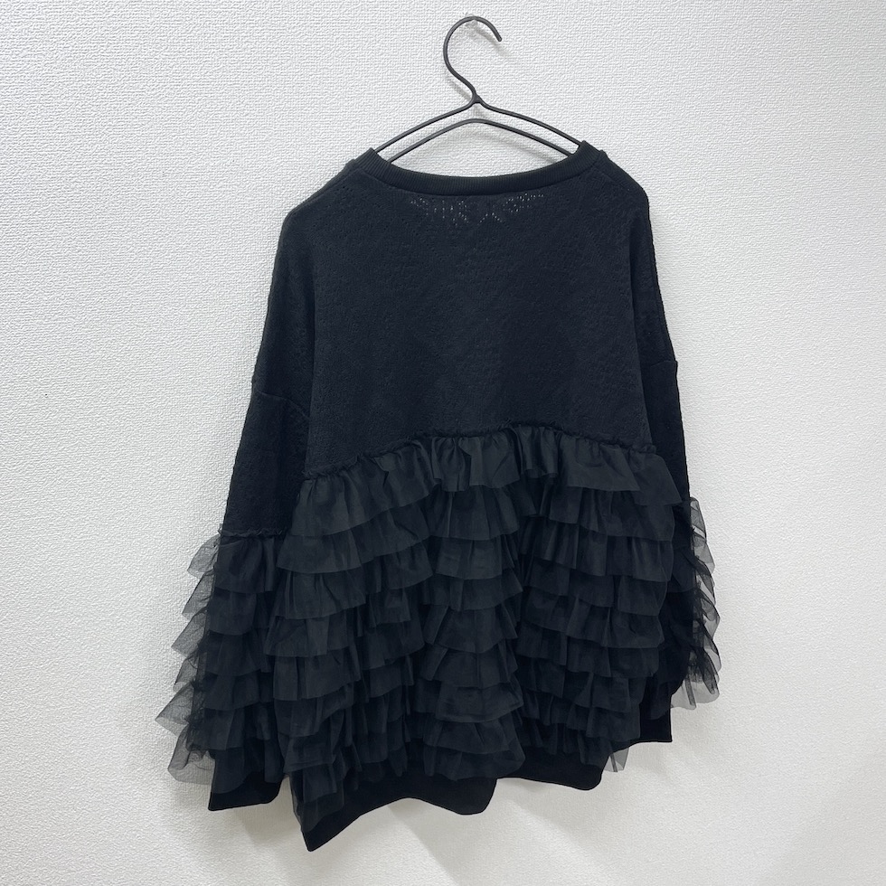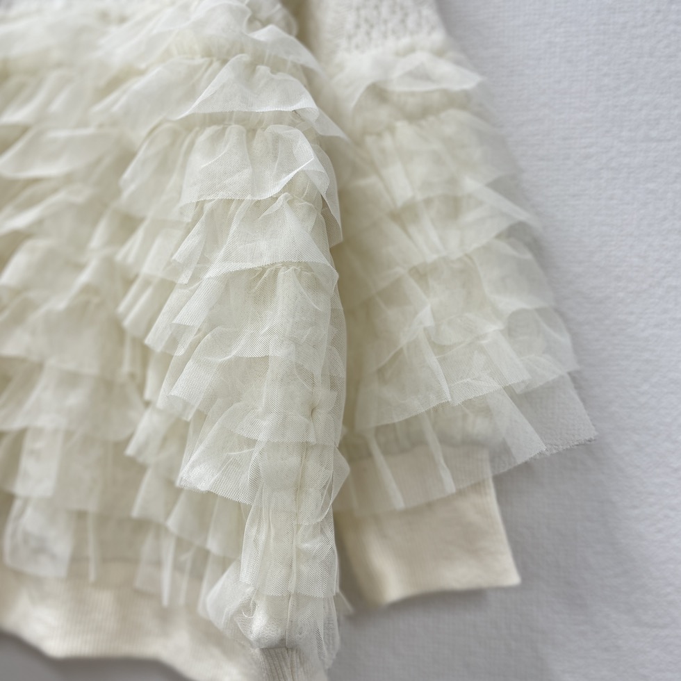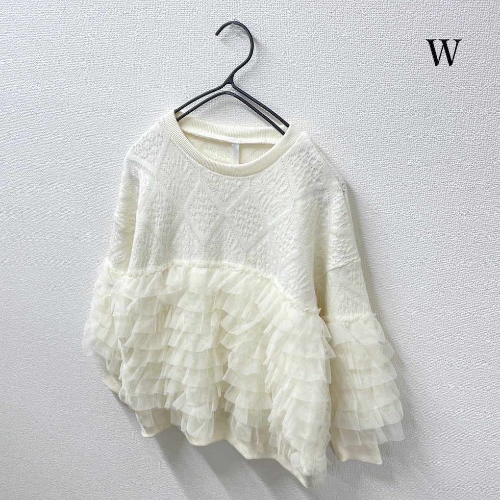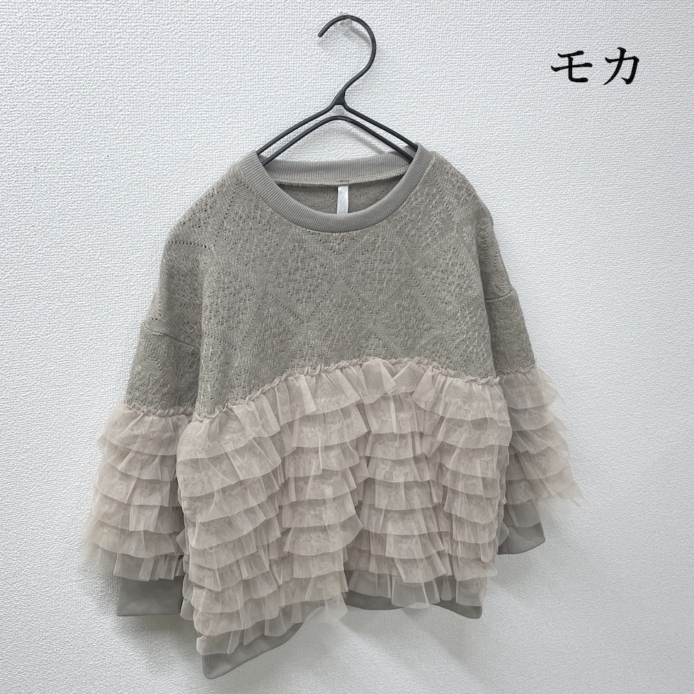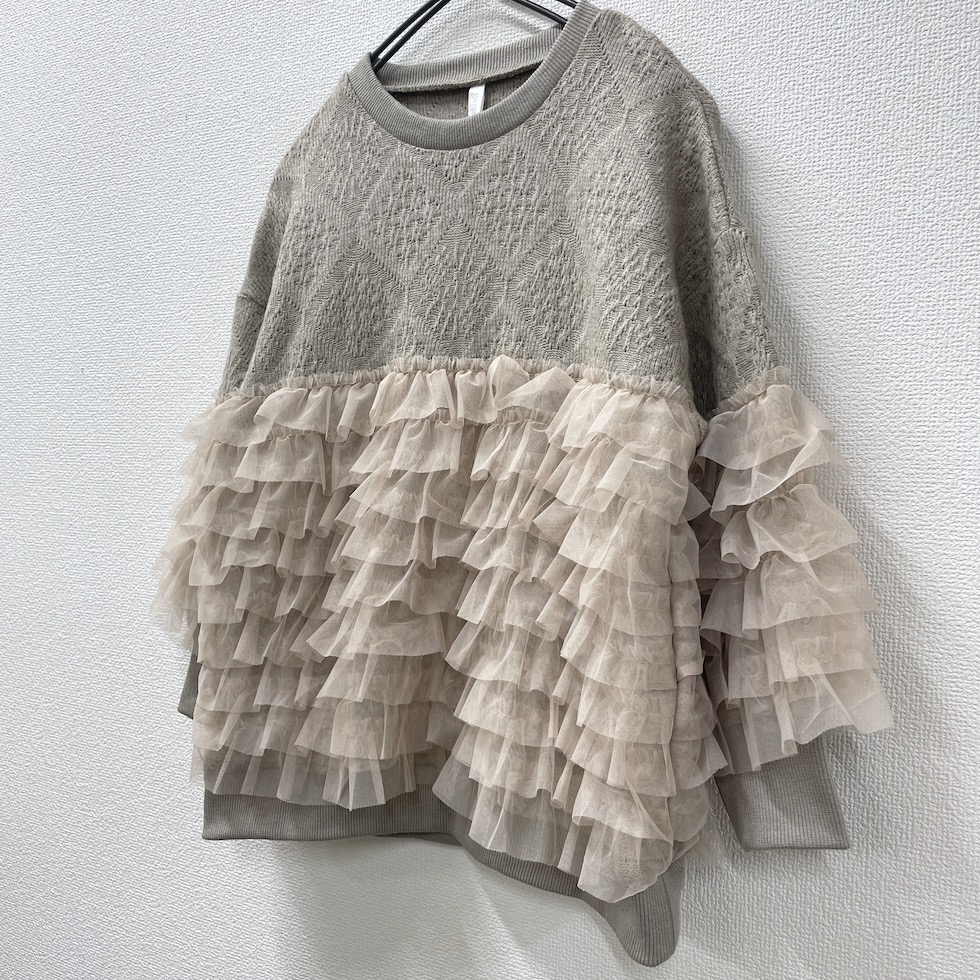 贅沢に重ねたフリルが目を惹くフリルトレーナー。上部はやわらかなかぎ針風のニット地で肌触りが良く、エレガントなダイヤ模様がポイント。フリルはネット生地でボリューム感がありながらも軽やかで、透明感と立体感演出。カジュアルからドレッシーまで幅広く着回せます。コーディネートの主役として、日常を彩る贅沢なフリルトレーナーをお楽しみください。