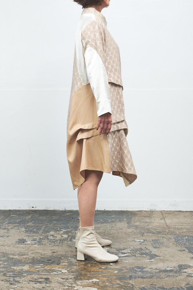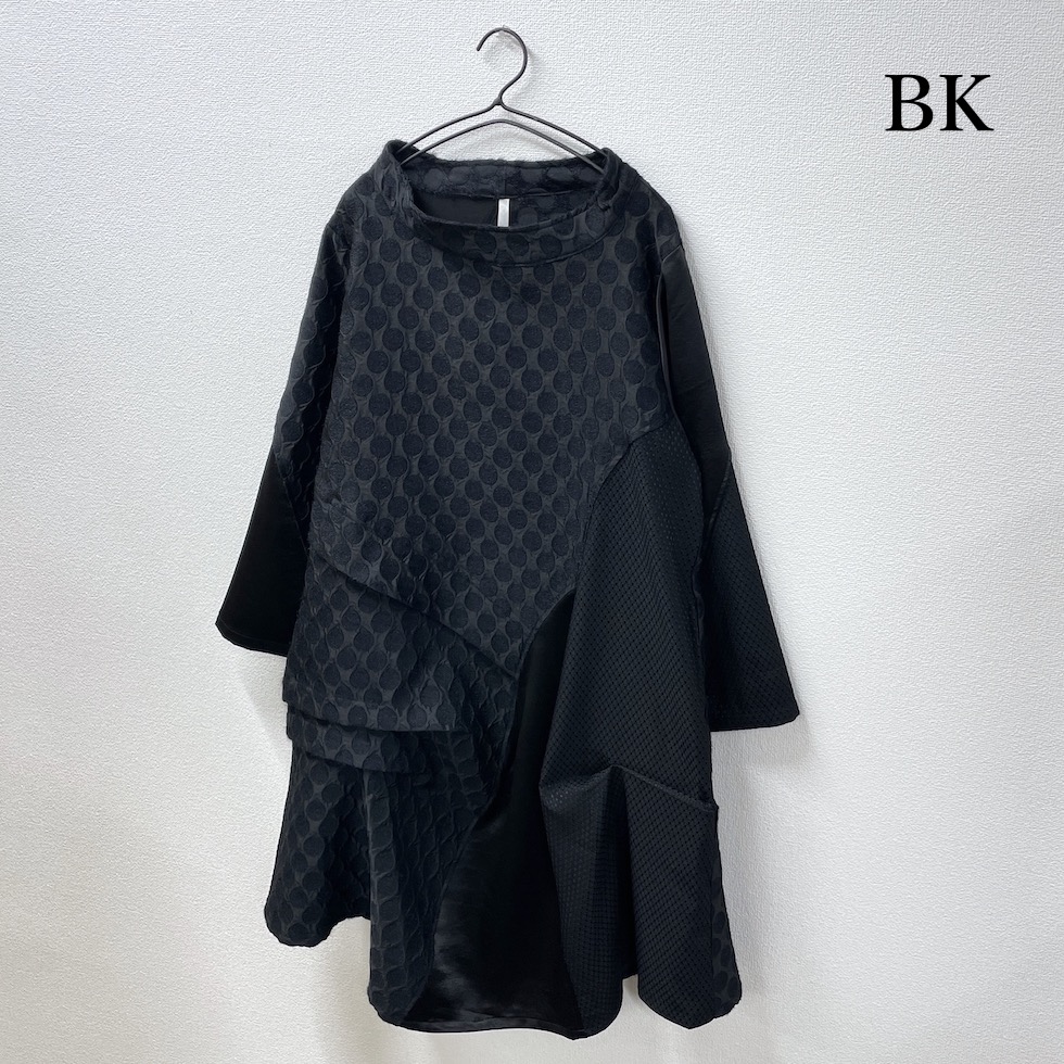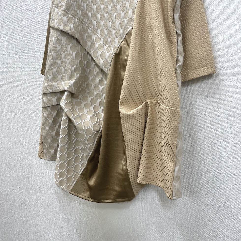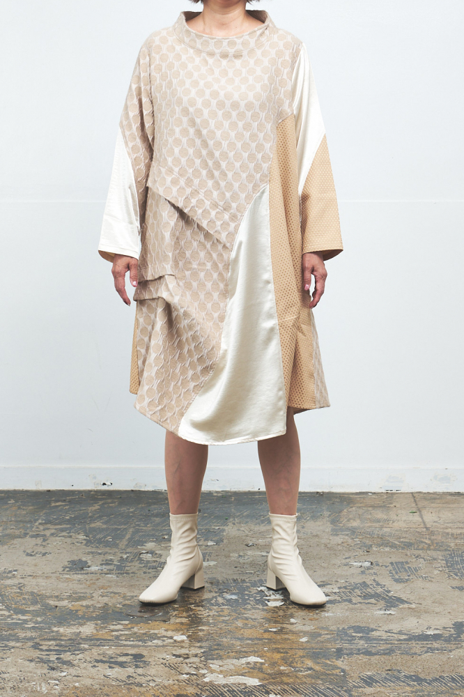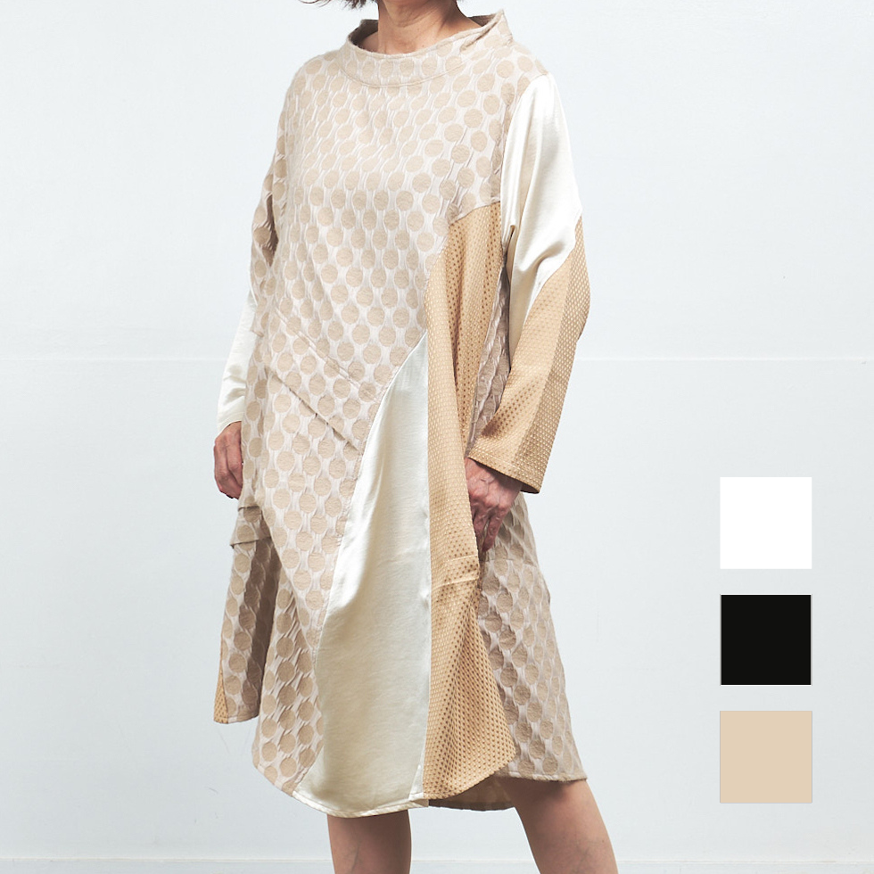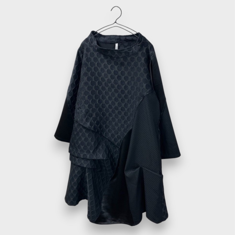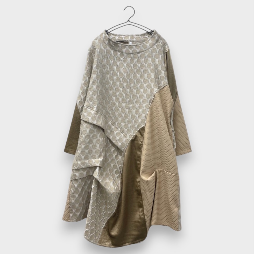 異素材の組み合わせが目を引く、立体的なアシンメトリーワンピース。ドットジャガード、ブロックライン、メタリックサテンなど、表情豊かな素材を巧みに切り替えた一枚です。タックやカーブラインが構築的なフォルムを生み出し、動きのあるシルエットに。洗練されたデザインは、デイリーから特別な日まで幅広く活躍します。