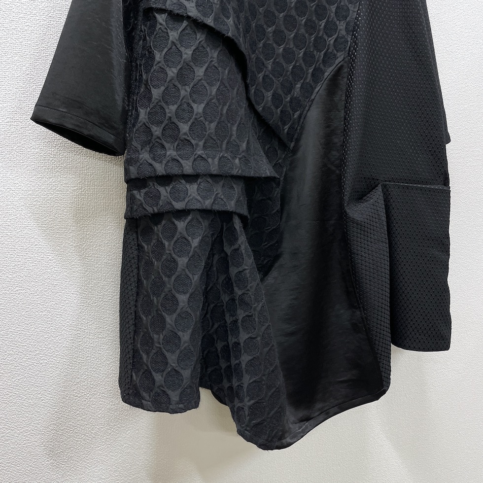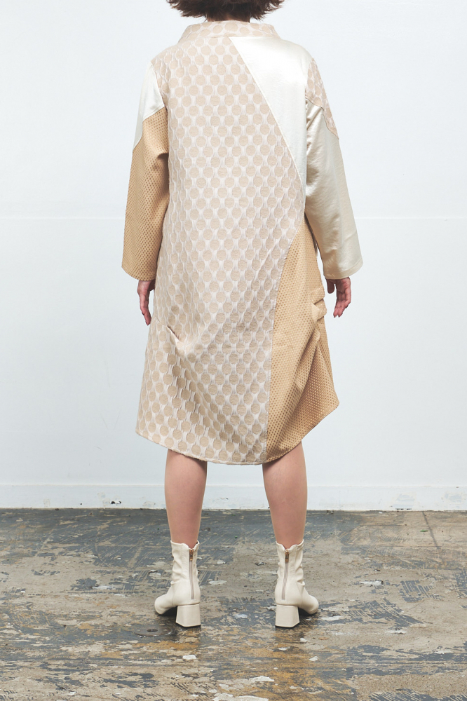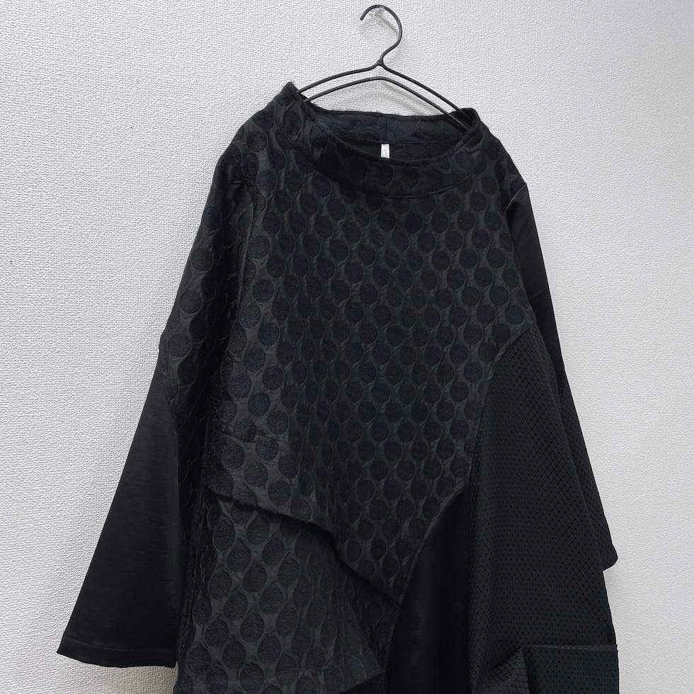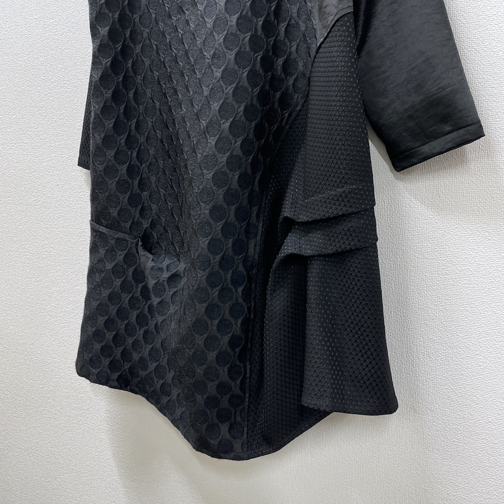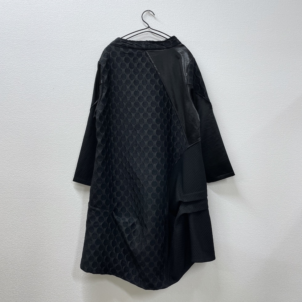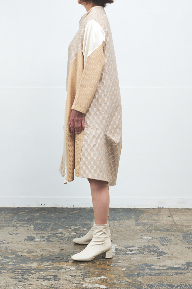 異素材の組み合わせが目を引く、立体的なアシンメトリーワンピース。ドットジャガード、ブロックライン、メタリックサテンなど、表情豊かな素材を巧みに切り替えた一枚です。タックやカーブラインが構築的なフォルムを生み出し、動きのあるシルエットに。洗練されたデザインは、デイリーから特別な日まで幅広く活躍します。