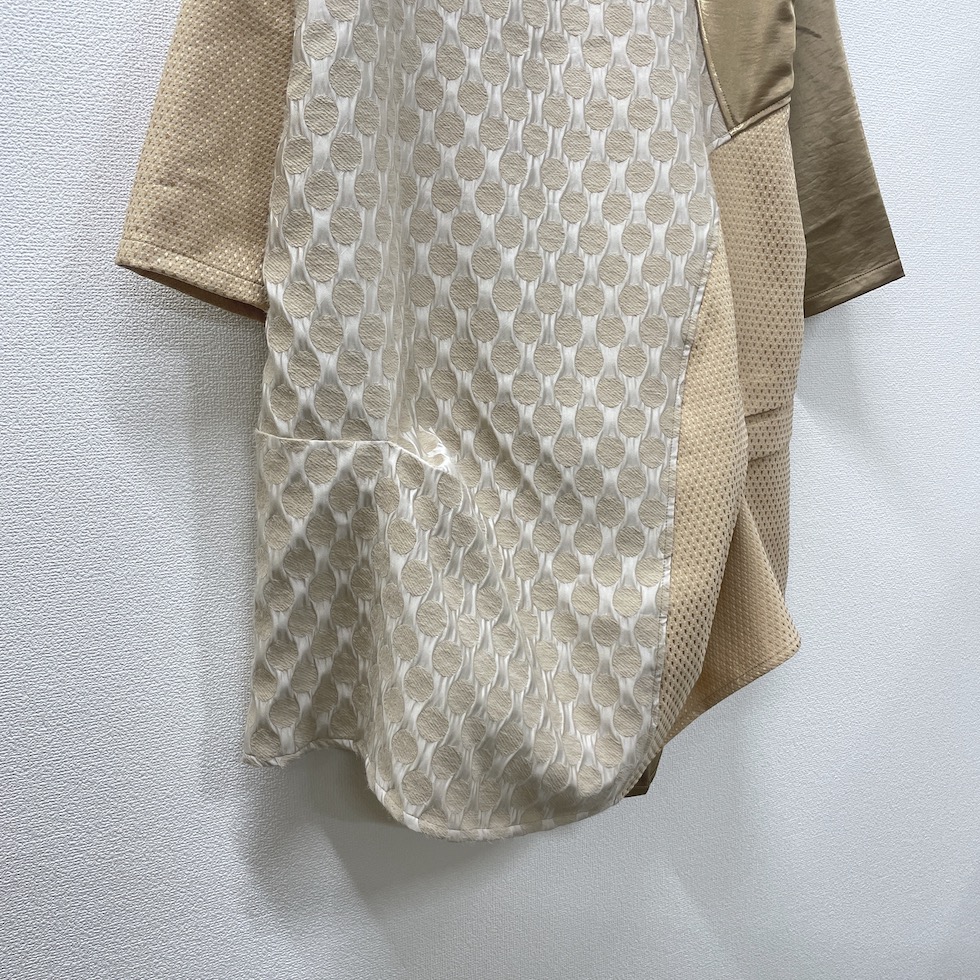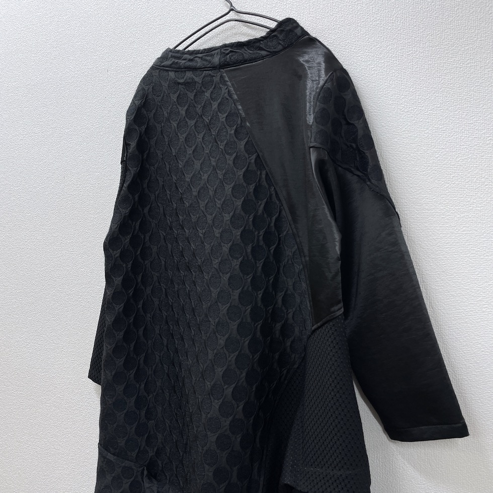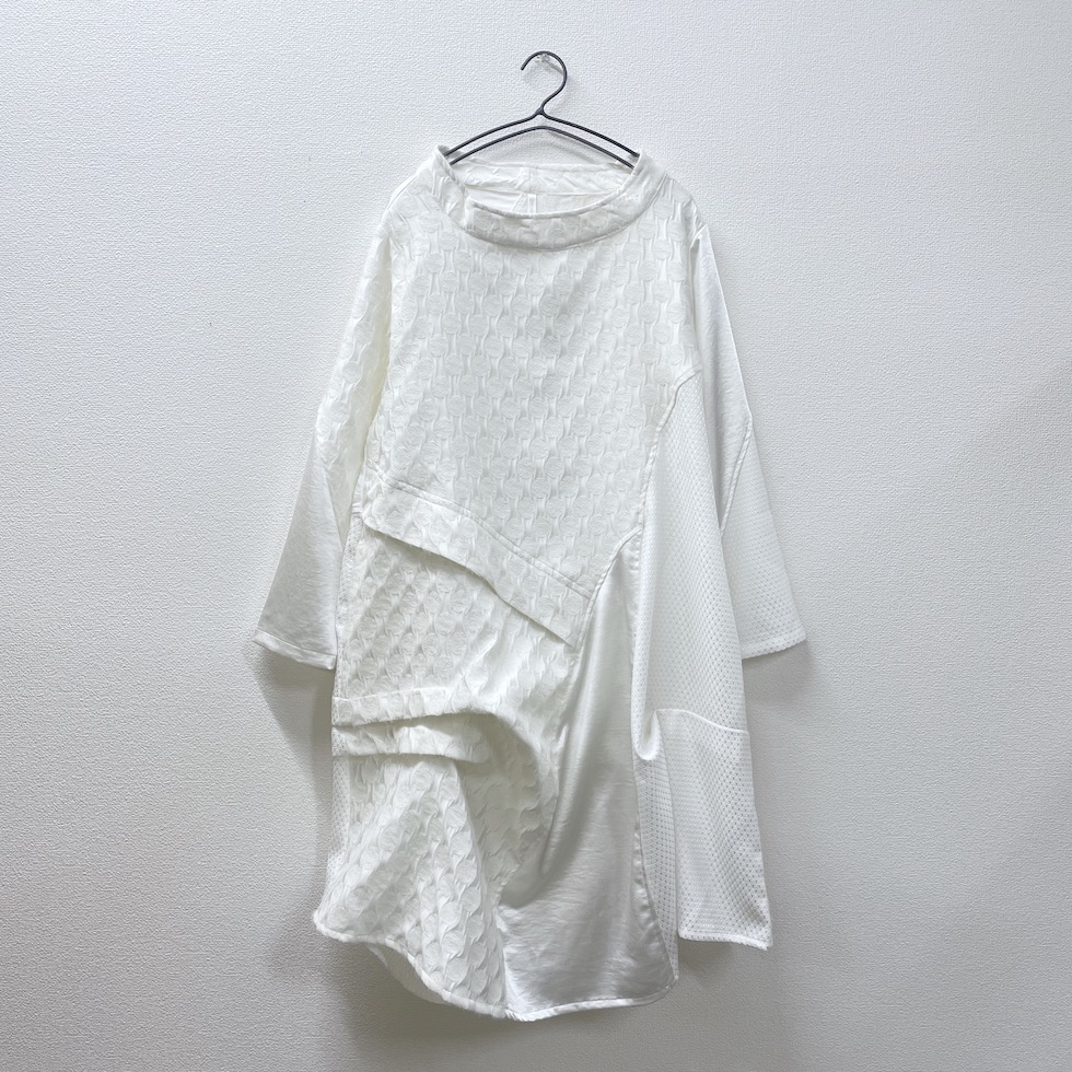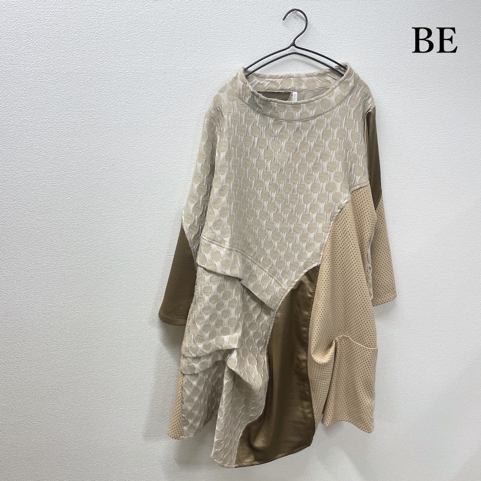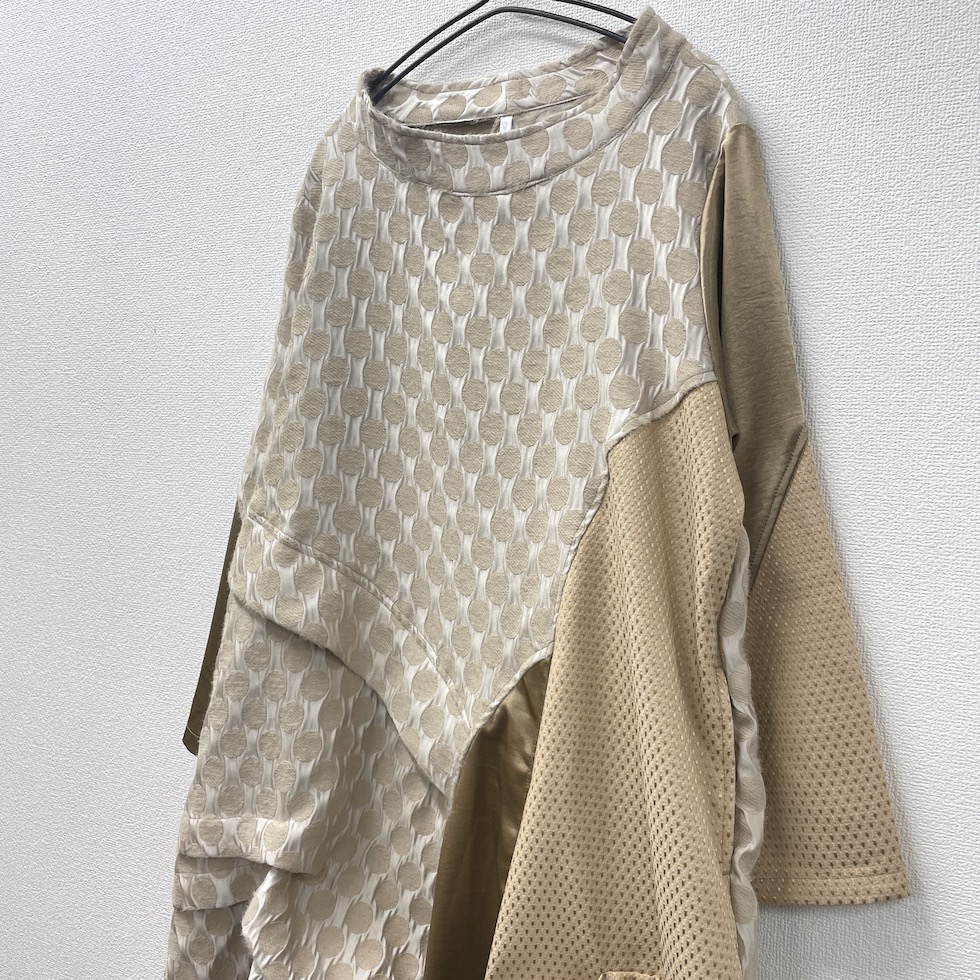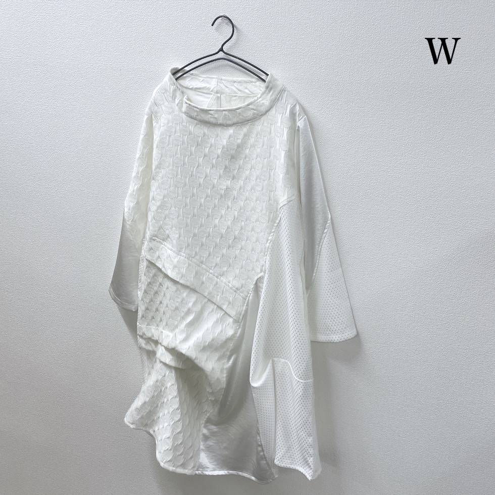 異素材の組み合わせが目を引く、立体的なアシンメトリーワンピース。ドットジャガード、ブロックライン、メタリックサテンなど、表情豊かな素材を巧みに切り替えた一枚です。タックやカーブラインが構築的なフォルムを生み出し、動きのあるシルエットに。洗練されたデザインは、デイリーから特別な日まで幅広く活躍します。