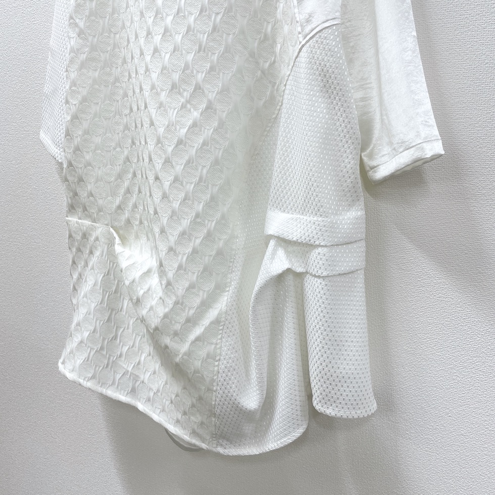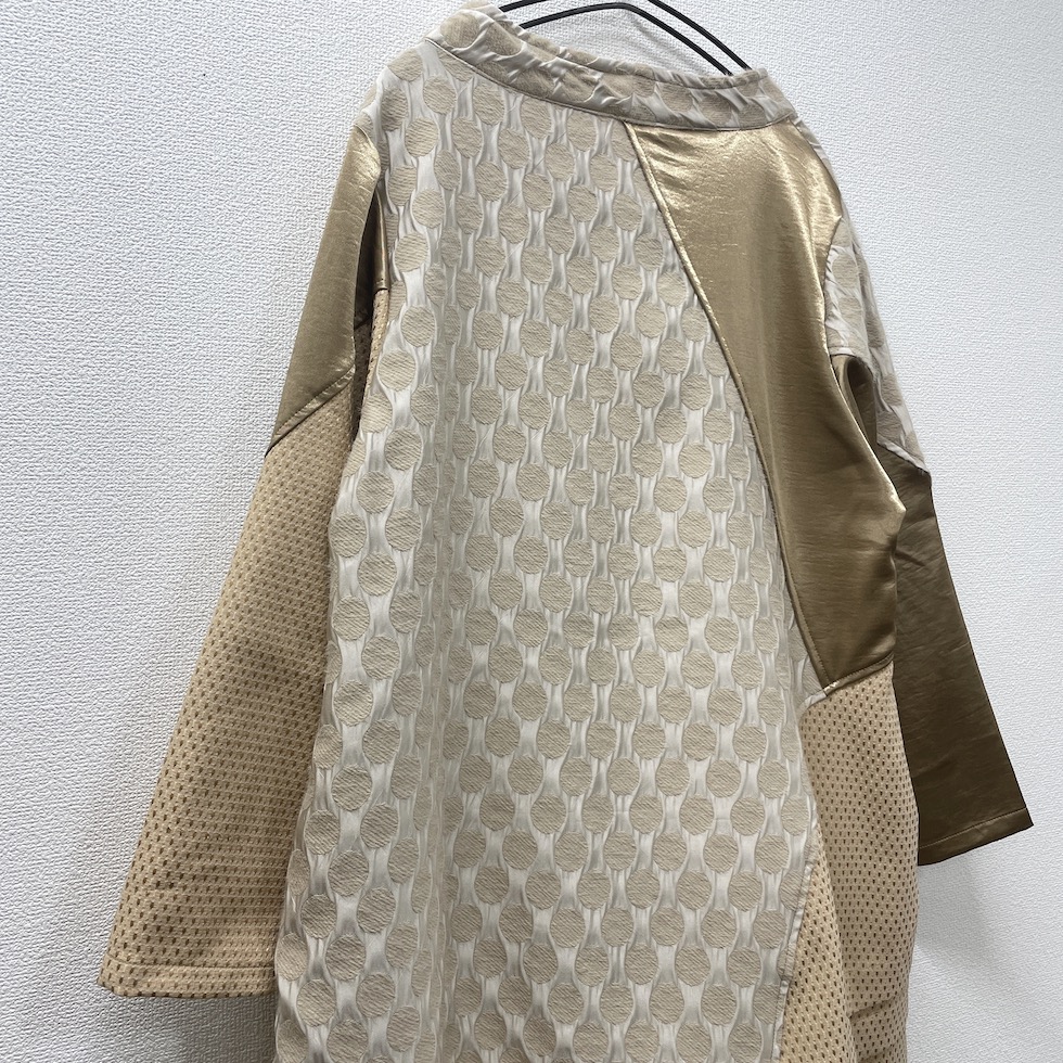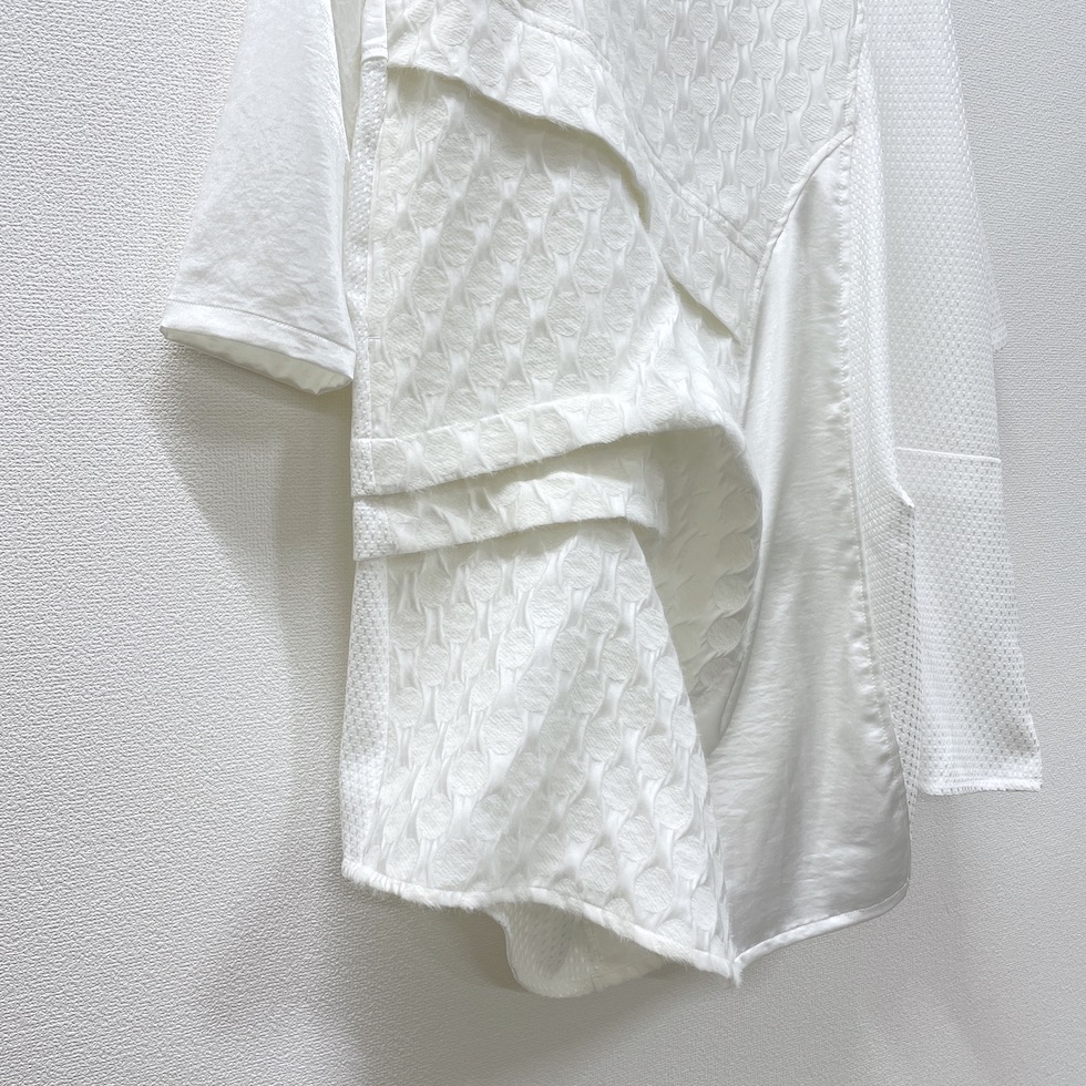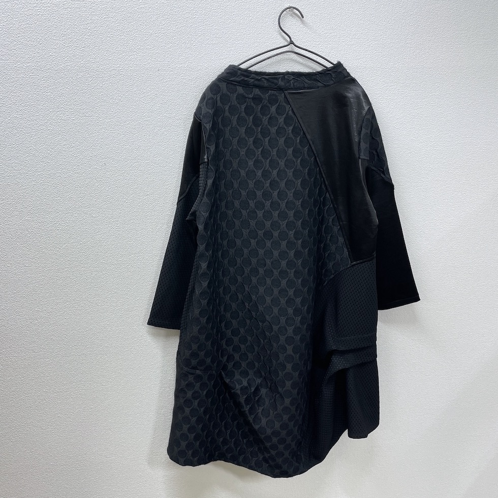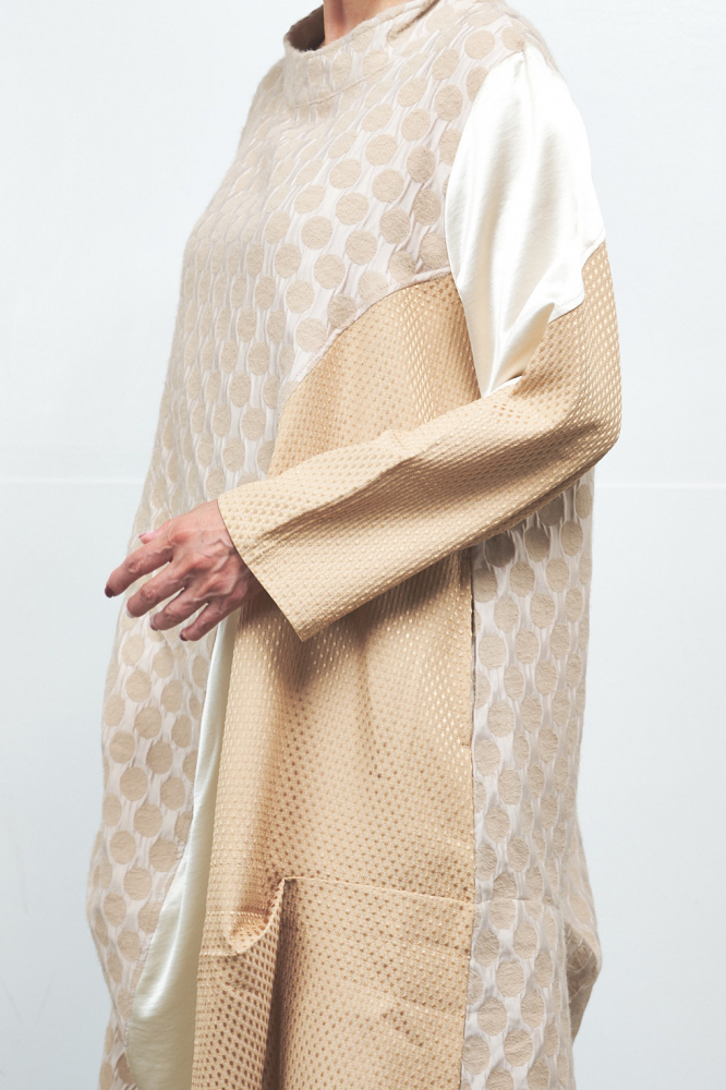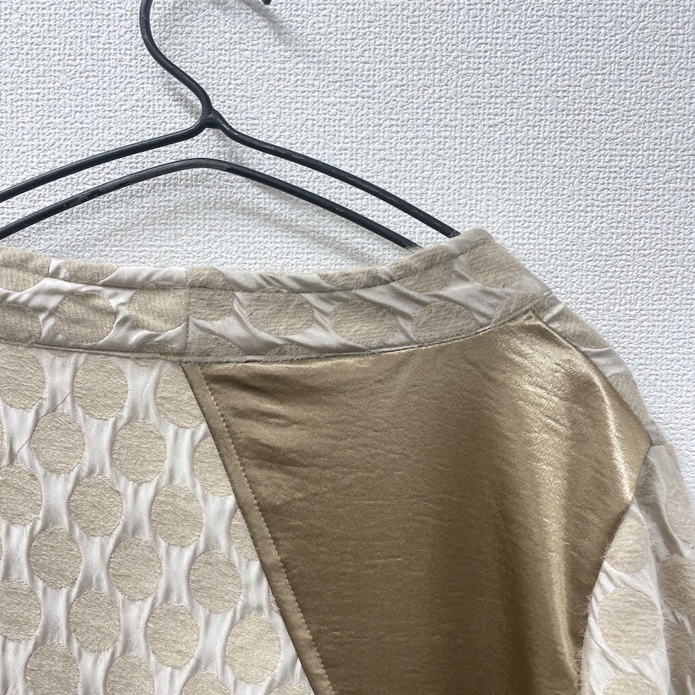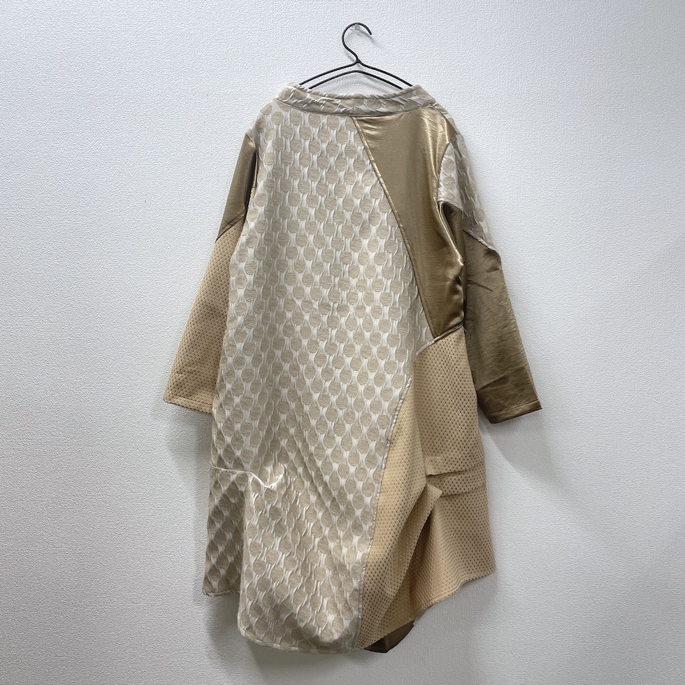 異素材の組み合わせが目を引く、立体的なアシンメトリーワンピース。ドットジャガード、ブロックライン、メタリックサテンなど、表情豊かな素材を巧みに切り替えた一枚です。タックやカーブラインが構築的なフォルムを生み出し、動きのあるシルエットに。洗練されたデザインは、デイリーから特別な日まで幅広く活躍します。