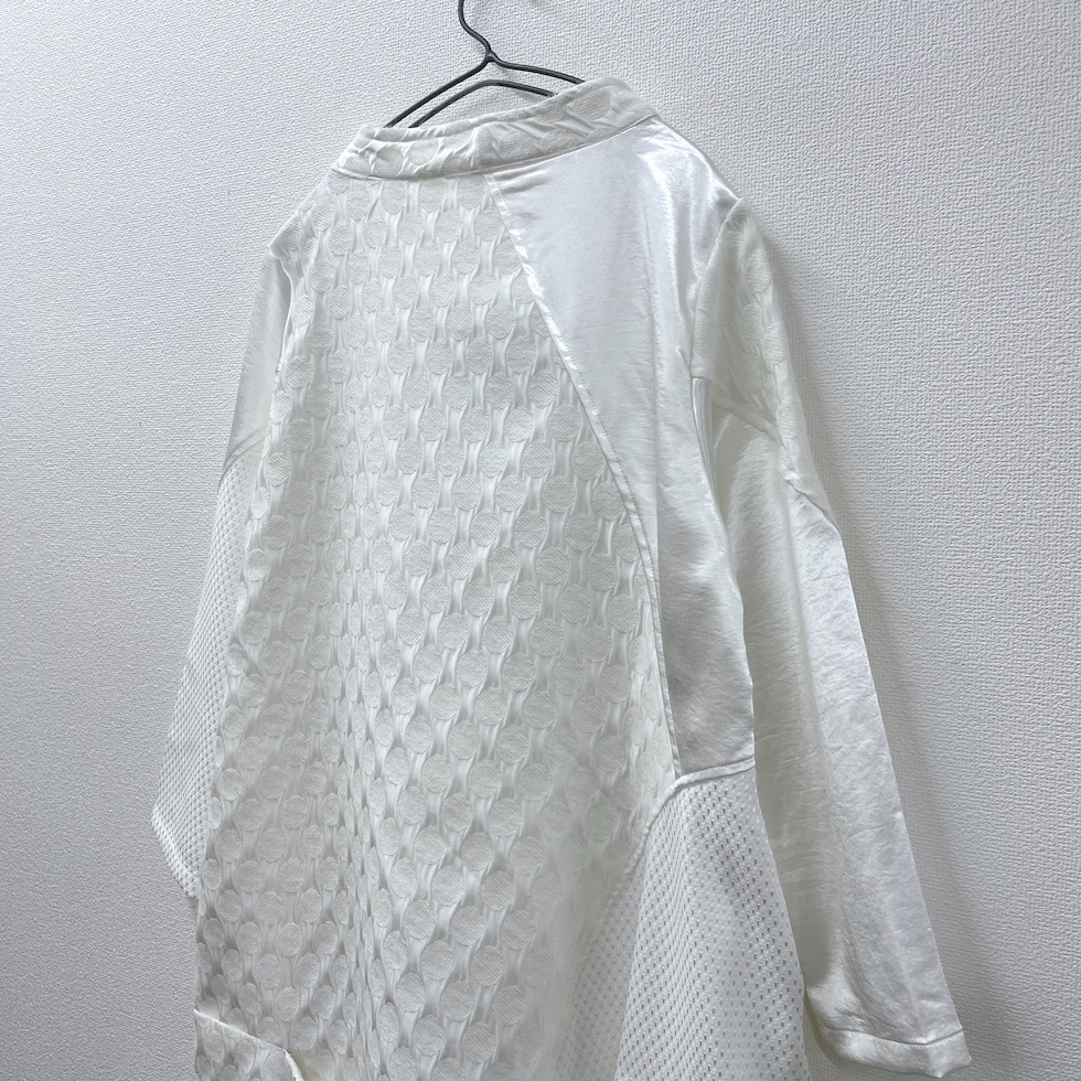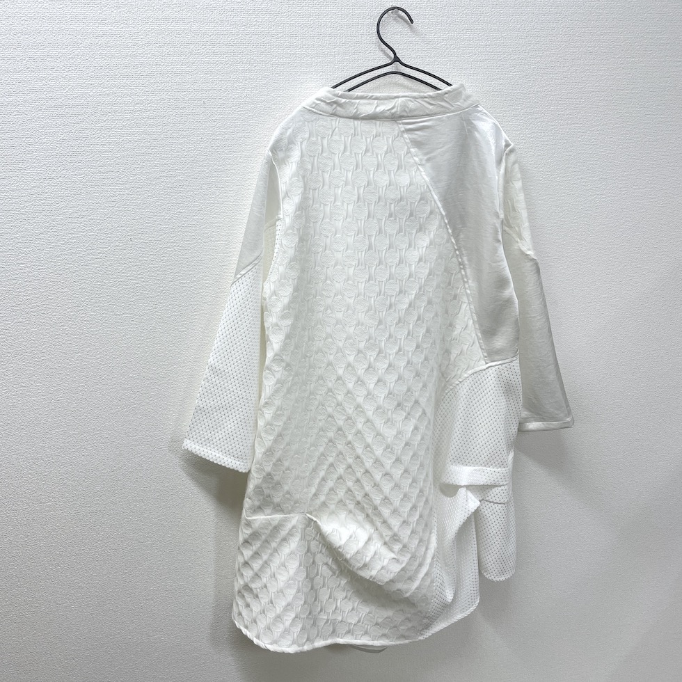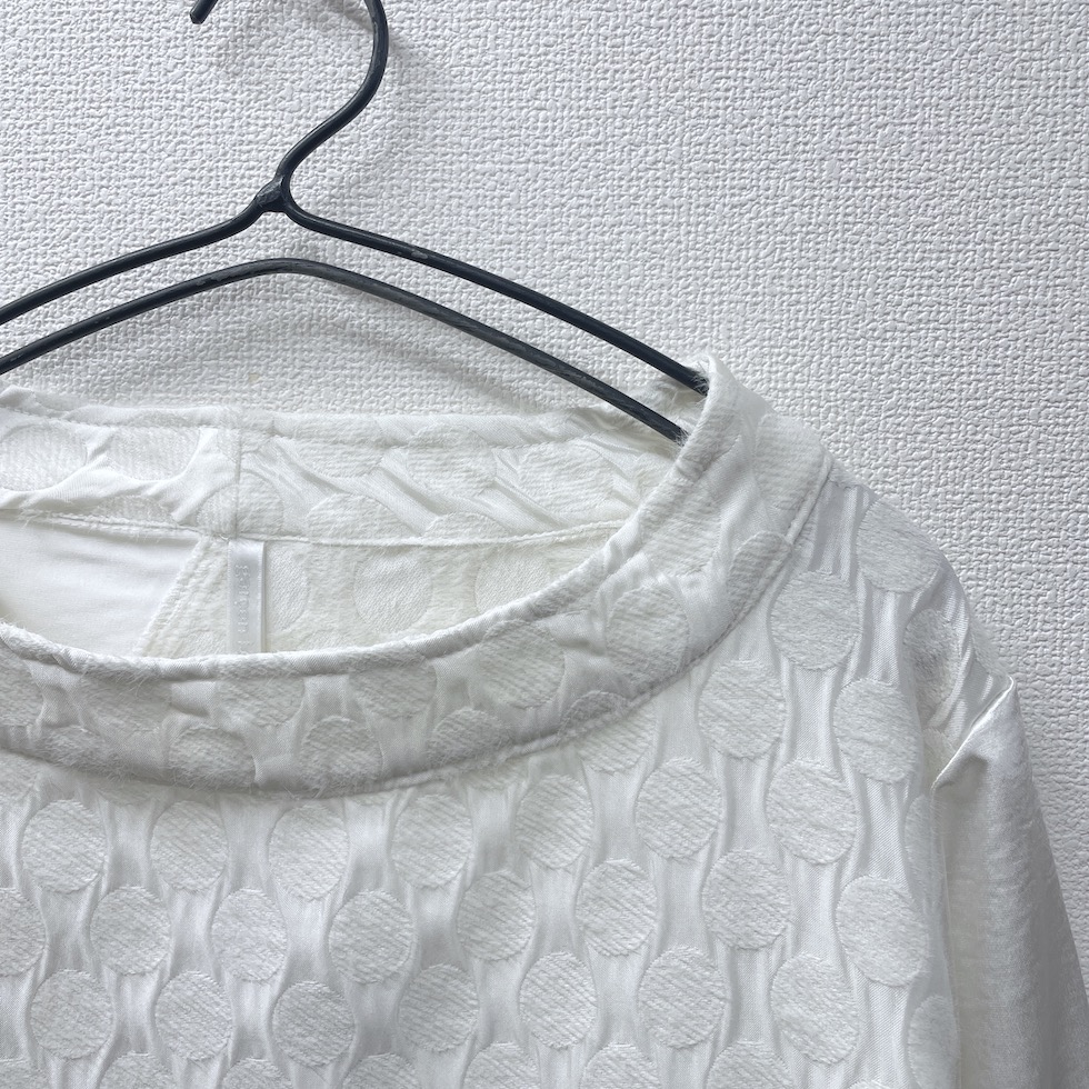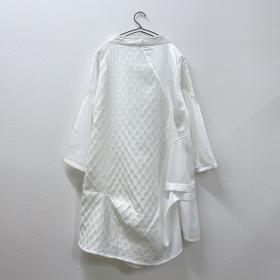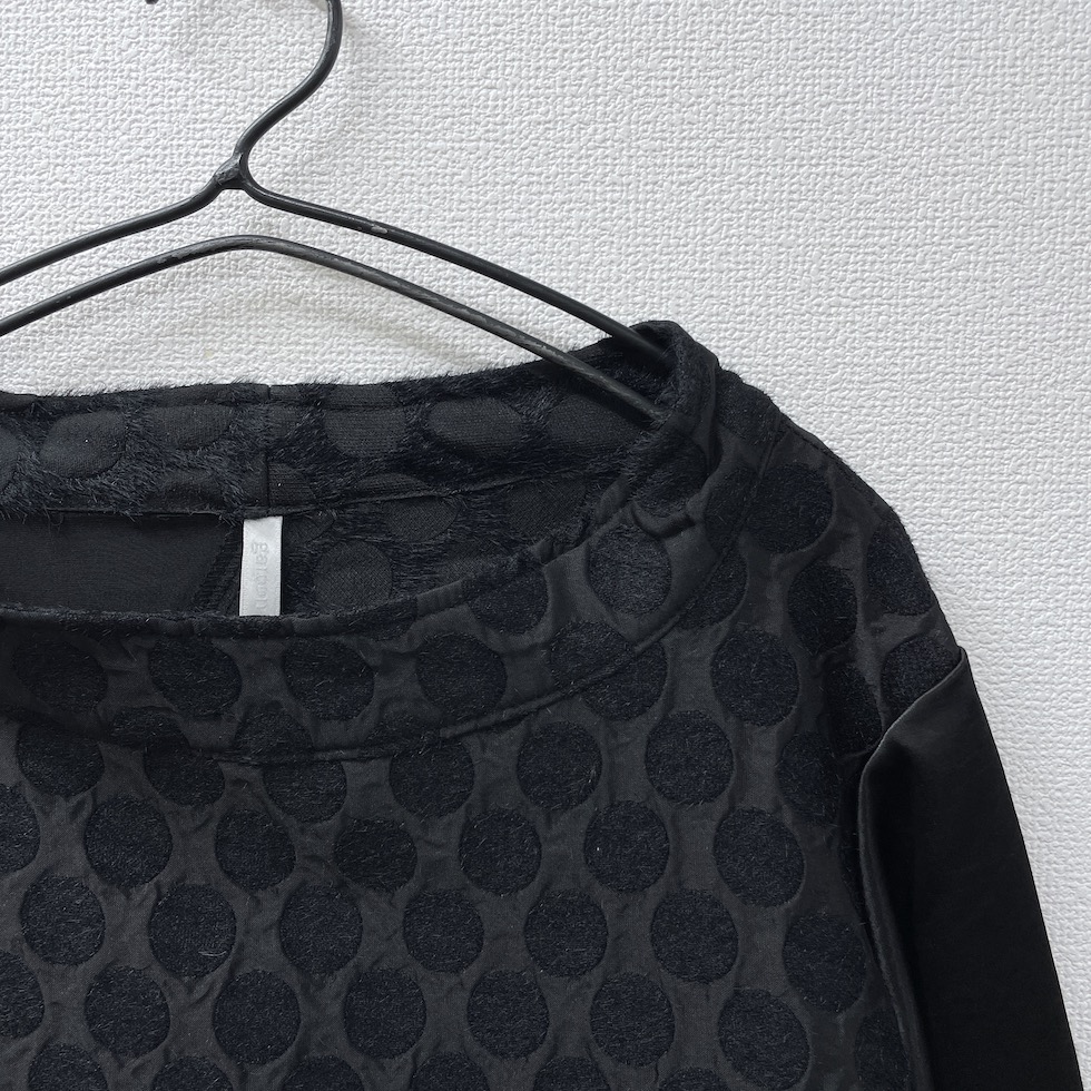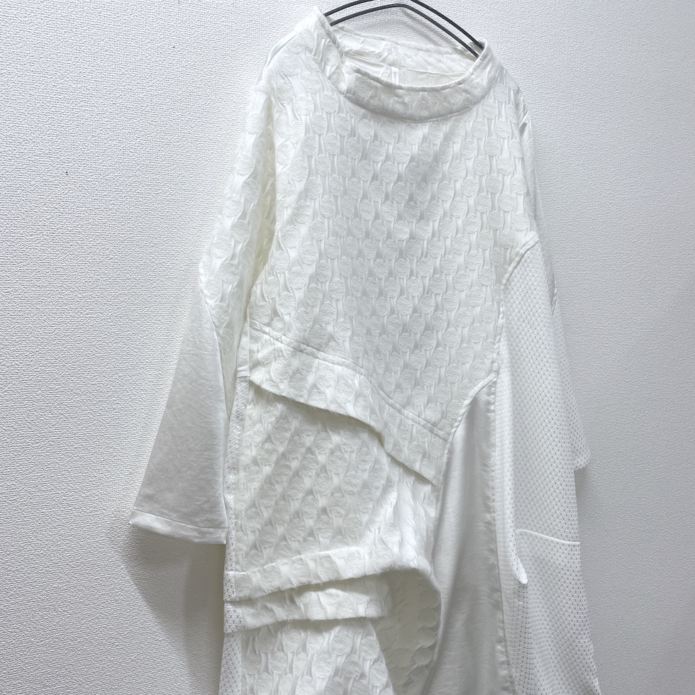 異素材の組み合わせが目を引く、立体的なアシンメトリーワンピース。ドットジャガード、ブロックライン、メタリックサテンなど、表情豊かな素材を巧みに切り替えた一枚です。タックやカーブラインが構築的なフォルムを生み出し、動きのあるシルエットに。洗練されたデザインは、デイリーから特別な日まで幅広く活躍します。