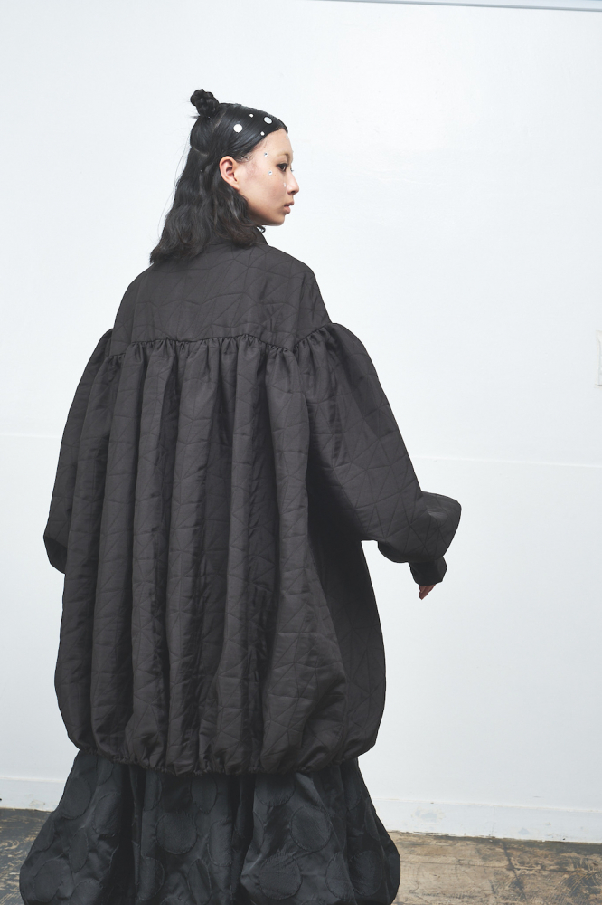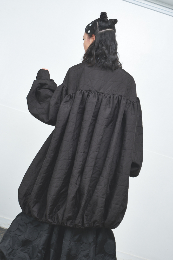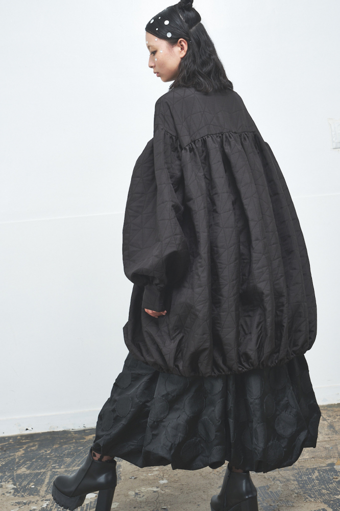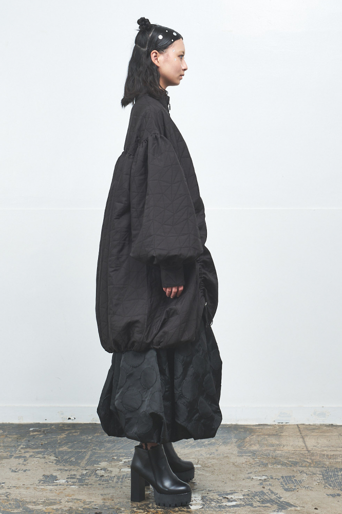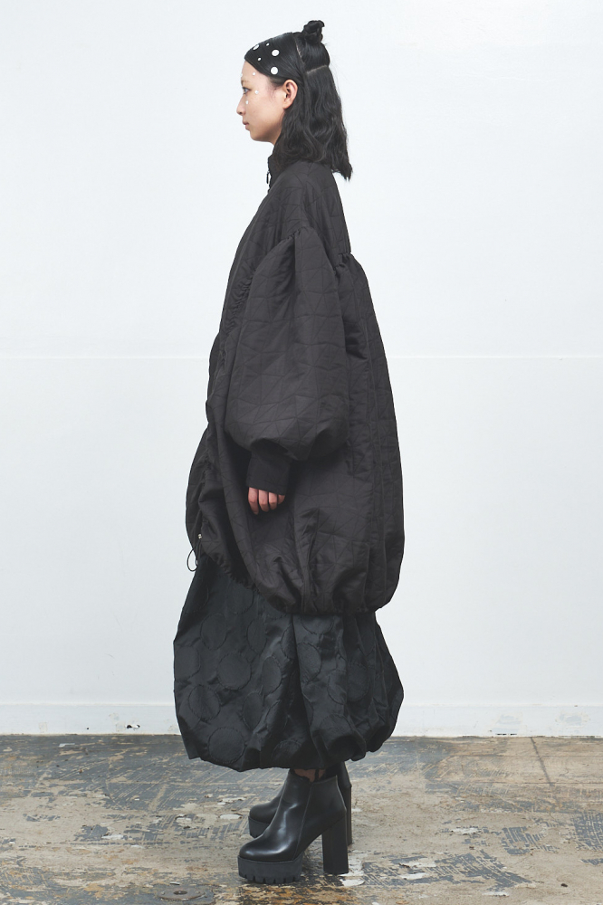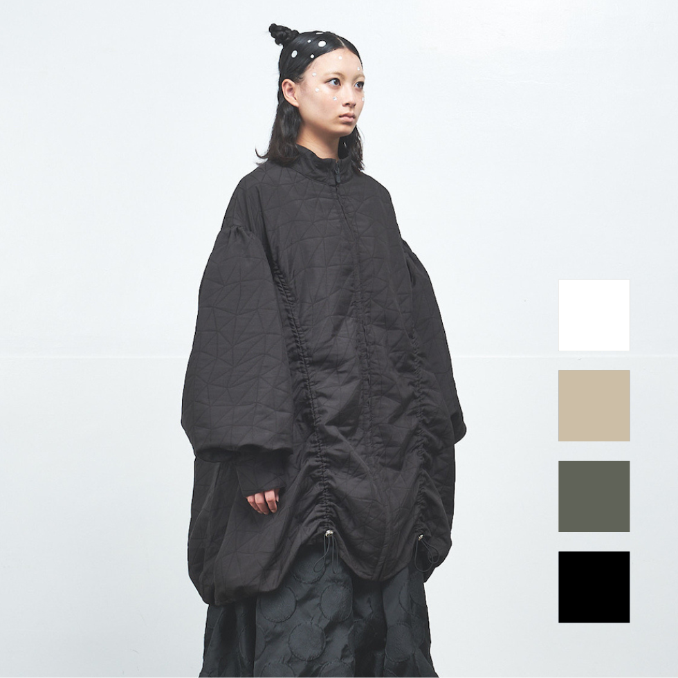 柔らかなキルティング素材で仕立てた、軽やかで着心地の良いバルーンシルエットのワンピースコート。袖と裾に丸みをもたせたフォルムが、やわらかな雰囲気を生み出し、羽織るだけでこなれた印象に。フロントには縦ラインにドロストデザインを施し、絞り具合を自分で調整することでシルエットチェンジが可能。ワンピースとして一枚でも、アウターとしてレイヤードしても活躍する万能アイテム。同系色でまとめてモードに、カジュアルにデニムと合わせても品よくキマる一着です。