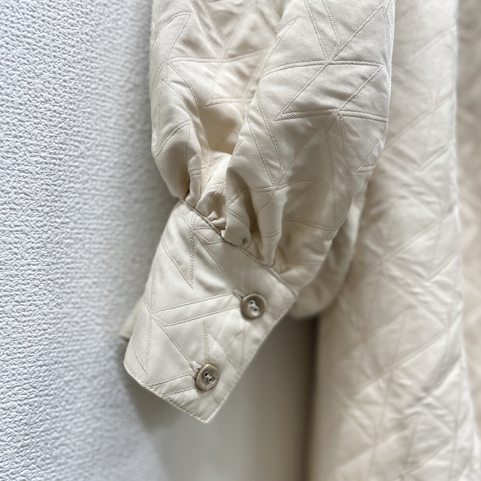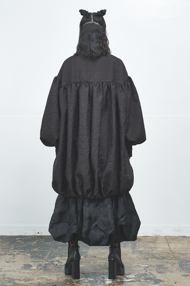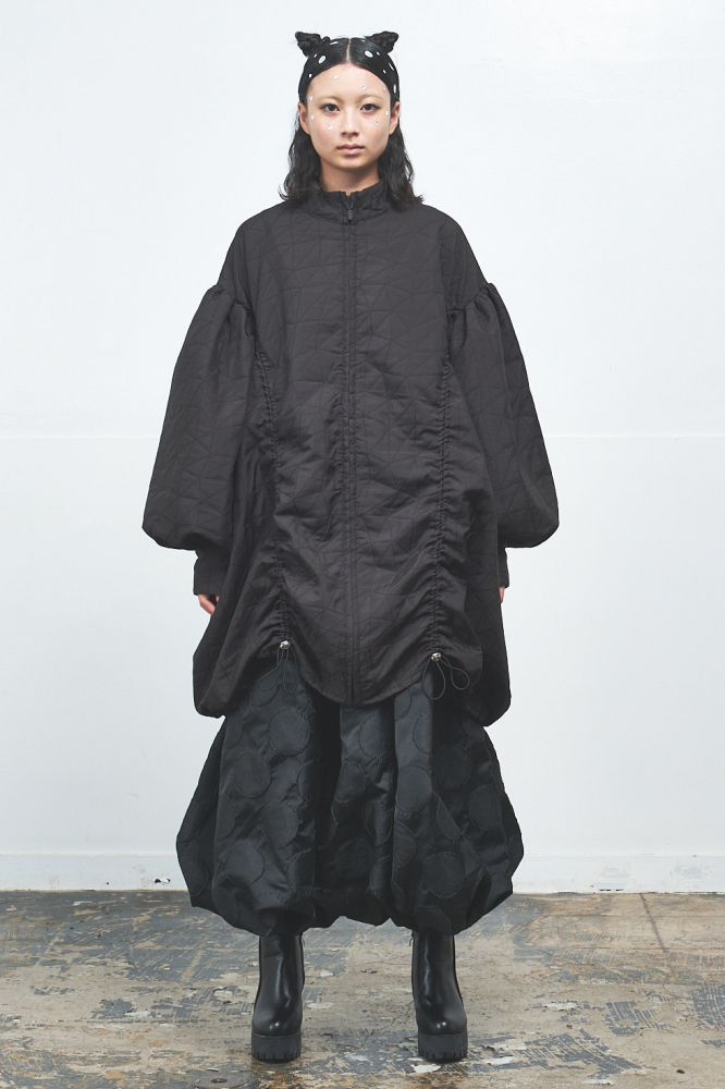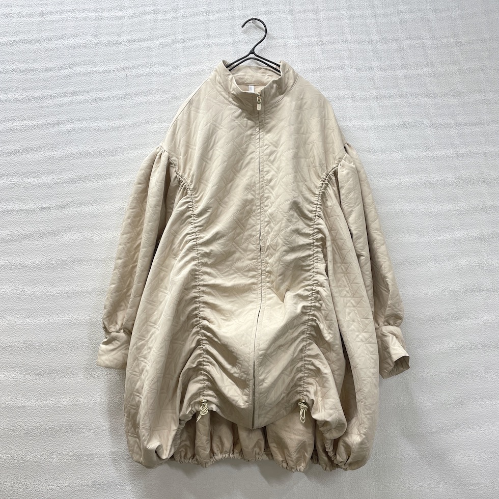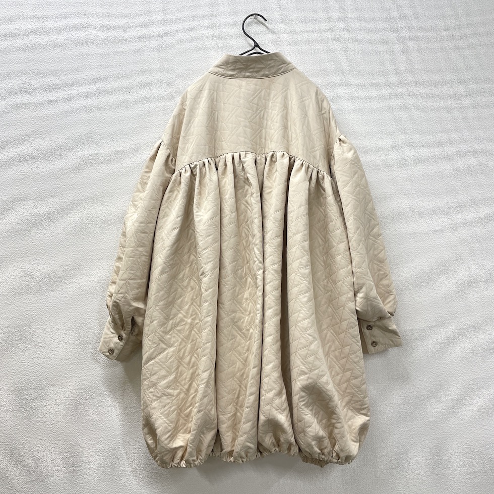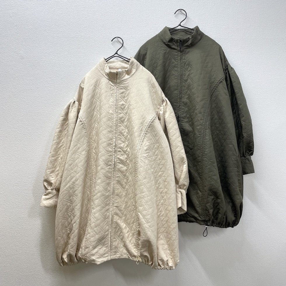 柔らかなキルティング素材で仕立てた、軽やかで着心地の良いバルーンシルエットのワンピースコート。袖と裾に丸みをもたせたフォルムが、やわらかな雰囲気を生み出し、羽織るだけでこなれた印象に。フロントには縦ラインにドロストデザインを施し、絞り具合を自分で調整することでシルエットチェンジが可能。ワンピースとして一枚でも、アウターとしてレイヤードしても活躍する万能アイテム。同系色でまとめてモードに、カジュアルにデニムと合わせても品よくキマる一着です。