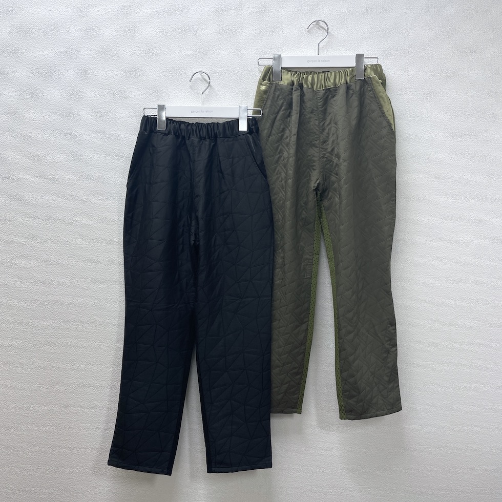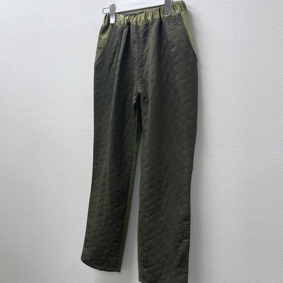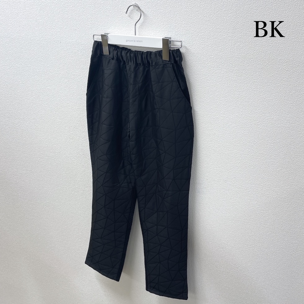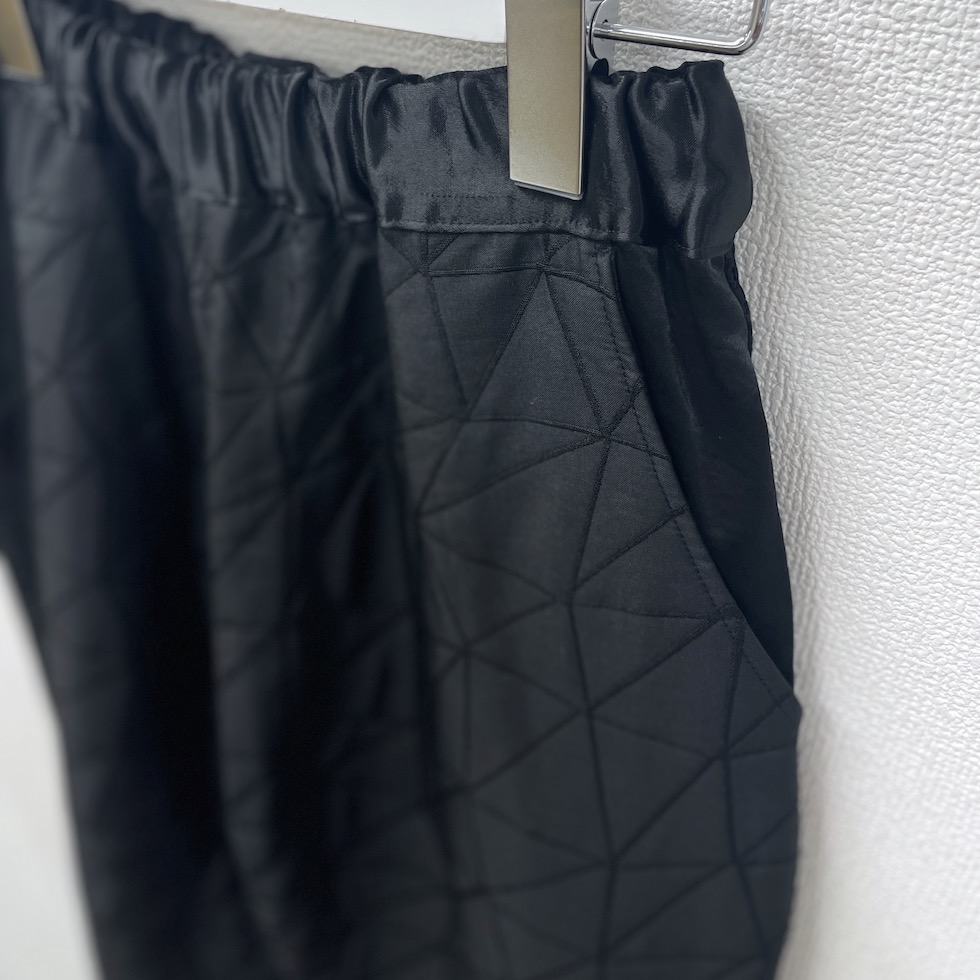 表情のある幾何学キルト素材と、バックスタイルにアクセントを効かせるブロックライン生地を切り替えたテーパードパンツ。異素材のコントラストで、シンプルな中にもひとクセあるモード感を演出します。ウエストは総ゴム仕様でリラックスした履き心地&脇ポケット付きで実用性も◎前後で表情が異なり、カジュアルながらも上品さを忘れない一本。スウェット感覚で取り入れられる、きれいめテーパードです。