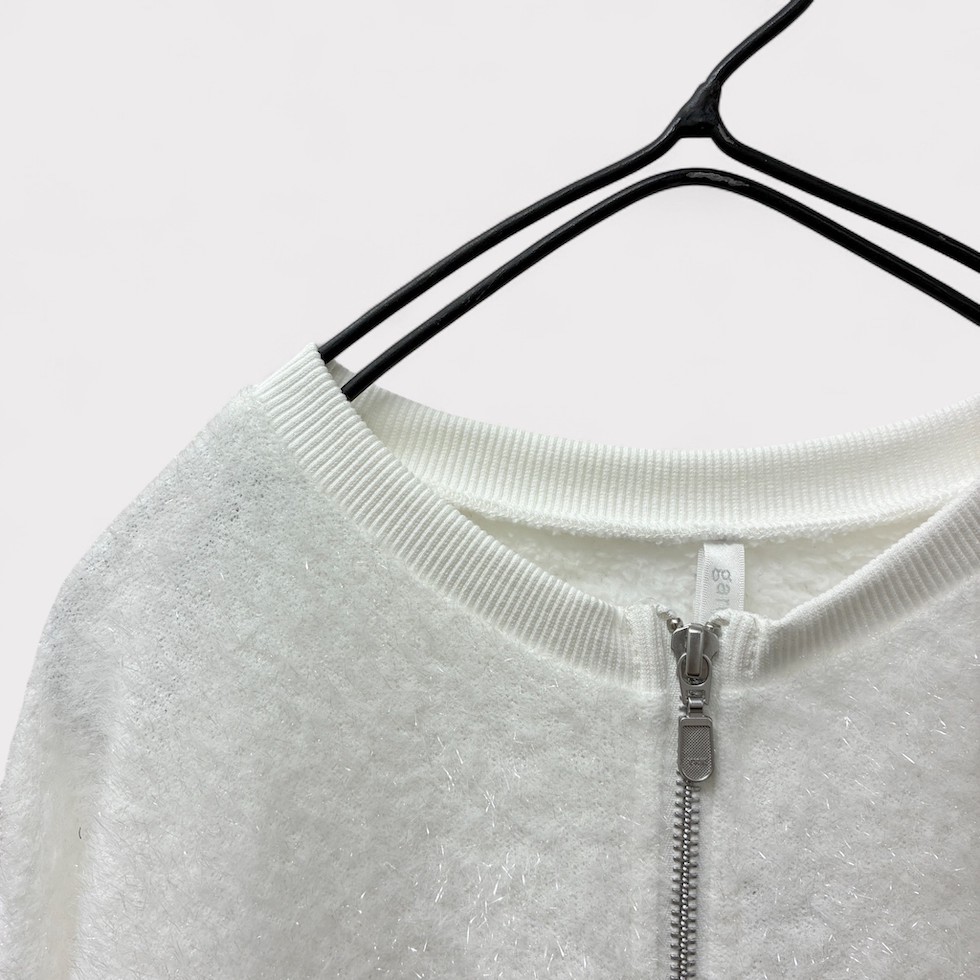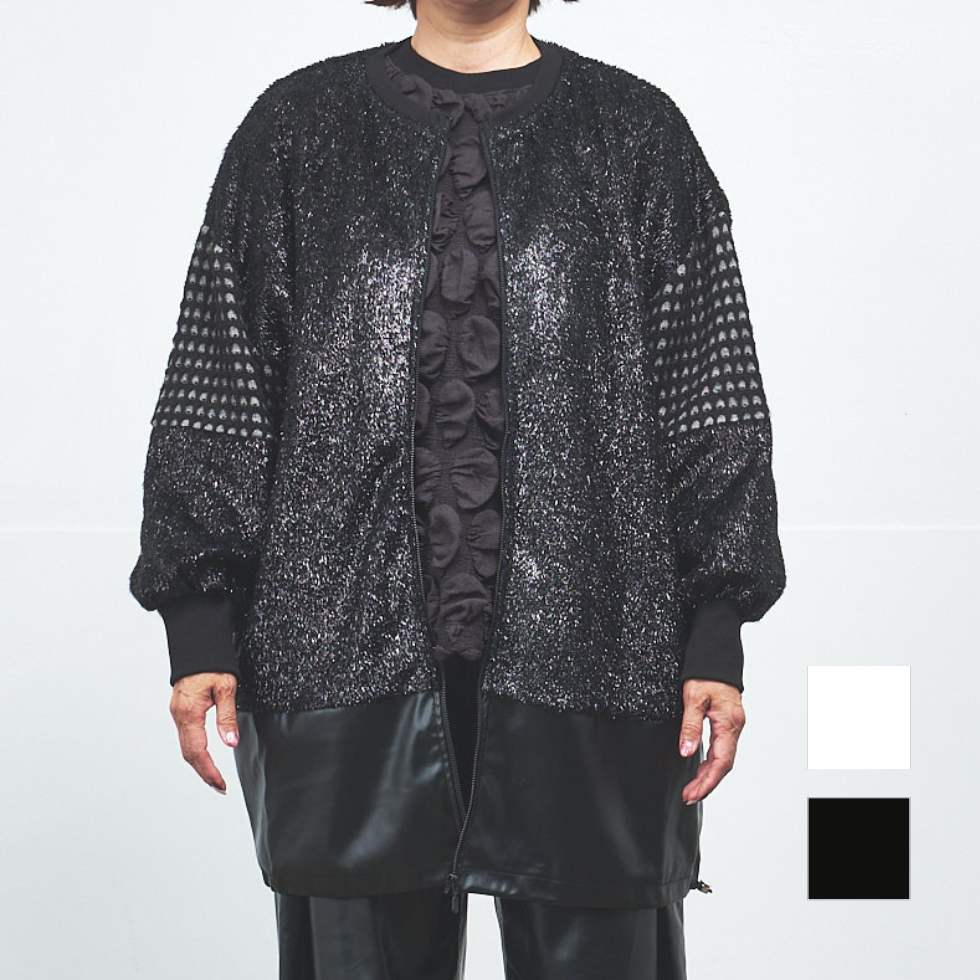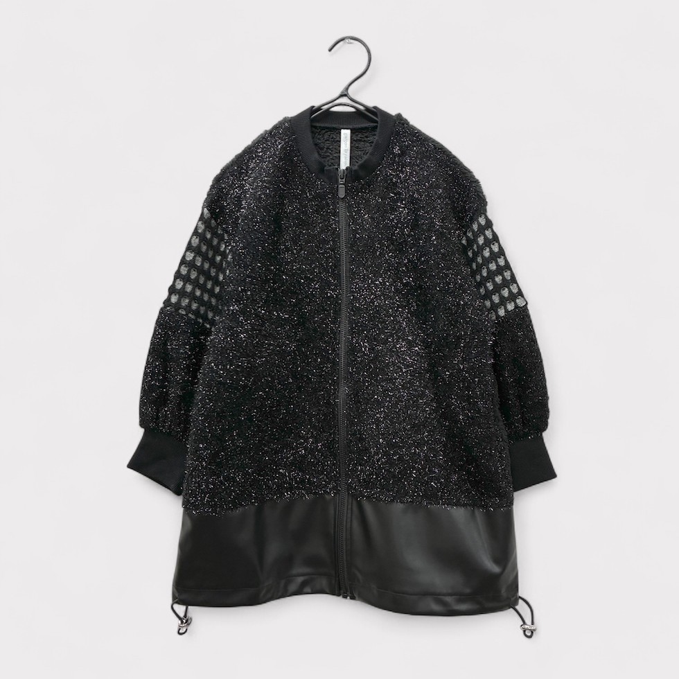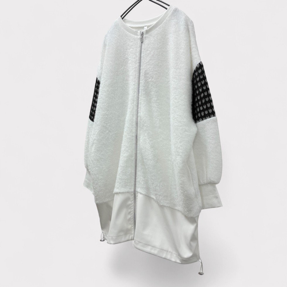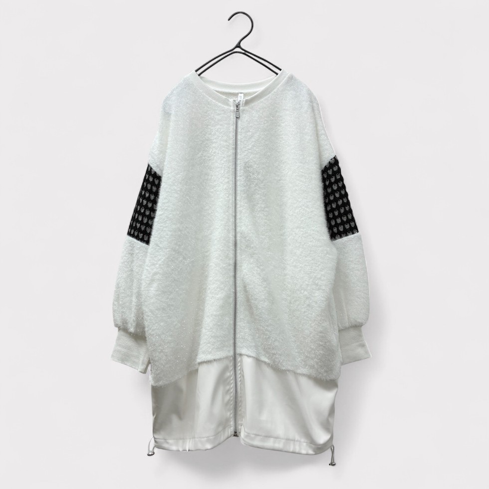 異素材を贅沢に組み合わせた、存在感のあるジップアップコーディガン。ラメ起毛・ボア・格子柄ニット・フェイクレザーが絶妙にミックスされ、一枚でスタイリングが完成する主役級のアイテムです。裾のドロスト仕様でシルエットを調整でき、防寒性もアップ。ユニセックスで楽しめる、秋冬のマストアウターです。