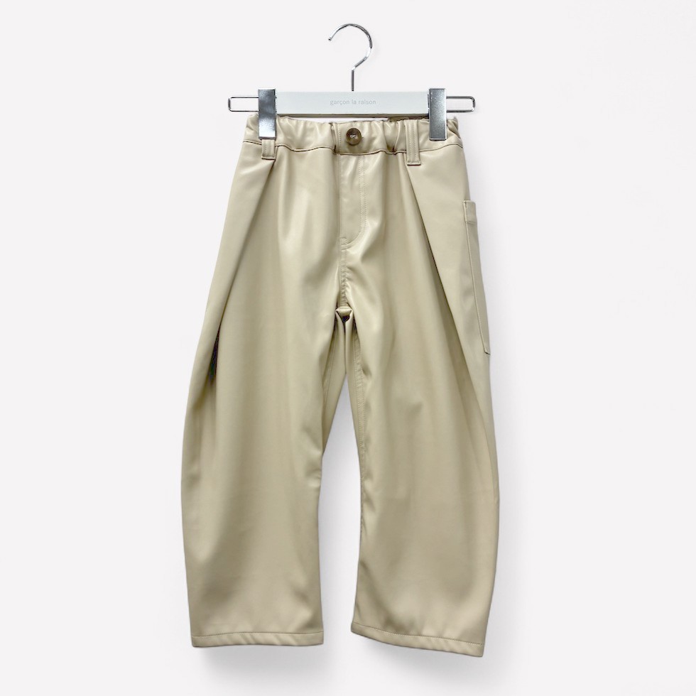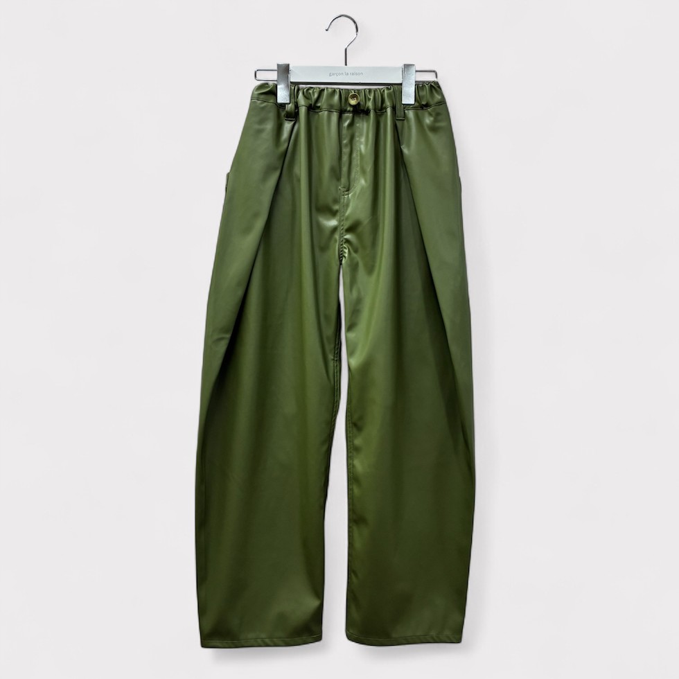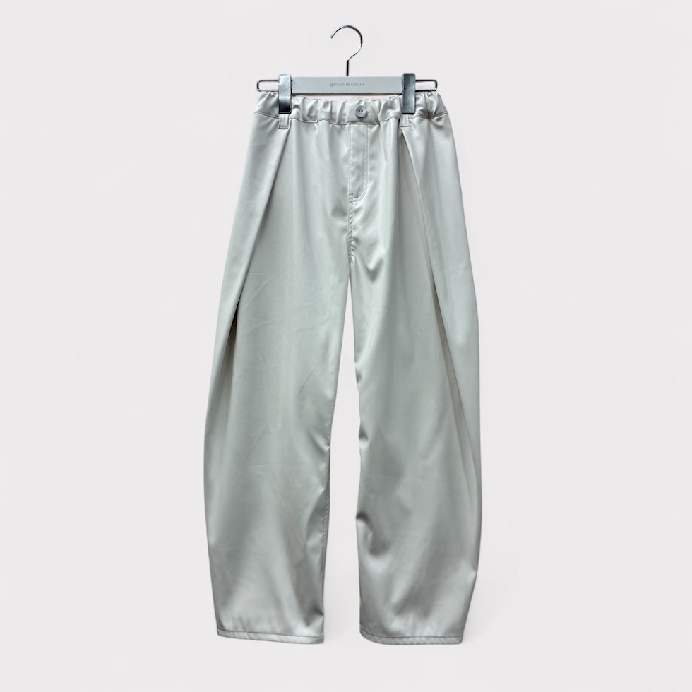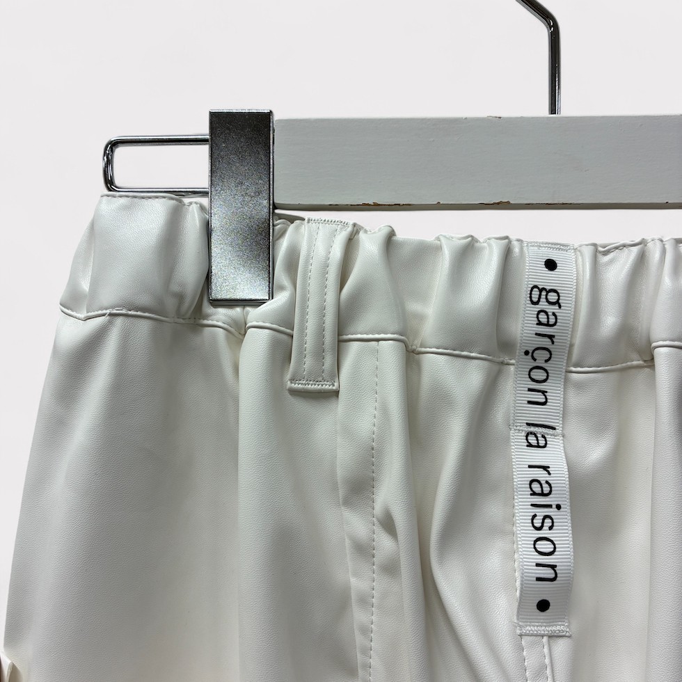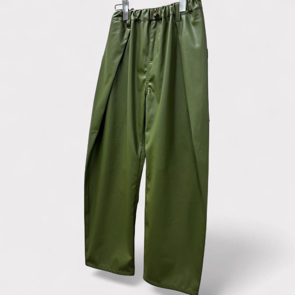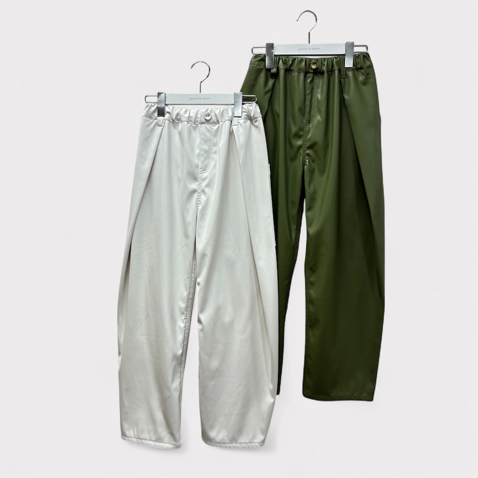 今季注目のフェイクレザーのタックワイドパンツは、取り入れるだけで旬な着こなしが叶うアイテム。ハリ感のある質感と滑らかな表面感がモードな雰囲気を演出します。ソフトな穿き心地も嬉しいポイント◎フロントに入れた深めのタックが立体感を生み出し、リラックス感がありながらも構築的なシルエットに。レザー特有の存在感が、ベーシックなカットソーやニットを合わせるだけでサマになります。同素材のバルーンスリーブジャケットとセットアップでの着用も可能。シャツやベストでモードにまとめるのもアリです♪