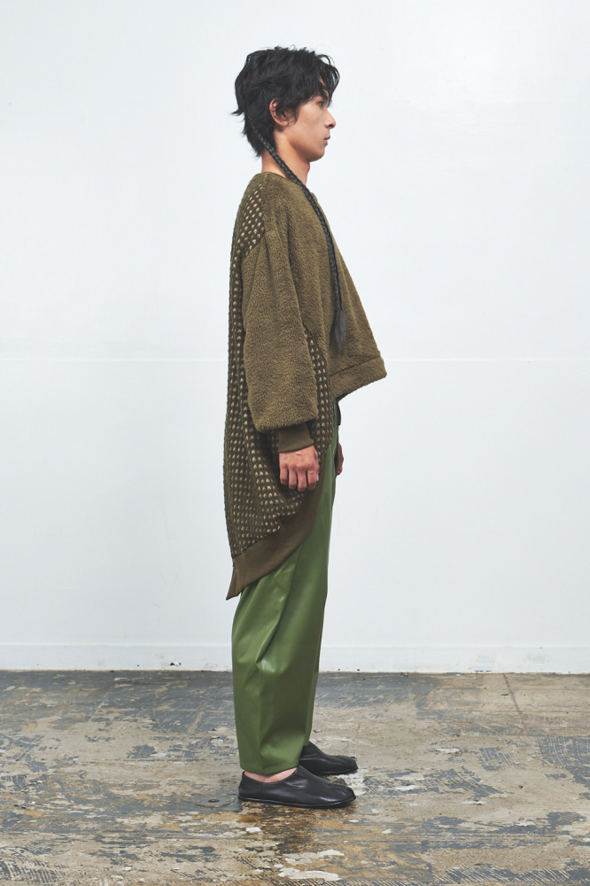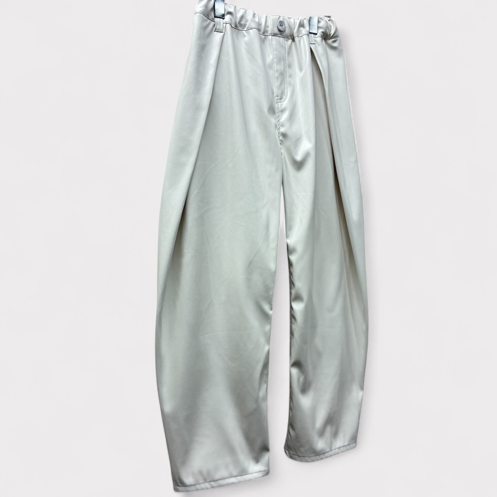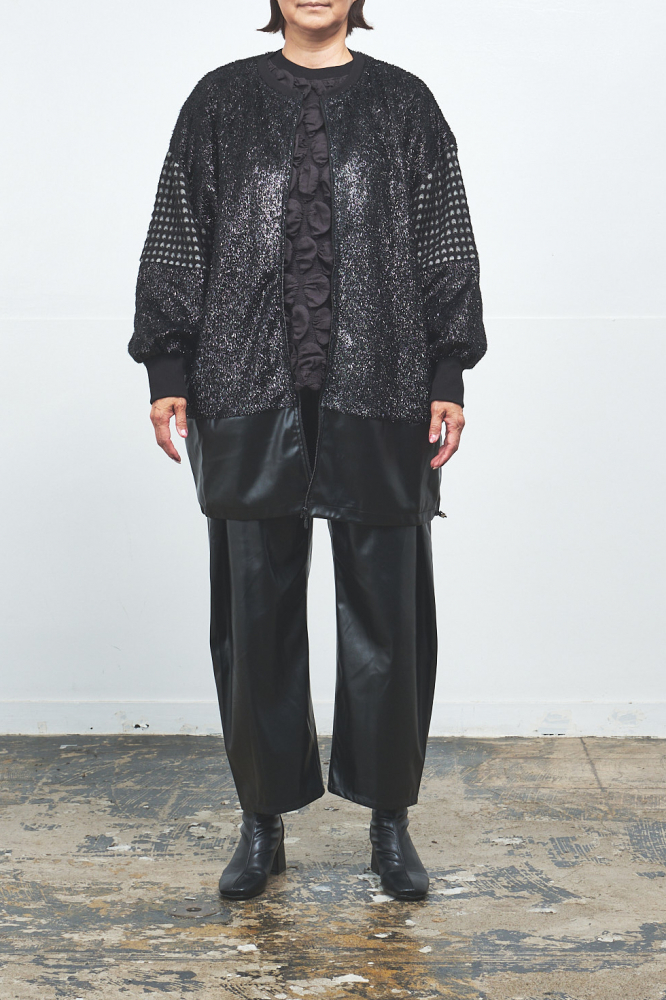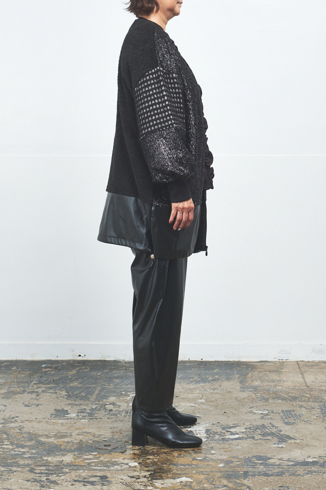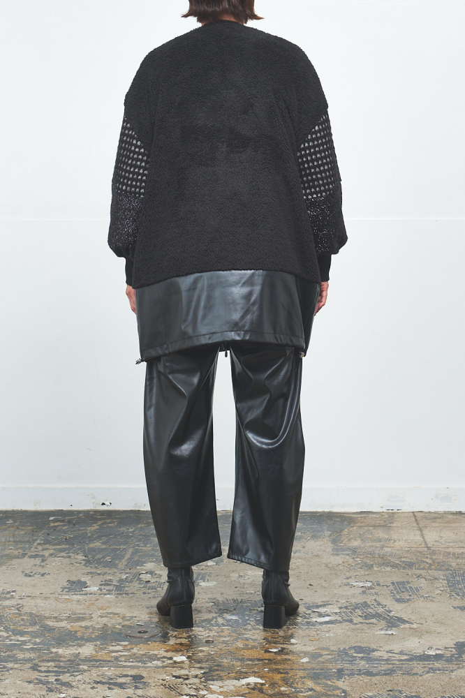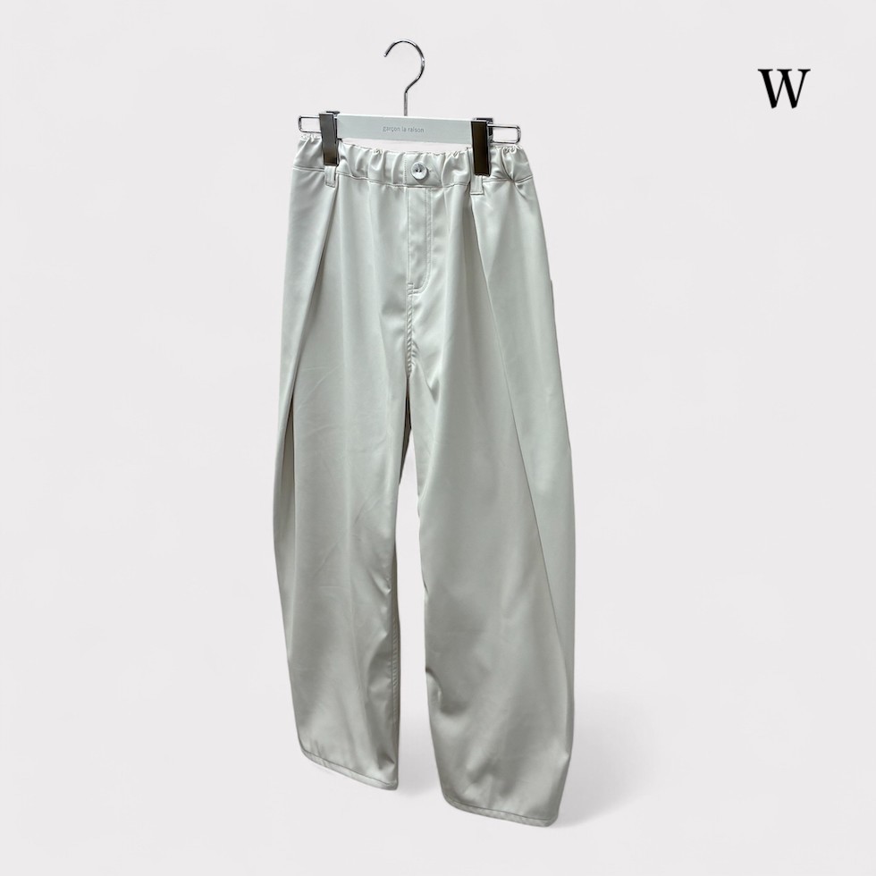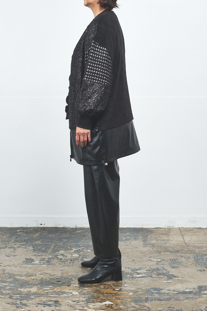 今季注目のフェイクレザーのタックワイドパンツは、取り入れるだけで旬な着こなしが叶うアイテム。ハリ感のある質感と滑らかな表面感がモードな雰囲気を演出します。ソフトな穿き心地も嬉しいポイント◎フロントに入れた深めのタックが立体感を生み出し、リラックス感がありながらも構築的なシルエットに。レザー特有の存在感が、ベーシックなカットソーやニットを合わせるだけでサマになります。同素材のバルーンスリーブジャケットとセットアップでの着用も可能。シャツやベストでモードにまとめるのもアリです♪